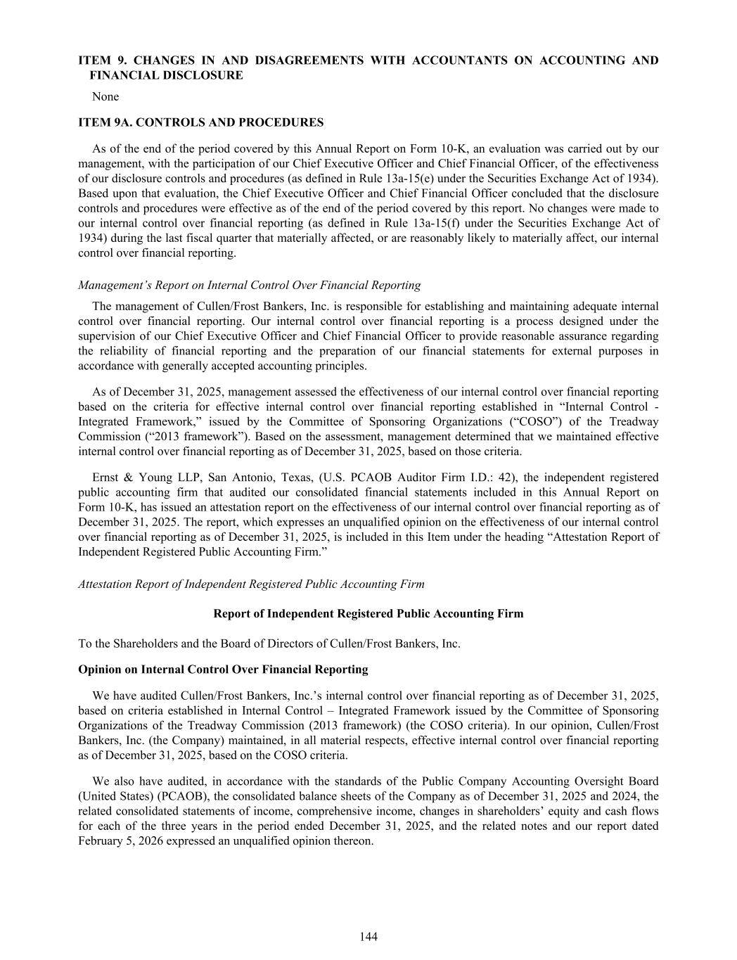 ITEM 9. CHANGES IN AND DISAGREEMENTS WITH ACCOUNTANTS ON ACCOUNTING AND FINANCIAL DISCLOSURE None ITEM 9A. CONTROLS AND PROCEDURES As of the end of the period covered by this Annual Report on Form 10-K, an evaluation was carried out by our management, with the participation of our Chief Executive Officer and Chief Financial Officer, of the effectiveness of our disclosure controls and procedures (as defined in Rule 13a-15(e) under the Securities Exchange Act of 1934). Based upon that evaluation, the Chief Executive Officer and Chief Financial Officer concluded that the disclosure controls and procedures were effective as of the end of the period covered by this report. No changes were made to our internal control over financial reporting (as defined in Rule 13a-15(f) under the Securities Exchange Act of 1934) during the last fiscal quarter that materially affected, or are reasonably likely to materially affect, our internal control over financial reporting. Management’s Report on Internal Control Over Financial Reporting The management of Cullen/Frost Bankers, Inc. is responsible for establishing and maintaining adequate internal control over financial reporting. Our internal control over financial reporting is a process designed under the supervision of our Chief Executive Officer and Chief Financial Officer to provide reasonable assurance regarding the reliability of financial reporting and the preparation of our financial statements for external purposes in accordance with generally accepted accounting principles. As of December 31, 2025, management assessed the effectiveness of our internal control over financial reporting based on the criteria for effective internal control over financial reporting established in “Internal Control - Integrated Framework,” issued by the Committee of Sponsoring Organizations (“COSO”) of the Treadway Commission (“2013 framework”). Based on the assessment, management determined that we maintained effective internal control over financial reporting as of December 31, 2025, based on those criteria. Ernst & Young LLP, San Antonio, Texas, (U.S. PCAOB Auditor Firm I.D.: 42), the independent registered public accounting firm that audited our consolidated financial statements included in this Annual Report on Form 10-K, has issued an attestation report on the effectiveness of our internal control over financial reporting as of December 31, 2025. The report, which expresses an unqualified opinion on the effectiveness of our internal control over financial reporting as of December 31, 2025, is included in this Item under the heading “Attestation Report of Independent Registered Public Accounting Firm.” Attestation Report of Independent Registered Public Accounting Firm Report of Independent Registered Public Accounting Firm To the Shareholders and the Board of Directors of Cullen/Frost Bankers, Inc. Opinion on Internal Control Over Financial Reporting We have audited Cullen/Frost Bankers, Inc.’s internal control over financial reporting as of December 31, 2025, based on criteria established in Internal Control – Integrated Framework issued by the Committee of Sponsoring Organizations of the Treadway Commission (2013 framework) (the COSO criteria). In our opinion, Cullen/Frost Bankers, Inc. (the Company) maintained, in all material respects, effective internal control over financial reporting as of December 31, 2025, based on the COSO criteria. We also have audited, in accordance with the standards of the Public Company Accounting Oversight Board (United States) (PCAOB), the consolidated balance sheets of the Company as of December 31, 2025 and 2024, the related consolidated statements of income, comprehensive income, changes in shareholders’ equity and cash flows for each of the three years in the period ended December 31, 2025, and the related notes and our report dated February 5, 2026 expressed an unqualified opinion thereon. 144