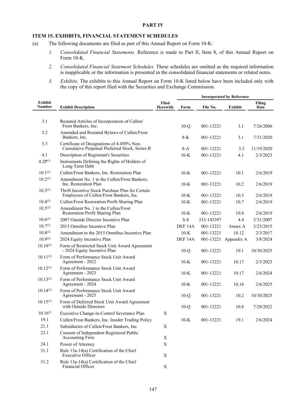 PART IV ITEM 15. EXHIBITS, FINANCIAL STATEMENT SCHEDULES (a) The following documents are filed as part of this Annual Report on Form 10-K: 1. Consolidated Financial Statements. Reference is made to Part II, Item 8, of this Annual Report on Form 10-K. 2. Consolidated Financial Statement Schedules. These schedules are omitted as the required information is inapplicable or the information is presented in the consolidated financial statements or related notes. 3. Exhibits. The exhibits to this Annual Report on Form 10-K listed below have been included only with the copy of this report filed with the Securities and Exchange Commission. 3.1 Restated Articles of Incorporation of Cullen/ Frost Bankers, Inc. 10-Q 001-13221 3.1 7/26/2006 3.2 Amended and Restated Bylaws of Cullen/Frost Bankers, Inc. 8-K 001-13221 3.1 7/31/2020 3.3 Certificate of Designations of 4.450% Non- Cumulative Perpetual Preferred Stock, Series B 8-A 001-13221 3.3 11/19/2020 4.1 Description of Registrant's Securities 10-K 001-13221 4.1 2/3/2023 4.2P(1) Instruments Defining the Rights of Holders of Long-Term Debt 10.1(2) Cullen/Frost Bankers, Inc. Restoration Plan 10-K 001-13221 10.1 2/6/2019 10.2(2) Amendment No. 1 to the Cullen/Frost Bankers, Inc. Restoration Plan 10-K 001-13221 10.2 2/6/2019 10.3(2) Thrift Incentive Stock Purchase Plan for Certain Employees of Cullen/Frost Bankers, Inc. 10-K 001-13221 10.3 2/6/2019 10.4(2) Cullen/Frost Restoration Profit Sharing Plan 10-K 001-13221 10.7 2/6/2019 10.5(2) Amendment No. 1 to the Cullen/Frost Restoration Profit Sharing Plan 10-K 001-13221 10.8 2/6/2019 10.6(2) 2007 Outside Director Incentive Plan S-8 333-143397 4.4 5/31/2007 10.7(2) 2015 Omnibus Incentive Plan DEF 14A 001-13221 Annex A 3/23/2015 10.8(2) Amendment to the 2015 Omnibus Incentive Plan 10-K 001-13221 10.12 2/3/2017 10.9(2) 2024 Equity Incentive Plan DEF 14A 001-13221 Appendix A 3/8/2024 10.10(2) Form of Restricted Stock Unit Award Agreement - 2024 Equity Incentive Plan 10-Q 001-13221 10.1 10/30/2025 10.11(2) Form of Performance Stock Unit Award Agreement - 2022 10-K 001-13221 10.17 2/3/2023 10.12(2) Form of Performance Stock Unit Award Agreement - 2023 10-K 001-13221 10.17 2/6/2024 10.13(2) Form of Performance Stock Unit Award Agreement - 2024 10-K 001-13221 10.16 2/6/2025 10.14(2) Form of Performance Stock Unit Award Agreement - 2025 10-Q 001-13221 10.2 10/30/2025 10.15(2) Form of Deferred Stock Unit Award Agreement with Outside Directors 10-Q 001-13221 10.8 7/28/2022 10.162) Executive Change-in-Control Severance Plan X 19.1 Cullen/Frost Bankers, Inc. Insider Trading Policy 10-K 001-13221 19.1 2/6/2024 21.1 Subsidiaries of Cullen/Frost Bankers, Inc. X 23.1 Consent of Independent Registered Public Accounting Firm X 24.1 Power of Attorney X 31.1 Rule 13a-14(a) Certification of the Chief Executive Officer X 31.2 Rule 13a-14(a) Certification of the Chief Financial Officer X Incorporated by Reference Exhibit Number Exhibit Description Filed Herewith Form File No. Exhibit Filing Date 147