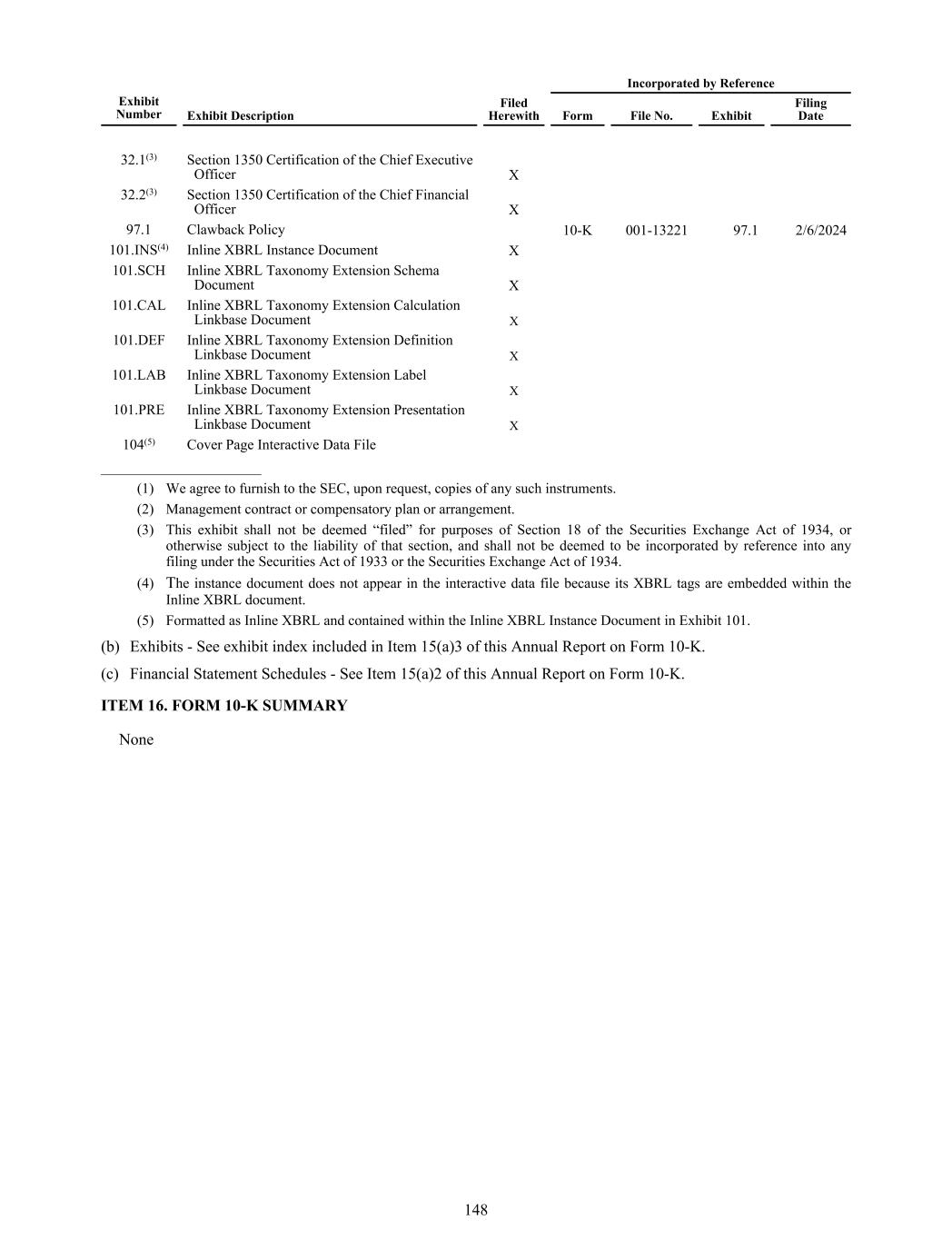 32.1(3) Section 1350 Certification of the Chief Executive Officer X 32.2(3) Section 1350 Certification of the Chief Financial Officer X 97.1 Clawback Policy 10-K 001-13221 97.1 2/6/2024 101.INS(4) Inline XBRL Instance Document X 101.SCH Inline XBRL Taxonomy Extension Schema Document X 101.CAL Inline XBRL Taxonomy Extension Calculation Linkbase Document X 101.DEF Inline XBRL Taxonomy Extension Definition Linkbase Document X 101.LAB Inline XBRL Taxonomy Extension Label Linkbase Document X 101.PRE Inline XBRL Taxonomy Extension Presentation Linkbase Document X 104(5) Cover Page Interactive Data File Incorporated by Reference Exhibit Number Exhibit Description Filed Herewith Form File No. Exhibit Filing Date _________________________ (1) We agree to furnish to the SEC, upon request, copies of any such instruments. (2) Management contract or compensatory plan or arrangement. (3) This exhibit shall not be deemed “filed” for purposes of Section 18 of the Securities Exchange Act of 1934, or otherwise subject to the liability of that section, and shall not be deemed to be incorporated by reference into any filing under the Securities Act of 1933 or the Securities Exchange Act of 1934. (4) The instance document does not appear in the interactive data file because its XBRL tags are embedded within the Inline XBRL document. (5) Formatted as Inline XBRL and contained within the Inline XBRL Instance Document in Exhibit 101. (b) Exhibits - See exhibit index included in Item 15(a)3 of this Annual Report on Form 10-K. (c) Financial Statement Schedules - See Item 15(a)2 of this Annual Report on Form 10-K. ITEM 16. FORM 10-K SUMMARY None 148