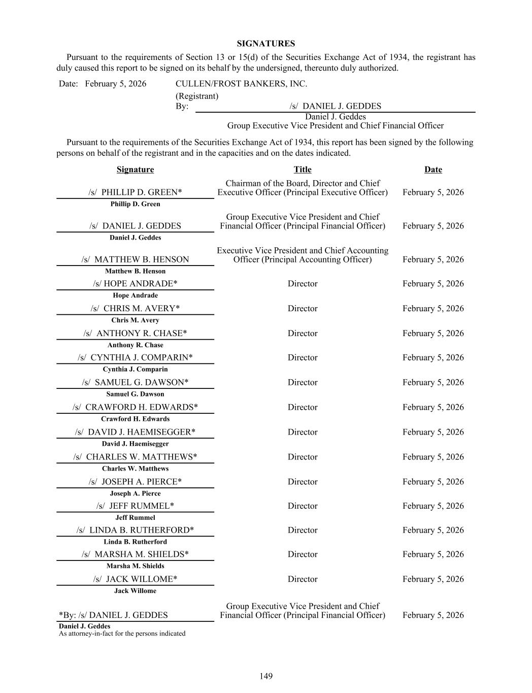 SIGNATURES Pursuant to the requirements of Section 13 or 15(d) of the Securities Exchange Act of 1934, the registrant has duly caused this report to be signed on its behalf by the undersigned, thereunto duly authorized. Date: February 5, 2026 CULLEN/FROST BANKERS, INC. (Registrant) By: /s/ DANIEL J. GEDDES Daniel J. Geddes Group Executive Vice President and Chief Financial Officer Pursuant to the requirements of the Securities Exchange Act of 1934, this report has been signed by the following persons on behalf of the registrant and in the capacities and on the dates indicated. Signature Title Date /s/ PHILLIP D. GREEN* Chairman of the Board, Director and Chief Executive Officer (Principal Executive Officer) February 5, 2026 Phillip D. Green /s/ DANIEL J. GEDDES Group Executive Vice President and Chief Financial Officer (Principal Financial Officer) February 5, 2026 Daniel J. Geddes /s/ MATTHEW B. HENSON Executive Vice President and Chief Accounting Officer (Principal Accounting Officer) February 5, 2026 Matthew B. Henson /s/ HOPE ANDRADE* Director February 5, 2026 Hope Andrade /s/ CHRIS M. AVERY* Director February 5, 2026 Chris M. Avery /s/ ANTHONY R. CHASE* Director February 5, 2026 Anthony R. Chase /s/ CYNTHIA J. COMPARIN* Director February 5, 2026 Cynthia J. Comparin /s/ SAMUEL G. DAWSON* Director February 5, 2026 Samuel G. Dawson /s/ CRAWFORD H. EDWARDS* Director February 5, 2026 Crawford H. Edwards /s/ DAVID J. HAEMISEGGER* Director February 5, 2026 David J. Haemisegger /s/ CHARLES W. MATTHEWS* Director February 5, 2026 Charles W. Matthews /s/ JOSEPH A. PIERCE* Director February 5, 2026 Joseph A. Pierce /s/ JEFF RUMMEL* Director February 5, 2026 Jeff Rummel /s/ LINDA B. RUTHERFORD* Director February 5, 2026 Linda B. Rutherford /s/ MARSHA M. SHIELDS* Director February 5, 2026 Marsha M. Shields /s/ JACK WILLOME* Director February 5, 2026 Jack Willome *By: /s/ DANIEL J. GEDDES Group Executive Vice President and Chief Financial Officer (Principal Financial Officer) February 5, 2026 Daniel J. Geddes As attorney-in-fact for the persons indicated 149
