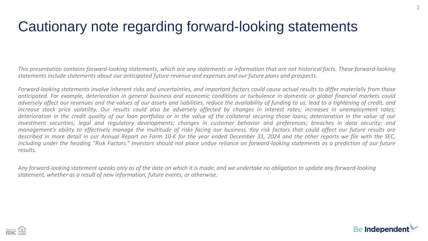 Cautionary note regarding forward-looking statements This presentation contains forward-looking statements, which are any statements or information that are not historical facts. These forward-looking statements include statements about our anticipated future revenue and expenses and our future plans and prospects. Forward-looking statements involve inherent risks and uncertainties, and important factors could cause actual results to differ materially from those anticipated. For example, deterioration in general business and economic conditions or turbulence in domestic or global financial markets could adversely affect our revenues and the values of our assets and liabilities, reduce the availability of funding to us, lead to a tightening of credit, and increase stock price volatility. Our results could also be adversely affected by changes in interest rates; increases in unemployment rates; deterioration in the credit quality of our loan portfolios or in the value of the collateral securing those loans; deterioration in the value of our investment securities; legal and regulatory developments; changes in customer behavior and preferences; breaches in data security; and management’s ability to effectively manage the multitude of risks facing our business. Key risk factors that could affect our future results are described in more detail in our Annual Report on Form 10-K for the year ended December 31, 2024 and the other reports we file with the SEC, including under the heading “Risk Factors.” Investors should not place undue reliance on forward-looking statements as a prediction of our future results. Any forward-looking statement speaks only as of the date on which it is made, and we undertake no obligation to update any forward-looking statement, whether as a result of new information, future events, or otherwise. 2 2