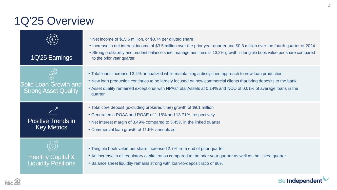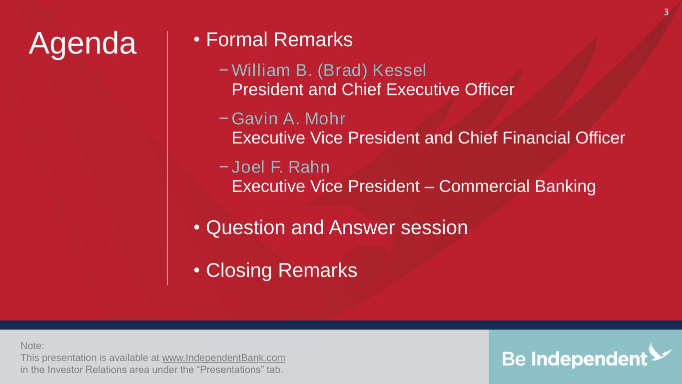• Formal Remarks − William B. (Brad) Kessel President and Chief Executive Officer − Gavin A. Mohr Executive Vice President and Chief Financial Officer − Joel F. Rahn Executive Vice President – Commercial Banking • Question and Answer session • Closing Remarks Note: This presentation is available at www.IndependentBank.com in the Investor Relations area under the “Presentations” tab. Agenda 3