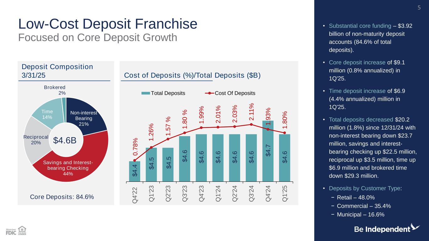 1Q'25 Overview • Total loans increased 3.4% annualized while maintaining a disciplined approach to new loan production • New loan production continues to be largely focused on new commercial clients that bring deposits to the bank • Asset quality remained exceptional with NPAs/Total Assets at 0.14% and NCO of 0.01% of average loans in the quarter • Total core deposit (excluding brokered time) growth of $9.1 million • Generated a ROAA and ROAE of 1.18% and 13.71%, respectively • Net interest margin of 3.49% compared to 3.45% in the linked quarter • Commercial loan growth of 11.5% annualized • Tangible book value per share increased 2.7% from end of prior quarter • An increase in all regulatory capital ratios compared to the prior year quarter as well as the linked quarter • Balance sheet liquidity remains strong with loan-to-deposit ratio of 88% • Net income of $15.6 million, or $0.74 per diluted share • Increase in net interest income of $3.5 million over the prior year quarter and $0.8 million over the fourth quarter of 2024 • Strong profitability and prudent balance sheet management results 13.2% growth in tangible book value per share compared to the prior year quarter. Healthy Capital & Liquidity Positions Positive Trends in Key Metrics Solid Loan Growth and Strong Asset Quality 1Q'25 Earnings 4 4