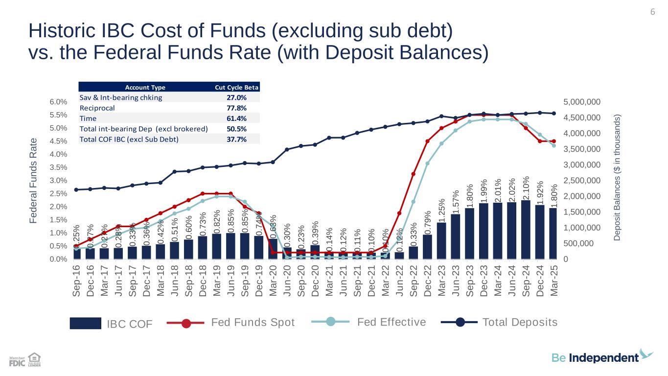 0 .2 5 % 0 .2 7 % 0 .2 7 % 0 .2 8 % 0 .3 3 % 0 .3 6 % 0 .4 2 % 0 .5 1 % 0 .6 0 % 0 .7 3 % 0 .8 2 % 0 .8 5 % 0 .8 5 % 0 .7 4 % 0 .6 3 % 0 .3 0 % 0 .2 3 % 0 .3 9 % 0 .1 4 % 0 .1 2 % 0 .1 1 % 0 .1 0 % 0 .1 0 % 0 .1 2 % 0 .3 3 % 0 .7 9 % 1 .2 5 % 1 .5 7 % 1 .8 0 % 1 .9 9 % 2 .0 1 % 2 .0 2 % 2 .1 0 % 1 .9 2 % 1 .8 0 % 0 500,000 1,000,000 1,500,000 2,000,000 2,500,000 3,000,000 3,500,000 4,000,000 4,500,000 5,000,000 0.0% 0.5% 1.0% 1.5% 2.0% 2.5% 3.0% 3.5% 4.0% 4.5% 5.0% 5.5% 6.0% S e p -1 6 D e c -1 6 M a r- 1 7 J u n -1 7 S e p -1 7 D e c -1 7 M a r- 1 8 J u n -1 8 S e p -1 8 D e c -1 8 M a r- 1 9 J u n -1 9 S e p -1 9 D e c -1 9 M a r- 2 0 J u n -2 0 S e p -2 0 D e c -2 0 M a r- 2 1 J u n -2 1 S e p -2 1 D e c -2 1 M a r- 2 2 J u n -2 2 S e p -2 2 D e c -2 2 M a r- 2 3 J u n -2 3 S e p -2 3 D e c -2 3 M a r- 2 4 J u n -2 4 S e p -2 4 D e c -2 4 M a r- 2 5 Historic IBC Cost of Funds (excluding sub debt) vs. the Federal Funds Rate (with Deposit Balances) D e p o s it B a la n c e s ( $ i n t h o u s a n d s ) 6 F e d e ra l F u n d s R a te Account Type Cut Cycle Beta Sav & Int-bearing chking 27.0% Reciprocal 77.8% Time 61.4% Total int-bearing Dep (excl brokered) 50.5% Total COF IBC (excl Sub Debt) 37.7% IBC COF Fed Funds Spot Fed Effective Total Deposits