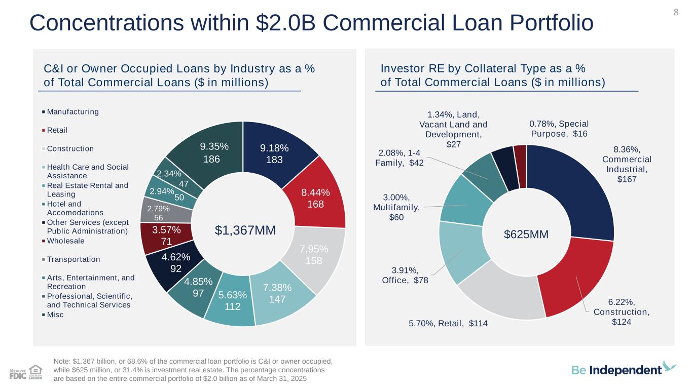 $ 3 .4 $ 3 .5 $ 3 .6 $ 3 .7 $ 3 .8 $ 3 .8 $ 3 .9 $ 3 .9 $ 4 .0 $ 4 .1 4 .9 0 % 5 .0 7 % 5 .3 6 % 5 .5 3 % 5 .7 3 % 5 .8 0 % 5 .9 3 % 5 .9 6 % 5 .8 3 % 5 .7 4 % 4 Q '2 2 1 Q '2 3 2 Q '2 3 3 Q '2 3 4 Q '2 3 1 Q '2 4 2 Q '2 4 3 Q '2 4 4 Q '2 4 1 Q '2 5 Total Portfolio Loans Yield on Loans Commercial 49% Mortgage 37% Installment 14% Held for Sale 0% Diversified Loan Portfolio Focused on High Quality Growth • Portfolio loan changes in 1Q'25: − Commercial – increased $54.8 million. …Average new origination yield of 6.97% vs a 6.55% portfolio yield. − Mortgage – decreased $3.9 million. …Average new origination yield of 7.02% vs a 4.85% portfolio yield. − Installment – decreased $17.0 million. …Average new origination yield of 7.52% vs a 5.03% portfolio yield. • Mortgage loan portfolio weighted average FICO of 751 and average balance of $186,239. • Installment weighted average FICO of 755 and average balance of $25,390. • Commercial loan rate mix: − 42% fixed / 58% variable. − Indices – 40% tied to Prime, 1% tied to a US Treasury rate and 59% tied to SOFR. • Mortgage loan (including HELOC) rate mix: − 62% fixed / 38% adjustable or variable. − 9% tied to a US Treasury rate and 91% tied to SOFR. Note: Portfolio loans exclude loans HFS. Loan Composition 03/31/25 Yield on Loans (%)/ Total Portfolio Loans ($B) 7 $4.1B