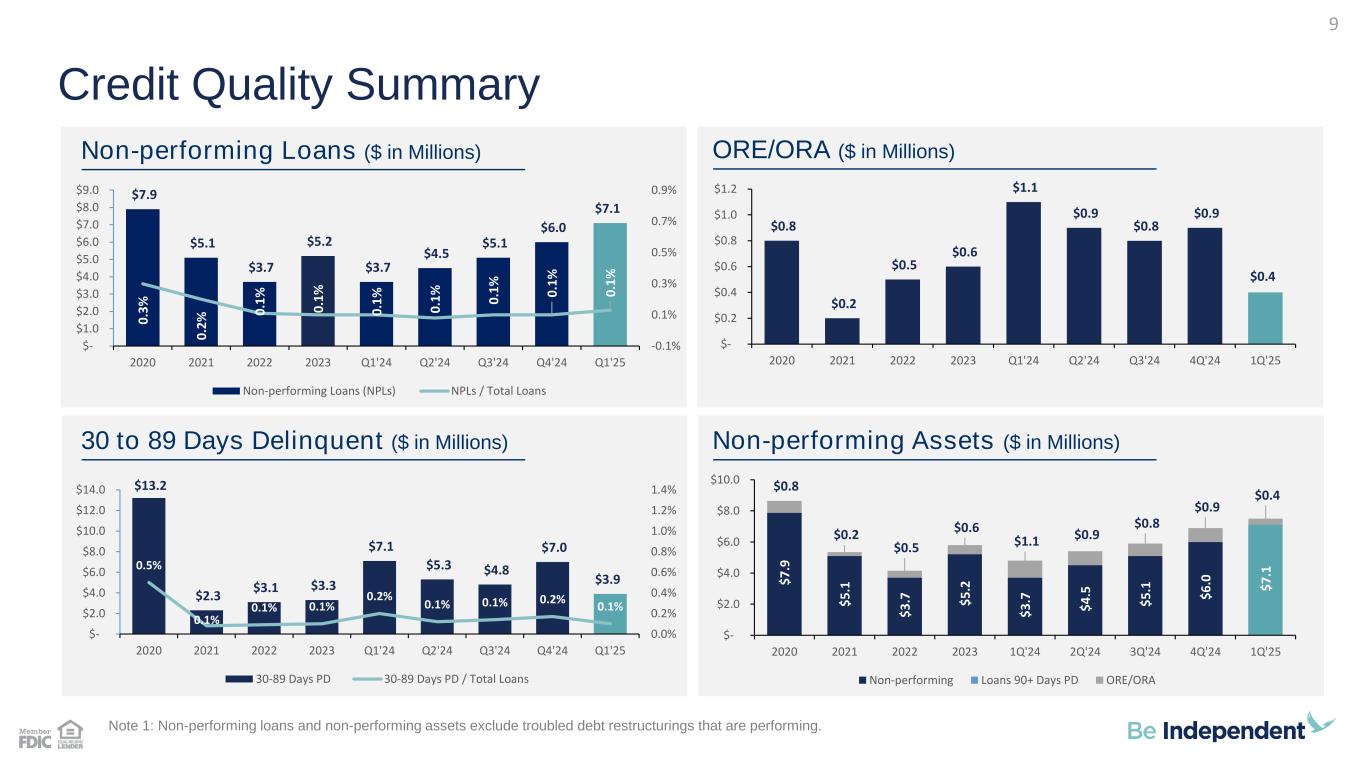 $ 7 .9 $ 5 .1 $ 3 .7 $ 5 .2 $ 3 .7 $ 4 .5 $ 5 .1 $ 6 .0 $ 7 .1 $0.8 $0.2 $0.5 $0.6 $1.1 $0.9 $0.8 $0.9 $0.4 $- $2.0 $4.0 $6.0 $8.0 $10.0 2020 2021 2022 2023 1Q'24 2Q'24 3Q'24 4Q'24 1Q'25 Non-performing Loans 90+ Days PD ORE/ORA $13.2 $2.3 $3.1 $3.3 $7.1 $5.3 $4.8 $7.0 $3.9 0.5% 0.1% 0.1% 0.1% 0.2% 0.1% 0.1% 0.2% 0.1% 0.0% 0.2% 0.4% 0.6% 0.8% 1.0% 1.2% 1.4% $- $2.0 $4.0 $6.0 $8.0 $10.0 $12.0 $14.0 2020 2021 2022 2023 Q1'24 Q2'24 Q3'24 Q4'24 Q1'25 30-89 Days PD 30-89 Days PD / Total Loans $0.8 $0.2 $0.5 $0.6 $1.1 $0.9 $0.8 $0.9 $0.4 $- $0.2 $0.4 $0.6 $0.8 $1.0 $1.2 2020 2021 2022 2023 Q1'24 Q2'24 Q3'24 4Q'24 1Q'25 $7.9 $5.1 $3.7 $5.2 $3.7 $4.5 $5.1 $6.0 $7.1 0 .3 % 0 .2 % 0 .1 % 0 .1 % 0 .1 % 0 .1 % 0 .1 % 0 .1 % 0 .1 % -0.1% 0.1% 0.3% 0.5% 0.7% 0.9% $- $1.0 $2.0 $3.0 $4.0 $5.0 $6.0 $7.0 $8.0 $9.0 2020 2021 2022 2023 Q1'24 Q2'24 Q3'24 Q4'24 Q1'25 Non-performing Loans (NPLs) NPLs / Total Loans Note 1: Non-performing loans and non-performing assets exclude troubled debt restructurings that are performing. Credit Quality Summary Non-performing Loans ($ in Millions) ORE/ORA ($ in Millions) 30 to 89 Days Delinquent ($ in Millions) Non-performing Assets ($ in Millions) 9