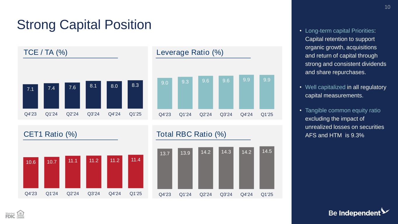 13.7 13.9 14.2 14.3 14.2 14.5 Q4'23 Q1'24 Q2'24 Q3'24 Q4'24 Q1'25 10.6 10.7 11.1 11.2 11.2 11.4 Q4'23 Q1'24 Q2'24 Q3'24 Q4'24 Q1'25 9.0 9.3 9.6 9.6 9.9 9.9 Q4'23 Q1'24 Q2'24 Q3'24 Q4'24 Q1'25 7.1 7.4 7.6 8.1 8.0 8.3 Q4'23 Q1'24 Q2'24 Q3'24 Q4'24 Q1'25 • Long-term capital Priorities: Capital retention to support organic growth, acquisitions and return of capital through strong and consistent dividends and share repurchases. • Well capitalized in all regulatory capital measurements. • Tangible common equity ratio excluding the impact of unrealized losses on securities AFS and HTM is 9.3% Strong Capital Position TCE / TA (%) Leverage Ratio (%) CET1 Ratio (%) Total RBC Ratio (%) 10