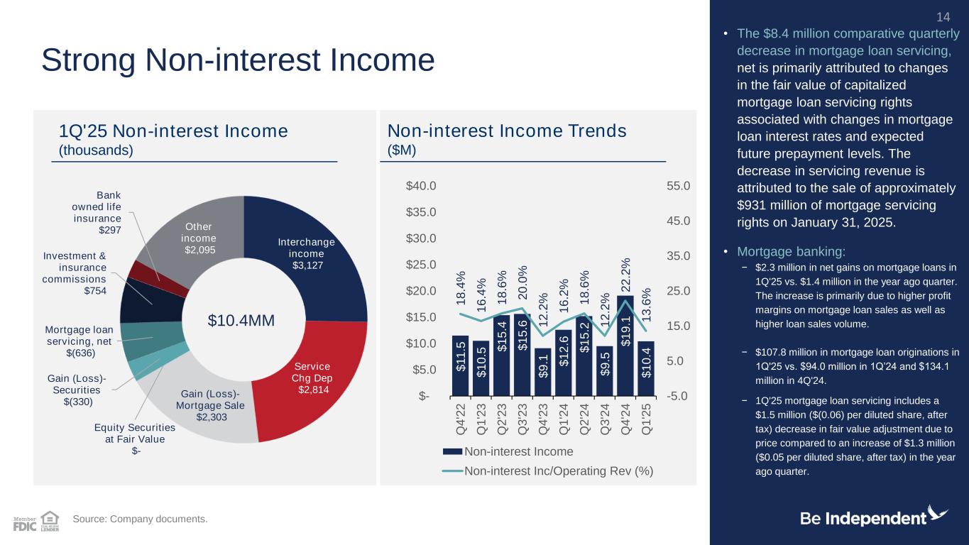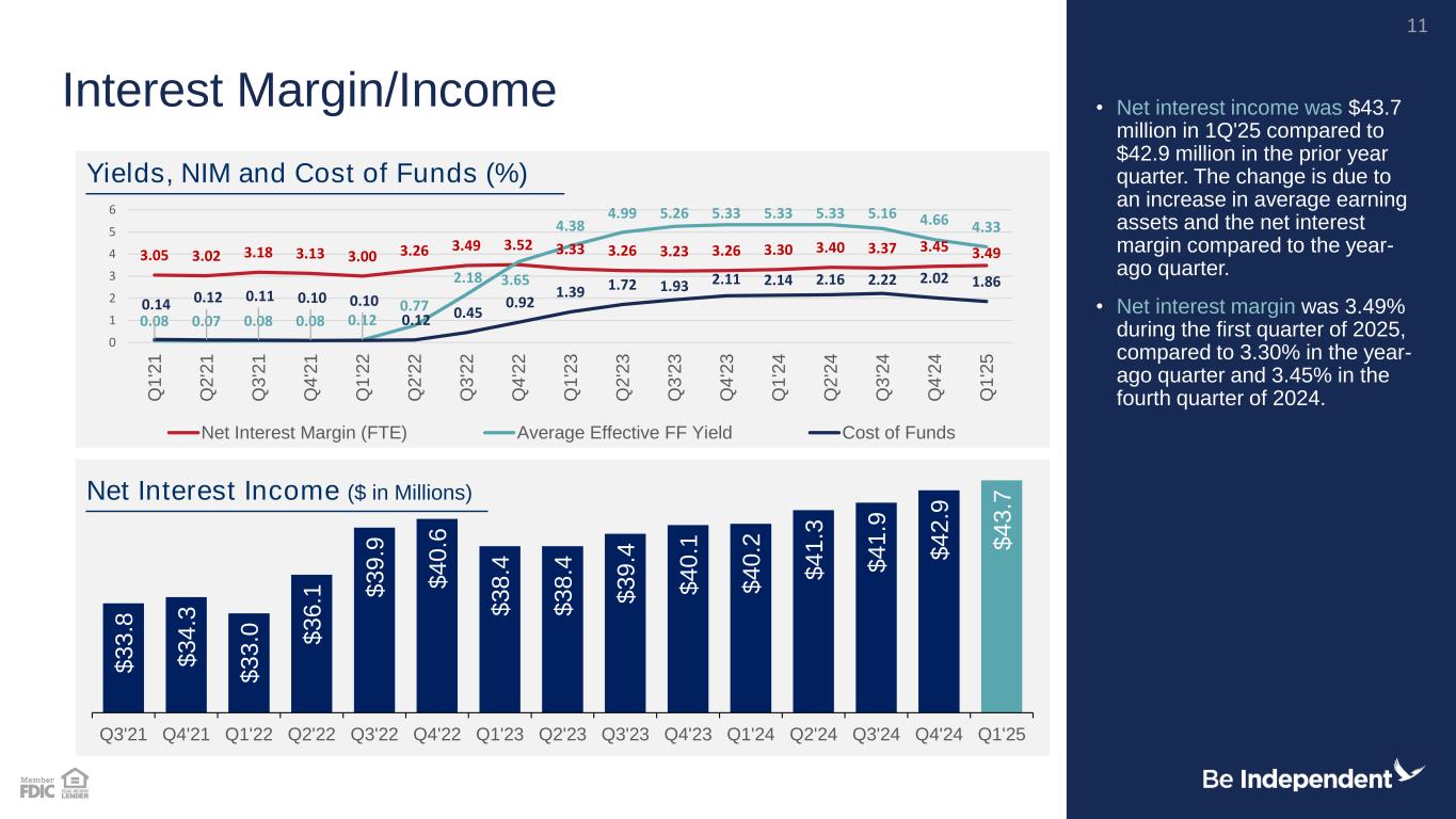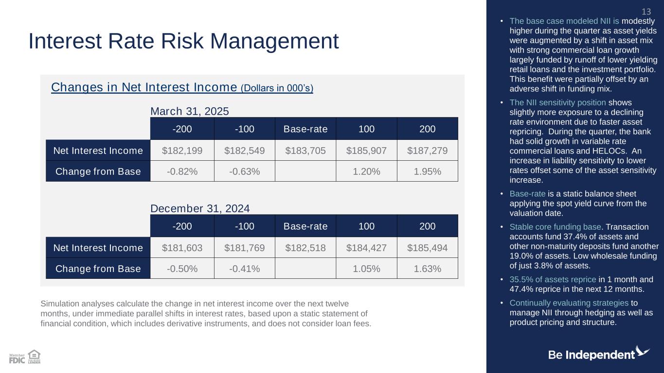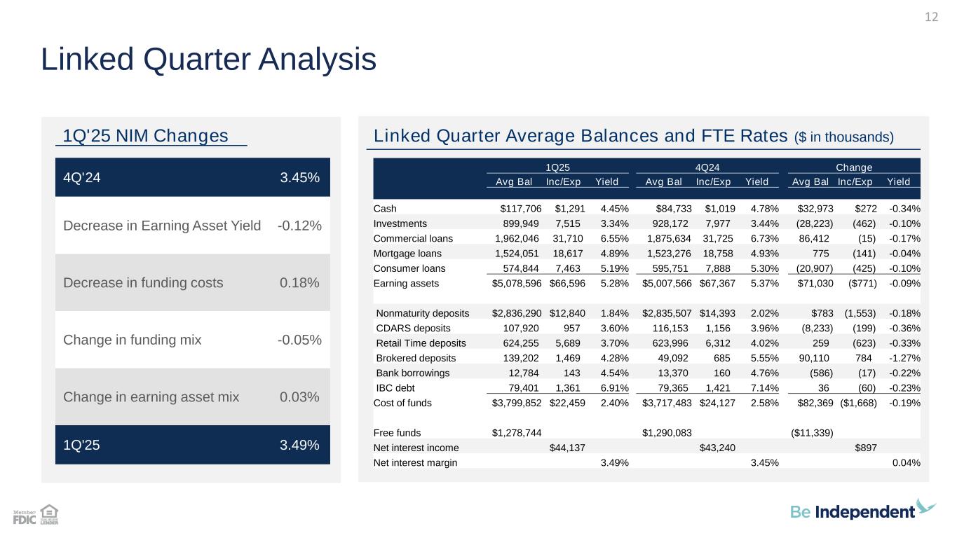 1Q25 4Q24 Change Avg Bal Inc/Exp Yield Avg Bal Inc/Exp Yield Avg Bal Inc/Exp Yield Cash $117,706 $1,291 4.45% $84,733 $1,019 4.78% $32,973 $272 -0.34% Investments 899,949 7,515 3.34% 928,172 7,977 3.44% (28,223) (462) -0.10% Commercial loans 1,962,046 31,710 6.55% 1,875,634 31,725 6.73% 86,412 (15) -0.17% Mortgage loans 1,524,051 18,617 4.89% 1,523,276 18,758 4.93% 775 (141) -0.04% Consumer loans 574,844 7,463 5.19% 595,751 7,888 5.30% (20,907) (425) -0.10% Earning assets $5,078,596 $66,596 5.28% $5,007,566 $67,367 5.37% $71,030 ($771) -0.09% Nonmaturity deposits $2,836,290 $12,840 1.84% $2,835,507 $14,393 2.02% $783 (1,553) -0.18% CDARS deposits 107,920 957 3.60% 116,153 1,156 3.96% (8,233) (199) -0.36% Retail Time deposits 624,255 5,689 3.70% 623,996 6,312 4.02% 259 (623) -0.33% Brokered deposits 139,202 1,469 4.28% 49,092 685 5.55% 90,110 784 -1.27% Bank borrowings 12,784 143 4.54% 13,370 160 4.76% (586) (17) -0.22% IBC debt 79,401 1,361 6.91% 79,365 1,421 7.14% 36 (60) -0.23% Cost of funds $3,799,852 $22,459 2.40% $3,717,483 $24,127 2.58% $82,369 ($1,668) -0.19% Free funds $1,278,744 $1,290,083 ($11,339) Net interest income $44,137 $43,240 $897 Net interest margin 3.49% 3.45% 0.04% 4Q'24 3.45% Decrease in Earning Asset Yield -0.12% Decrease in funding costs 0.18% Change in funding mix -0.05% Change in earning asset mix 0.03% 1Q'25 3.49% 1Q'25 NIM Changes Linked Quarter Average Balances and FTE Rates ($ in thousands) Linked Quarter Analysis 12