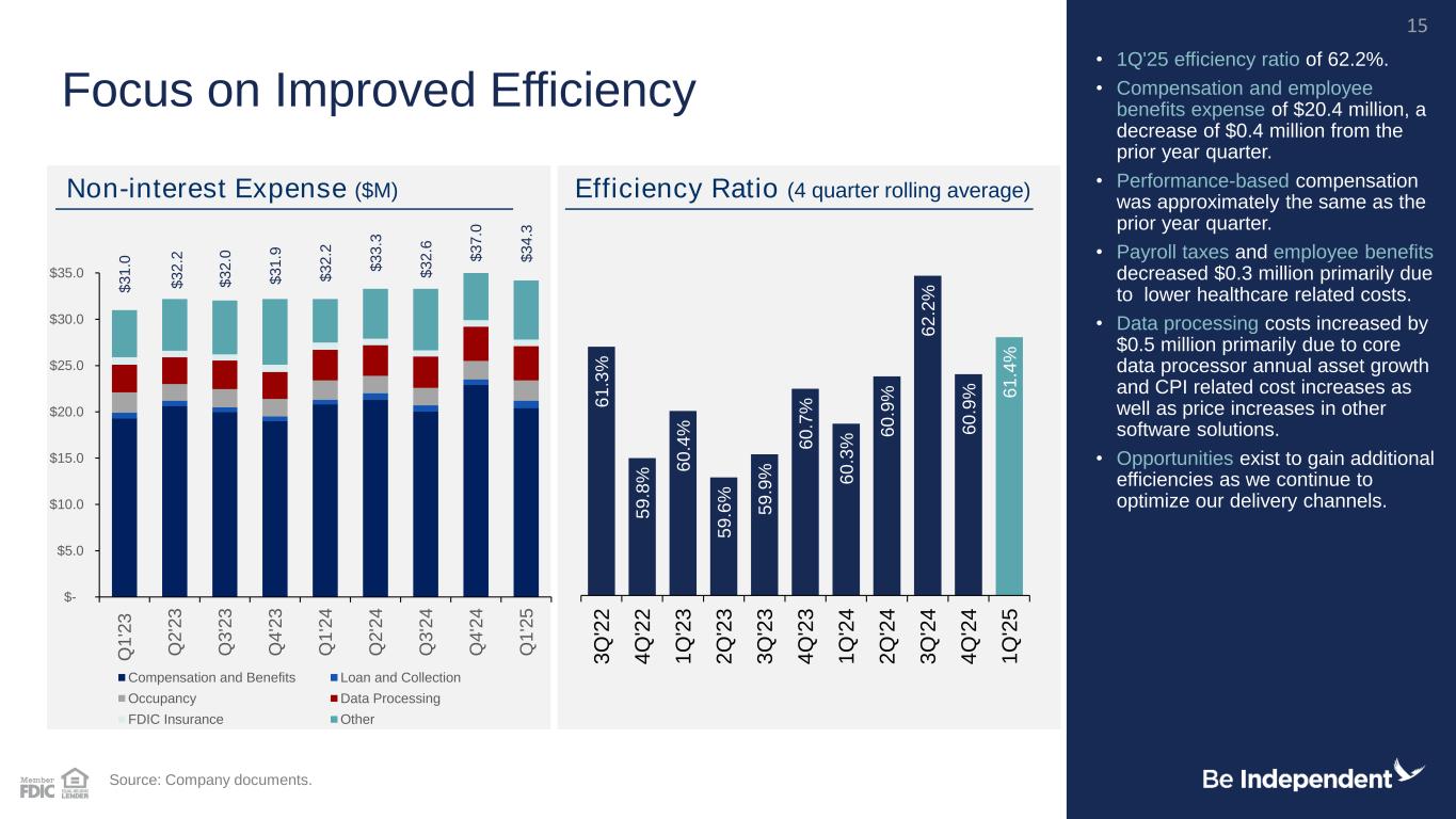 Interchange income $3,127 Service Chg Dep $2,814 Gain (Loss)- Mortgage Sale $2,303 Equity Securities at Fair Value $- Gain (Loss)- Securities $(330) Mortgage loan servicing, net $(636) Investment & insurance commissions $754 Bank owned life insurance $297 Other income $2,095 $ 1 1 .5 $ 1 0 .5 $ 1 5 .4 $ 1 5 .6 $ 9 .1 $ 1 2 .6 $ 1 5 .2 $ 9 .5 $ 1 9 .1 $ 1 0 .4 1 8 .4 % 1 6 .4 % 1 8 .6 % 2 0 .0 % 1 2 .2 % 1 6 .2 % 1 8 .6 % 1 2 .2 % 2 2 .2 % 1 3 .6 % -5.0 5.0 15.0 25.0 35.0 45.0 55.0 $- $5.0 $10.0 $15.0 $20.0 $25.0 $30.0 $35.0 $40.0 Q 4 '2 2 Q 1 '2 3 Q 2 '2 3 Q 3 '2 3 Q 4 '2 3 Q 1 '2 4 Q 2 '2 4 Q 3 '2 4 Q 4 '2 4 Q 1 '2 5 Non-interest Income Non-interest Inc/Operating Rev (%) Strong Non-interest Income • The $8.4 million comparative quarterly decrease in mortgage loan servicing, net is primarily attributed to changes in the fair value of capitalized mortgage loan servicing rights associated with changes in mortgage loan interest rates and expected future prepayment levels. The decrease in servicing revenue is attributed to the sale of approximately $931 million of mortgage servicing rights on January 31, 2025. • Mortgage banking: − $2.3 million in net gains on mortgage loans in 1Q'25 vs. $1.4 million in the year ago quarter. The increase is primarily due to higher profit margins on mortgage loan sales as well as higher loan sales volume. − $107.8 million in mortgage loan originations in 1Q'25 vs. $94.0 million in 1Q’24 and $134.1 million in 4Q'24. − 1Q'25 mortgage loan servicing includes a $1.5 million ($(0.06) per diluted share, after tax) decrease in fair value adjustment due to price compared to an increase of $1.3 million ($0.05 per diluted share, after tax) in the year ago quarter. Source: Company documents. 1Q'25 Non-interest Income (thousands) Non-interest Income Trends ($M) 14 $10.4MM