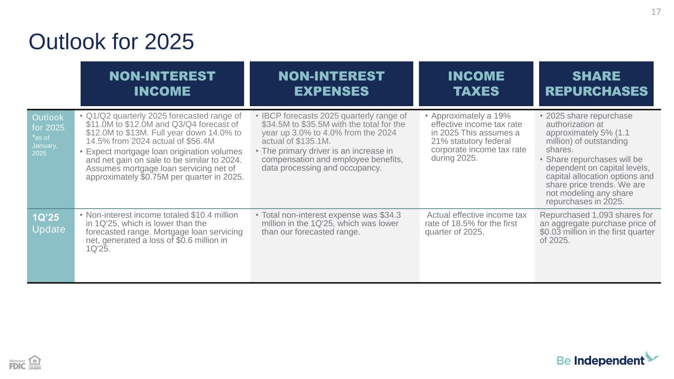 Outlook for 2025 Outlook for 2025 *as of January, 2025 • IBCP forecast of mid-single digit (approximately 5%-6%) overall loan growth is based on increases in commercial loans (9%-10%) and mortgage loans (2%-3%) with installment loans declining (2%-3%). • This growth forecast also assumes a stable Michigan economy. • The forecast assumes 0.25% Fed rate cuts in March and August in the federal funds rate while long-term interest rates increase slightly over year-end 2024 levels. • IBCP forecast of high-single digit (8%-9%) growth is primarily supported by an increase in earning assets and a favorable shift in the earning asset base. Expect the net interest margin (NIM) to increase (0.20% - 0.25%) in 2025 compared to full-year 2024. Primary driver is a decrease in yield on interest bearing liabilities that is partially offset by a decrease in earning asset yield. • Very difficult area to forecast. Future provision levels under CECL will be particularly sensitive to loan growth and mix, projected economic conditions, watch credit levels and loan default volumes. • The allowance as a percentage of total loans was at 1.47% at 12/31/24 • A full year 2025 provision (expense) for credit losses of approximately 0.15%-0.20% of average total portfolio loans would not be unreasonable. 1Q’25 Update • Total portfolio loans increased $33.9 million (3.4% annualized) in 1Q'25 which is below our forecasted range. Commercial loan growth of $54.8 million (11.5% annualized) that was partially offset by a decrease of $3.9 million (1.0% annualized) in mortgage loans and a $17.0 (11.8% annualized) in installment loans. • 1Q'25 net interest income was $3.5 million (8.7%) higher than the prior year quarter which is within the forecasted range. The net interest margin was 3.49% for the current quarter and 3.30% for the prior year quarter and up 0.04% from the linked quarter. • The provision for credit losses was an expense of $0.7 million for the first quarter below the forecasted range. LENDING Continued growth NET INTEREST INCOME Growth driven primarily by higher average earning assets PROVISION FOR CREDIT LOSSES Steady asset quality metrics 16