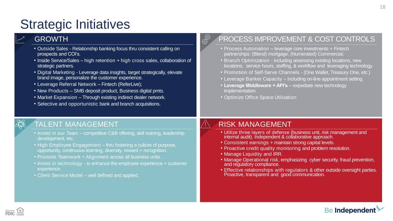 Strategic Initiatives • Outside Sales - Relationship banking focus thru consistent calling on prospects and COI’s. • Inside Service/Sales – high retention + high cross sales, collaboration of strategic partners. • Digital Marketing - Leverage data insights, target strategically, elevate brand image, personalize the customer experience. • Leverage Referral Network – Fintech (ReferLive); • New Products – SMB deposit product, Business digital pmts. • Market Expansion – Through existing indirect dealer network. • Selective and opportunistic bank and branch acquisitions. • Process Automation – leverage core investments + Fintech partnerships: (Blend) mortgage; (Numerated) Commercial; • Branch Optimization - including assessing existing locations, new locations, service hours, staffing, & workflow and leveraging technology. • Promotion of Self-Serve Channels - (One Wallet, Treasury One, etc.) • Leverage Banker Capacity – including on-line appointment setting. • Leverage Middleware + API’s – expediate new technology implementation. • Optimize Office Space Utilization • Invest in our Team – competitive C&B offering, skill training, leadership development, etc. • High Employee Engagement – thru fostering a culture of purpose, opportunity, continuous learning, diversity, reward + recognition. • Promote Teamwork + Alignment across all business units. • Invest in technology - to enhance the employee experience + customer experience. • Client Service Model – well defined and applied. • Utilize three layers of defense (business unit, risk management and internal audit). Independent & collaborative approach. • Consistent earnings + maintain strong capital levels. • Proactive credit quality monitoring and problem resolution. • Manage Liquidity and IRR. • Manage Operational risk, emphasizing cyber security, fraud prevention, and regulatory compliance. • Effective relationships with regulators & other outside oversight parties. Proactive, transparent and good communication. PROCESS IMPROVEMENT & COST CONTROLS RISK MANAGEMENT GROWTH TALENT MANAGEMENT 18