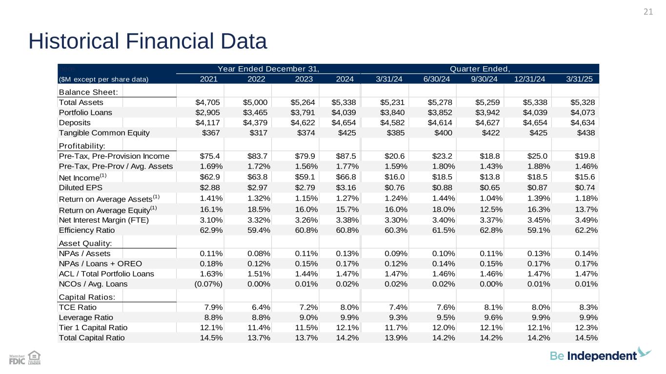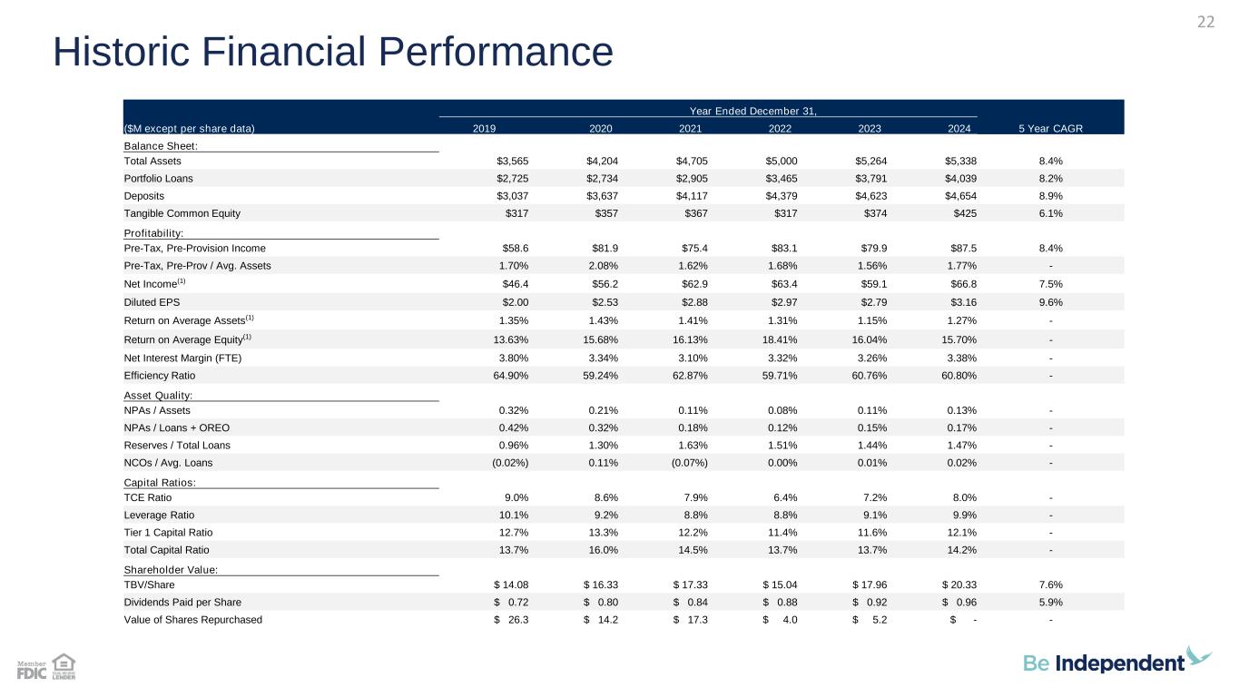 Historical Financial Data 21 here Year Ended December 31, Quarter Ended, ($M except per share data) 2021 2022 2023 2024 3/31/24 6/30/24 9/30/24 12/31/24 3/31/25 Balance Sheet: Total Assets $4,705 $5,000 $5,264 $5,338 $5,231 $5,278 $5,259 $5,338 $5,328 Portfolio Loans $2,905 $3,465 $3,791 $4,039 $3,840 $3,852 $3,942 $4,039 $4,073 Deposits $4,117 $4,379 $4,622 $4,654 $4,582 $4,614 $4,627 $4,654 $4,634 Tangible Common Equity $367 $317 $374 $425 $385 $400 $422 $425 $438 Profitability: Pre-Tax, Pre-Provision Income $75.4 $83.7 $79.9 $87.5 $20.6 $23.2 $18.8 $25.0 $19.8 Pre-Tax, Pre-Prov / Avg. Assets 1.69% 1.72% 1.56% 1.77% 1.59% 1.80% 1.43% 1.88% 1.46% Net Income(1) $62.9 $63.8 $59.1 $66.8 $16.0 $18.5 $13.8 $18.5 $15.6 Diluted EPS $2.88 $2.97 $2.79 $3.16 $0.76 $0.88 $0.65 $0.87 $0.74 Return on Average Assets(1) 1.41% 1.32% 1.15% 1.27% 1.24% 1.44% 1.04% 1.39% 1.18% Return on Average Equity(1) 16.1% 18.5% 16.0% 15.7% 16.0% 18.0% 12.5% 16.3% 13.7% Net Interest Margin (FTE) 3.10% 3.32% 3.26% 3.38% 3.30% 3.40% 3.37% 3.45% 3.49% Efficiency Ratio 62.9% 59.4% 60.8% 60.8% 60.3% 61.5% 62.8% 59.1% 62.2% Asset Quality: NPAs / Assets 0.11% 0.08% 0.11% 0.13% 0.09% 0.10% 0.11% 0.13% 0.14% NPAs / Loans + OREO 0.18% 0.12% 0.15% 0.17% 0.12% 0.14% 0.15% 0.17% 0.17% ACL / Total Portfolio Loans 1.63% 1.51% 1.44% 1.47% 1.47% 1.46% 1.46% 1.47% 1.47% NCOs / Avg. Loans (0.07%) 0.00% 0.01% 0.02% 0.02% 0.02% 0.00% 0.01% 0.01% Capital Ratios: TCE Ratio 7.9% 6.4% 7.2% 8.0% 7.4% 7.6% 8.1% 8.0% 8.3% Leverage Ratio 8.8% 8.8% 9.0% 9.9% 9.3% 9.5% 9.6% 9.9% 9.9% Tier 1 Capital Ratio 12.1% 11.4% 11.5% 12.1% 11.7% 12.0% 12.1% 12.1% 12.3% Total Capital Ratio 14.5% 13.7% 13.7% 14.2% 13.9% 14.2% 14.2% 14.2% 14.5%