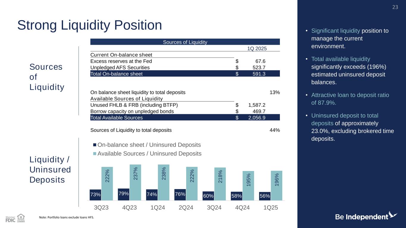 Sources of Liquidity 1Q 2025 Current On-balance sheet Excess reserves at the Fed $ 67.6 Unpledged AFS Securities $ 523.7 Total On-balance sheet $ 591.3 On balance sheet liquidity to total deposits 13% Available Sources of Liquidity Unused FHLB & FRB (including BTFP) $ 1,587.2 Borrow capacity on unpledged bonds $ 469.7 Total Available Sources $ 2,056.9 Sources of Liquidity to total deposits 44% 73% 79% 74% 76% 60% 58% 56% 2 2 2 % 2 3 7 % 2 3 8 % 2 2 2 % 2 1 8 % 1 9 5 % 1 9 6 % 3Q23 4Q23 1Q24 2Q24 3Q24 4Q24 1Q25 On-balance sheet / Uninsured Deposits Available Sources / Uninsured Deposits Note: Portfolio loans exclude loans HFS. Liquidity / Uninsured Deposits Strong Liquidity Position • Significant liquidity position to manage the current environment. • Total available liquidity significantly exceeds (196%) estimated uninsured deposit balances. • Attractive loan to deposit ratio of 87.9%. • Uninsured deposit to total deposits of approximately 23.0%, excluding brokered time deposits. Sources of Liquidity 23