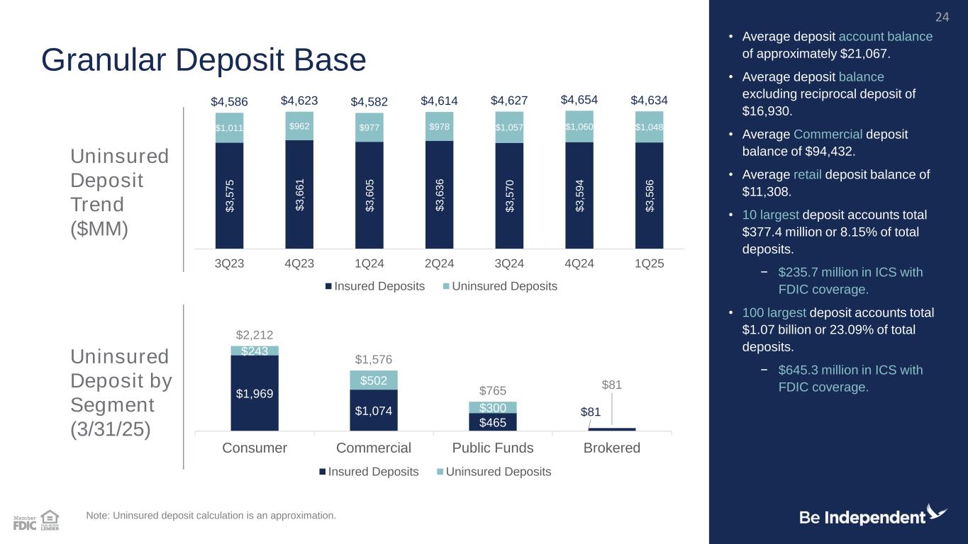 $1,969 $1,074 $465 $81 $243 $502 $300 $2,212 $1,576 $765 $81 Consumer Commercial Public Funds Brokered Insured Deposits Uninsured Deposits $ 3 ,5 7 5 $ 3 ,6 6 1 $ 3 ,6 0 5 $ 3 ,6 3 6 $ 3 ,5 7 0 $ 3 ,5 9 4 $ 3 ,5 8 6 $1,011 $962 $977 $978 $1,057 $1,060 $1,048 $4,586 $4,623 $4,582 $4,614 $4,627 $4,654 $4,634 3Q23 4Q23 1Q24 2Q24 3Q24 4Q24 1Q25 Insured Deposits Uninsured Deposits Granular Deposit Base • Average deposit account balance of approximately $21,067. • Average deposit balance excluding reciprocal deposit of $16,930. • Average Commercial deposit balance of $94,432. • Average retail deposit balance of $11,308. • 10 largest deposit accounts total $377.4 million or 8.15% of total deposits. − $235.7 million in ICS with FDIC coverage. • 100 largest deposit accounts total $1.07 billion or 23.09% of total deposits. − $645.3 million in ICS with FDIC coverage. Note: Uninsured deposit calculation is an approximation. Uninsured Deposit by Segment (3/31/25) Uninsured Deposit Trend ($MM) 24