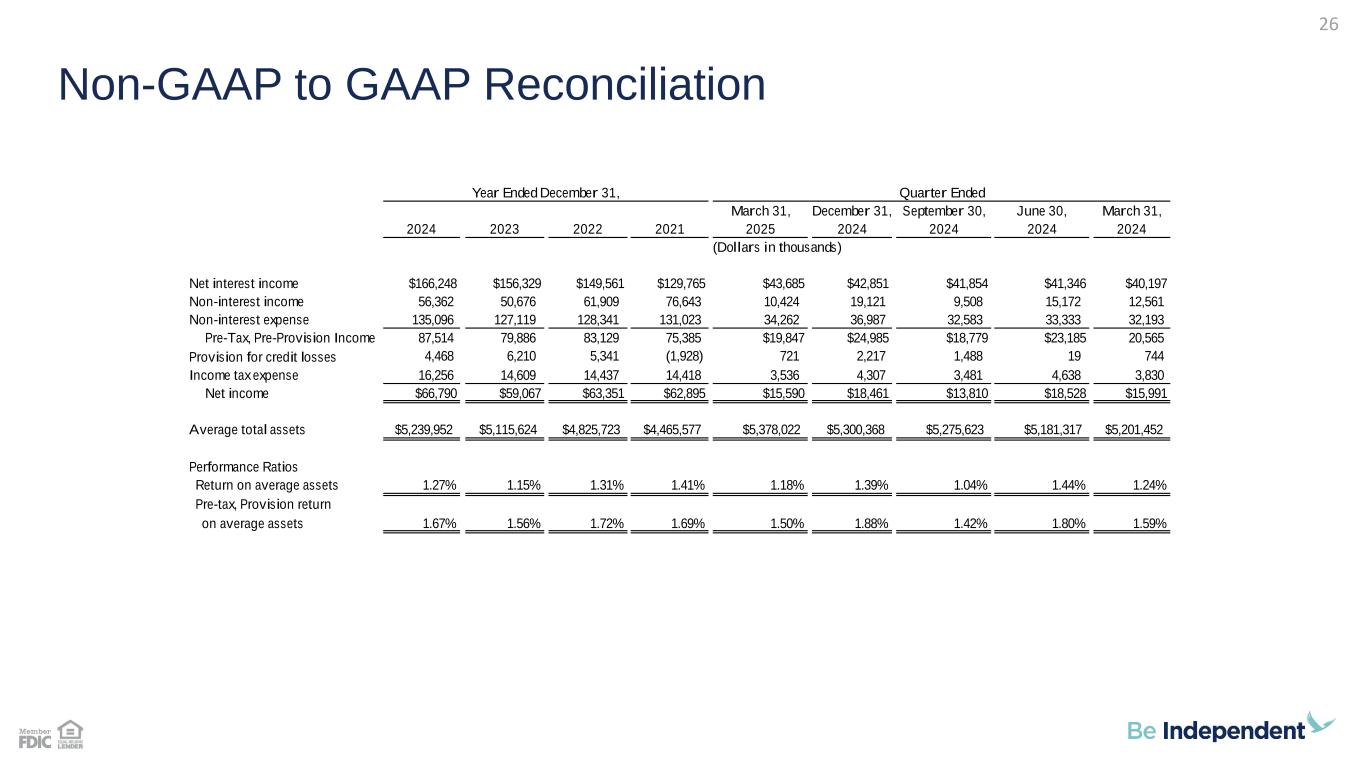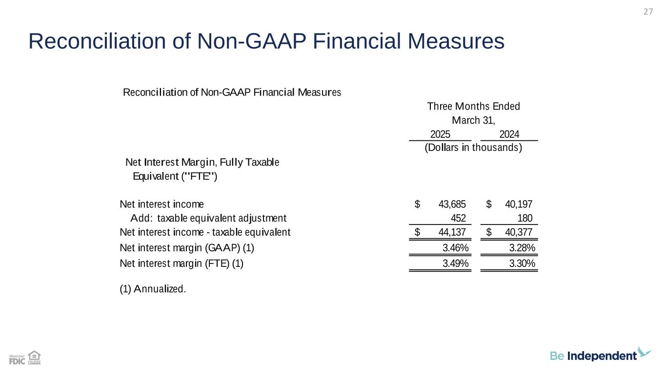 Non-GAAP to GAAP Reconciliation 26 March 31, December 31, September 30, June 30, March 31, 2024 2023 2022 2021 2025 2024 2024 2024 2024 Net interest income $166,248 $156,329 $149,561 $129,765 $43,685 $42,851 $41,854 $41,346 $40,197 Non-interest income 56,362 50,676 61,909 76,643 10,424 19,121 9,508 15,172 12,561 Non-interest expense 135,096 127,119 128,341 131,023 34,262 36,987 32,583 33,333 32,193 Pre-Tax, Pre-Provision Income 87,514 79,886 83,129 75,385 $19,847 $24,985 $18,779 $23,185 20,565 Provision for credit losses 4,468 6,210 5,341 (1,928) 721 2,217 1,488 19 744 Income tax expense 16,256 14,609 14,437 14,418 3,536 4,307 3,481 4,638 3,830 Net income $66,790 $59,067 $63,351 $62,895 $15,590 $18,461 $13,810 $18,528 $15,991 Average total assets $5,239,952 $5,115,624 $4,825,723 $4,465,577 $5,378,022 $5,300,368 $5,275,623 $5,181,317 $5,201,452 Performance Ratios Return on average assets 1.27% 1.15% 1.31% 1.41% 1.18% 1.39% 1.04% 1.44% 1.24% Pre-tax, Provision return on average assets 1.67% 1.56% 1.72% 1.69% 1.50% 1.88% 1.42% 1.80% 1.59% Year Ended December 31, Quarter Ended (Dollars in thousands)