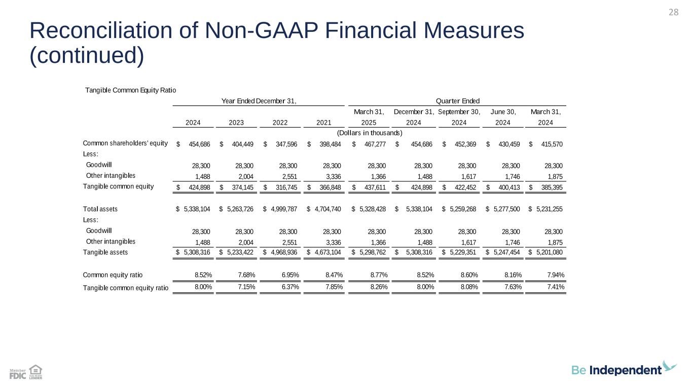 Reconciliation of Non-GAAP Financial Measures 27 Reconciliation of Non-GAAP Financial Measures 2025 2024 Net Interest Margin, Fully Taxable Equivalent ("FTE") Net interest income 43,685$ 40,197$ Add: taxable equivalent adjustment 452 180 Net interest income - taxable equivalent 44,137$ 40,377$ Net interest margin (GAAP) (1) 3.46% 3.28% Net interest margin (FTE) (1) 3.49% 3.30% (1) Annualized. Three Months Ended March 31, (Dollars in thousands)