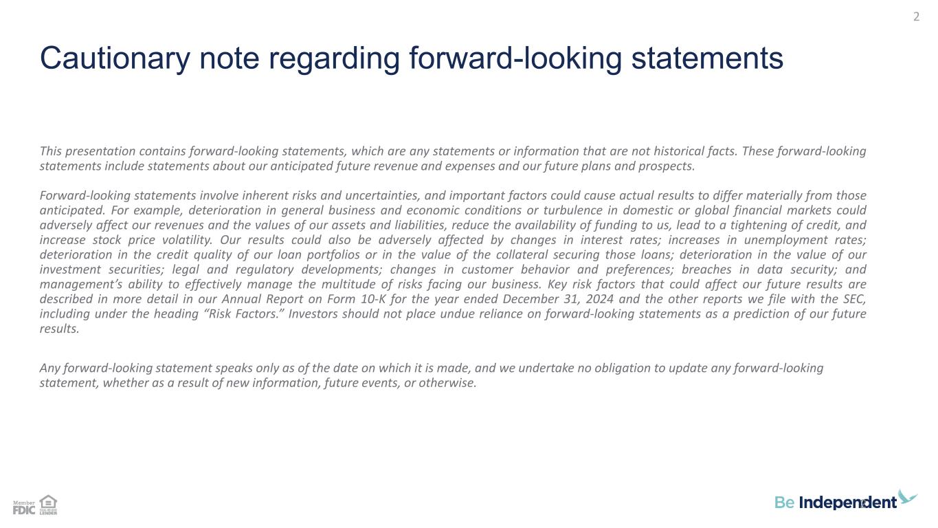 Cautionary note regarding forward-looking statements This presentation contains forward-looking statements, which are any statements or information that are not historical facts. These forward-looking statements include statements about our anticipated future revenue and expenses and our future plans and prospects. Forward-looking statements involve inherent risks and uncertainties, and important factors could cause actual results to differ materially from those anticipated. For example, deterioration in general business and economic conditions or turbulence in domestic or global financial markets could adversely affect our revenues and the values of our assets and liabilities, reduce the availability of funding to us, lead to a tightening of credit, and increase stock price volatility. Our results could also be adversely affected by changes in interest rates; increases in unemployment rates; deterioration in the credit quality of our loan portfolios or in the value of the collateral securing those loans; deterioration in the value of our investment securities; legal and regulatory developments; changes in customer behavior and preferences; breaches in data security; and management’s ability to effectively manage the multitude of risks facing our business. Key risk factors that could affect our future results are described in more detail in our Annual Report on Form 10-K for the year ended December 31, 2024 and the other reports we file with the SEC, including under the heading “Risk Factors.” Investors should not place undue reliance on forward-looking statements as a prediction of our future results. Any forward-looking statement speaks only as of the date on which it is made, and we undertake no obligation to update any forward-looking statement, whether as a result of new information, future events, or otherwise. 2 2