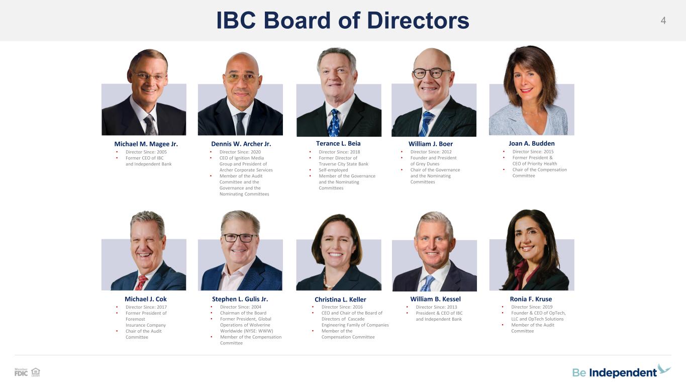 4IBC Board of Directors • Director Since: 2013 • President & CEO of IBC and Independent Bank • Director Since: 2019 • Founder & CEO of OpTech, LLC and OpTech Solutions • Member of the Audit Committee • Director Since: 2016 • CEO and Chair of the Board of Directors of Cascade Engineering Family of Companies • Member of the Compensation Committee • Director Since: 2004 • Chairman of the Board • Former President, Global Operations of Wolverine Worldwide (NYSE: WWW) • Member of the Compensation Committee • Director Since: 2017 • Former President of Foremost Insurance Company • Chair of the Audit Committee • Director Since: 2005 • Former CEO of IBC and Independent Bank • Director Since: 2015 • Former President & CEO of Priority Health • Chair of the Compensation Committee • Director Since: 2012 • Founder and President of Grey Dunes • Chair of the Governance and the Nominating Committees • Director Since: 2018 • Former Director of Traverse City State Bank • Self-employed • Member of the Governance and the Nominating Committees • Director Since: 2020 • CEO of Ignition Media Group and President of Archer Corporate Services • Member of the Audit Committee and the Governance and the Nominating Committees Michael J. Cok Stephen L. Gulis Jr. Christina L. Keller William B. Kessel Ronia F. Kruse Michael M. Magee Jr. Dennis W. Archer Jr. Terance L. Beia William J. Boer Joan A. Budden
