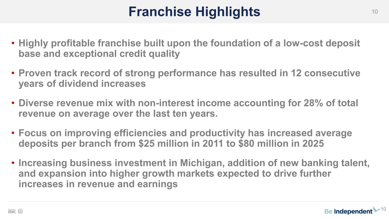 Data as of June 30, 2025. Note: Loan and deposit balances exclude the loans and deposits (such as brokered deposits) that are not clearly allocable to a certain market region. Loans specifically exclude: $216 million of Ohio mortgage loans, $24 million of resort loans and $5 million of purchased mortgage loans. SE (Detroit) Deposits: $630M | Loans: $1,456M Locations: 8 NW (Traverse City) Deposits: $269M | Loans: $473M Locations: 4 Bay Area Deposits: $1,019M | Loans: $218M Locations: 18 Central (Lansing) Deposits: $501M | Loans: $192M Locations: 10 West (Grand Rapids Area) Deposits: $1,271M | Loans: $1,107M Locations: 19 Presence by Region Photo Credit: Kaytie Boomer, MLive
