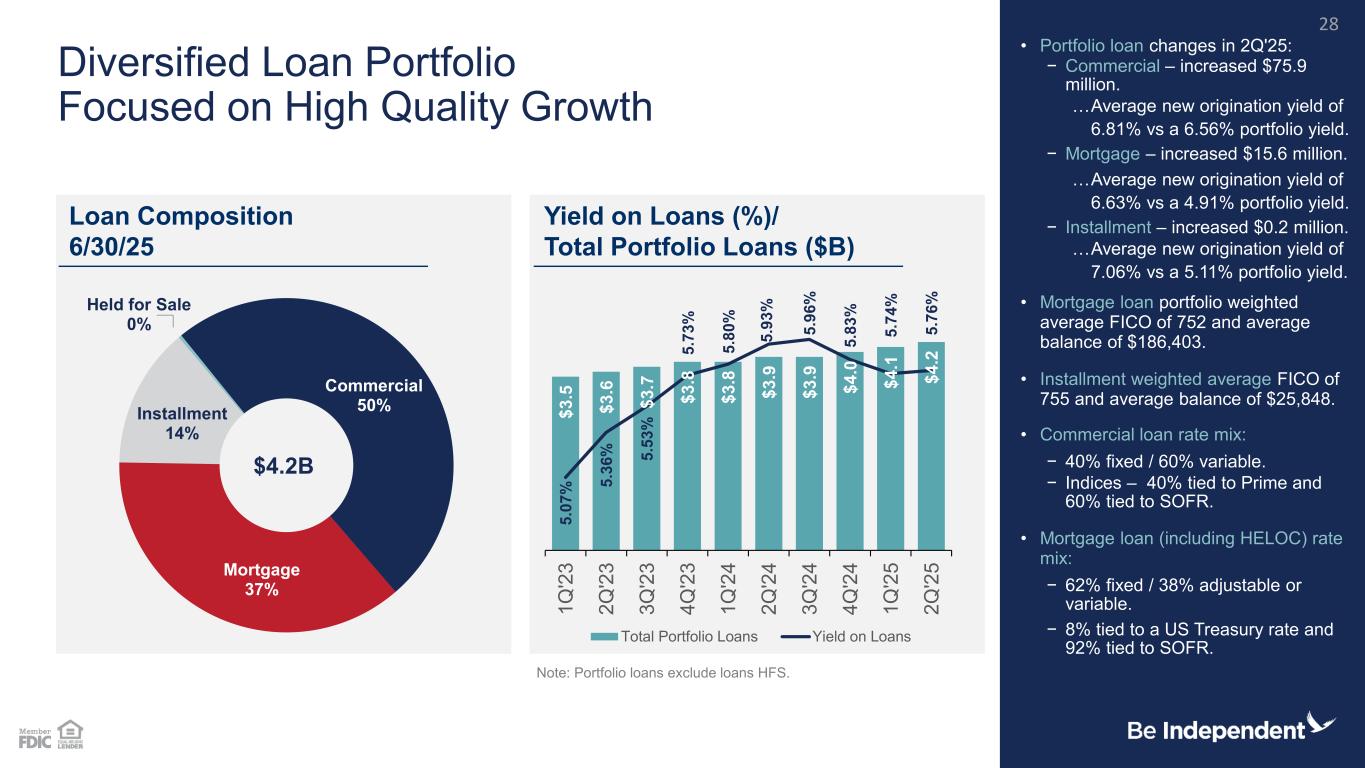 Historical Financial Data 41 here Year Ended December 31, Quarter Ended, ($M except per share data) 2021 2022 2023 2024 6/30/24 9/30/24 12/31/24 3/31/25 6/30/25 Balance Sheet: Total Assets $4,705 $5,000 $5,264 $5,338 $5,278 $5,259 $5,338 $5,328 $5,419 Portfolio Loans $2,905 $3,465 $3,791 $4,039 $3,852 $3,942 $4,039 $4,073 $4,164 Deposits $4,117 $4,379 $4,622 $4,654 $4,614 $4,627 $4,654 $4,634 $4,659 Tangible Common Equity $367 $317 $374 $425 $400 $422 $425 $438 $440 Profitability: Pre-Tax, Pre-Provision Income $75.4 $83.7 $79.9 $87.5 $23.2 $18.8 $25.0 $19.8 $22.2 Pre-Tax, Pre-Prov / Avg. Assets 1.69% 1.72% 1.56% 1.77% 1.80% 1.43% 1.88% 1.48% 1.67% Net Income(1) $62.9 $63.8 $59.1 $66.8 $18.5 $13.8 $18.5 $15.6 $16.9 Diluted EPS $2.88 $2.97 $2.79 $3.16 $0.88 $0.65 $0.87 $0.74 $0.81 Return on Average Assets(1) 1.41% 1.32% 1.15% 1.27% 1.44% 1.04% 1.39% 1.18% 1.27% Return on Average Equity(1) 16.1% 18.5% 16.0% 15.7% 18.0% 12.5% 16.3% 13.7% 14.7% Net Interest Margin (FTE) 3.10% 3.32% 3.26% 3.38% 3.40% 3.37% 3.45% 3.49% 3.58% Efficiency Ratio 62.9% 59.4% 60.8% 60.8% 61.5% 62.8% 59.1% 62.2% 59.7% Asset Quality: NPAs / Assets 0.11% 0.08% 0.11% 0.13% 0.10% 0.11% 0.13% 0.14% 0.16% NPAs / Loans + OREO 0.18% 0.12% 0.15% 0.17% 0.14% 0.15% 0.17% 0.18% 0.21% ACL / Total Portfolio Loans 1.63% 1.51% 1.44% 1.47% 1.46% 1.46% 1.47% 1.47% 1.47% NCOs / Avg. Loans (0.07%) 0.00% 0.01% 0.02% 0.02% 0.00% 0.01% 0.01% 0.02% Capital Ratios: TCE Ratio 7.9% 6.4% 7.2% 8.0% 7.6% 8.1% 8.0% 8.3% 8.2% Leverage Ratio 8.8% 8.8% 9.0% 9.9% 9.5% 9.6% 9.9% 9.9% 10.0% Tier 1 Capital Ratio 12.1% 11.4% 11.5% 12.1% 12.0% 12.1% 12.1% 12.3% 12.2% Total Capital Ratio 14.5% 13.7% 13.7% 14.2% 14.2% 14.2% 14.2% 14.5% 14.2%
