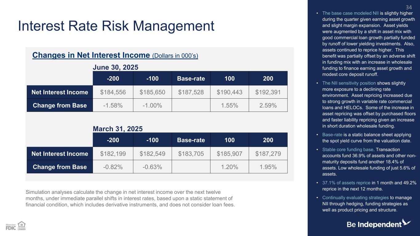 June 30, 2025 -200 -100 Base-rate 100 200 Net Interest Income $184,556 $185,650 $187,528 $190,443 $192,391 Change from Base -1.58% -1.00% 1.55% 2.59% March 31, 2025 -200 -100 Base-rate 100 200 Net Interest Income $182,199 $182,549 $183,705 $185,907 $187,279 Change from Base -0.82% -0.63% 1.20% 1.95% Interest Rate Risk Management • The base case modeled NII is slightly higher during the quarter given earning asset growth and slight margin expansion. Asset yields were augmented by a shift in asset mix with good commercial loan growth partially funded by runoff of lower yielding investments. Also, assets continued to reprice higher. This benefit was partially offset by an adverse shift in funding mix with an increase in wholesale funding to finance earning asset growth and modest core deposit runoff. • The NII sensitivity position shows slightly more exposure to a declining rate environment. Asset repricing increased due to strong growth in variable rate commercial loans and HELOCs. Some of the increase in asset repricing was offset by purchased floors and faster liability repricing given an increase in short duration wholesale funding. • Base-rate is a static balance sheet applying the spot yield curve from the valuation date. • Stable core funding base. Transaction accounts fund 36.9% of assets and other non- maturity deposits fund another 18.4% of assets. Low wholesale funding of just 5.6% of assets. • 37.1% of assets reprice in 1 month and 49.2% reprice in the next 12 months. • Continually evaluating strategies to manage NII through hedging, funding strategies as well as product pricing and structure. Changes in Net Interest Income (Dollars in 000’s) Simulation analyses calculate the change in net interest income over the next twelve months, under immediate parallel shifts in interest rates, based upon a static statement of financial condition, which includes derivative instruments, and does not consider loan fees. 34