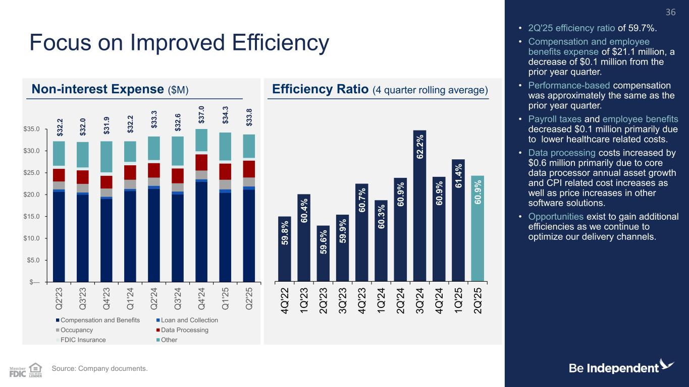 Interchange income $3,390 Service Chg Dep $2,981 Gain (Loss)- Mortgage Sale $1,631 Equity Securities at Fair Value $- Gain (Loss)- Securities $11 Mortgage loan servicing, net $490 Investment & insurance commissions $810 Bank owned life insurance $296 Other income $1,716 $ 1 0 .5 $ 1 5 .4 $ 1 5 .6 $ 9 .1 $ 1 2 .6 $ 1 5 .2 $ 9 .5 $ 1 9 .1 $ 1 0 .4 $ 1 1 .3 1 6 .4 % 1 8 .6 % 2 0 .0 % 1 2 .2 % 1 6 .2 % 1 8 .6 % 1 2 .2 % 2 2 .2 % 1 3 .6 % 1 4 .5 % -5.0 5.0 15.0 25.0 35.0 45.0 55.0 $- $5.0 $10.0 $15.0 $20.0 $25.0 $30.0 $35.0 $40.0 Q 1 '2 3 Q 2 '2 3 Q 3 '2 3 Q 4 '2 3 Q 1 '2 4 Q 2 '2 4 Q 3 '2 4 Q 4 '2 4 Q 1 '2 5 Q 2 '2 5 Non-interest Income Non-interest Inc/Operating Rev (%) Strong Non-interest Income • The $1.6 million comparative quarterly decrease in mortgage loan servicing, net is primarily attributed to changes in the fair value of capitalized mortgage loan servicing rights associated with changes in mortgage loan interest rates and expected future prepayment levels. The decrease in servicing revenue is attributed to the sale of approximately $931 million of mortgage servicing rights on January 31, 2025. • Mortgage banking: − $1.6 million in net gains on mortgage loans in 2Q'25 vs. $1.3 million in the year ago quarter. The increase is primarily due to higher profit margins on mortgage loan sales as well as higher loan sales volume. − $147.8 million in mortgage loan originations in 2Q'25 vs. $142.6 million in 2Q’24 and $107.8 million in 1Q'25. − 2Q'25 mortgage loan servicing includes a $0.2 million ($(0.01) per diluted share, after tax) decrease in fair value adjustment due to price compared to an increase of $0.9 million ($0.03 per diluted share, after tax) in the year ago quarter. Source: Company documents. 2Q'25 Non-interest Income (thousands) Non-interest Income Trends ($M) 35 $11.3MM