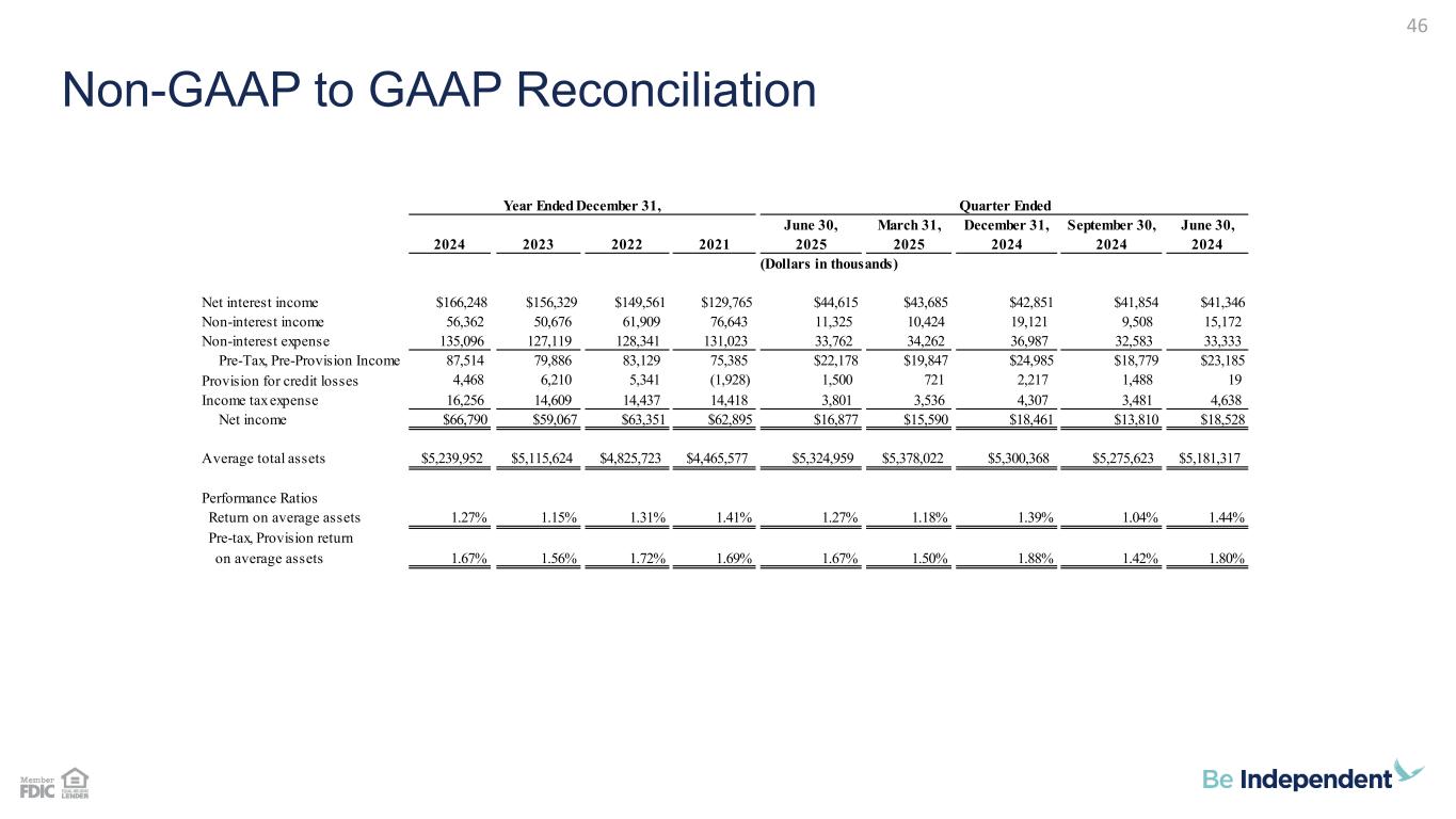 Non-GAAP to GAAP Reconciliation 46 June 30, March 31, December 31, September 30, June 30, 2024 2023 2022 2021 2025 2025 2024 2024 2024 Net interest income $166,248 $156,329 $149,561 $129,765 $44,615 $43,685 $42,851 $41,854 $41,346 Non-interest income 56,362 50,676 61,909 76,643 11,325 10,424 19,121 9,508 15,172 Non-interest expense 135,096 127,119 128,341 131,023 33,762 34,262 36,987 32,583 33,333 Pre-Tax, Pre-Provision Income 87,514 79,886 83,129 75,385 $22,178 $19,847 $24,985 $18,779 $23,185 Provision for credit losses 4,468 6,210 5,341 (1,928) 1,500 721 2,217 1,488 19 Income tax expense 16,256 14,609 14,437 14,418 3,801 3,536 4,307 3,481 4,638 Net income $66,790 $59,067 $63,351 $62,895 $16,877 $15,590 $18,461 $13,810 $18,528 Average total assets $5,239,952 $5,115,624 $4,825,723 $4,465,577 $5,324,959 $5,378,022 $5,300,368 $5,275,623 $5,181,317 Performance Ratios Return on average assets 1.27% 1.15% 1.31% 1.41% 1.27% 1.18% 1.39% 1.04% 1.44% Pre-tax, Provision return on average assets 1.67% 1.56% 1.72% 1.69% 1.67% 1.50% 1.88% 1.42% 1.80% Year Ended December 31, Quarter Ended (Dollars in thousands)