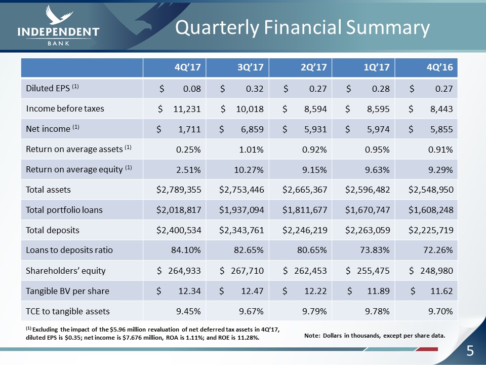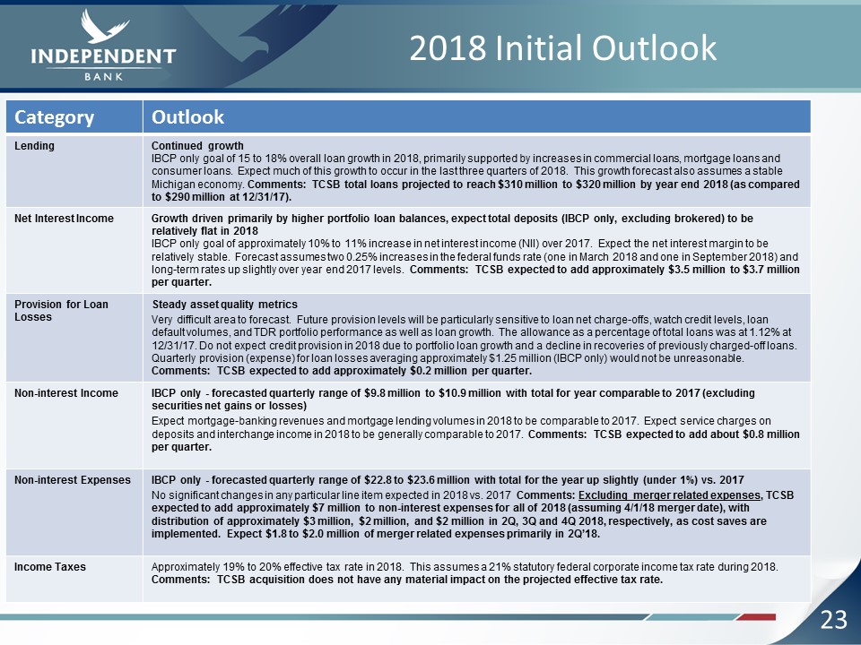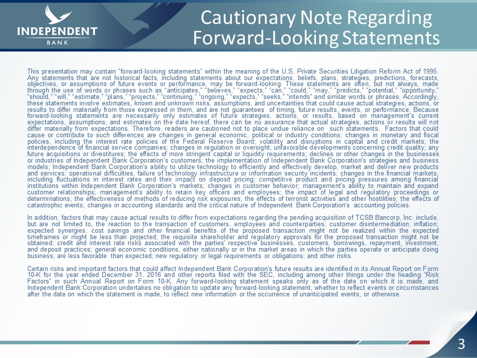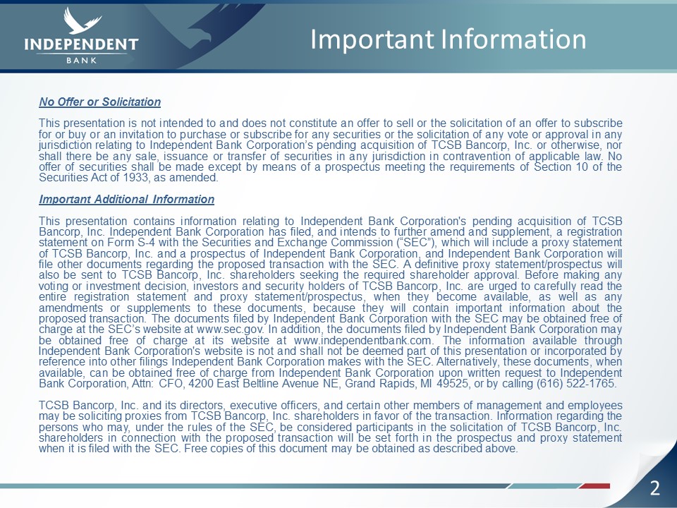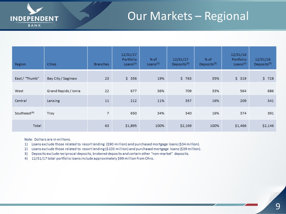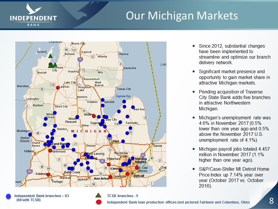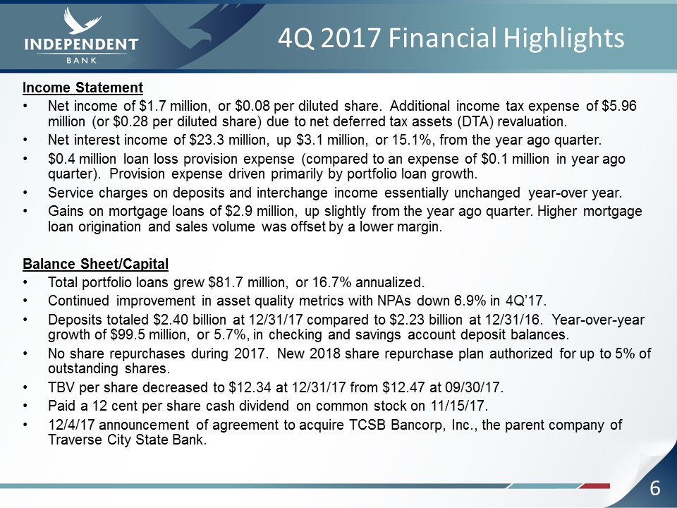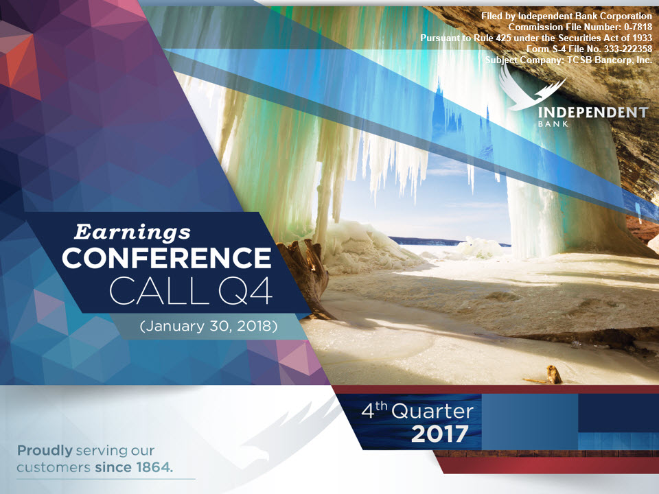 3 Cautionary Note Regarding Forward-Looking Statements This presentation may contain “forward-looking statements” within the meaning of the U.S. Private Securities Litigation Reform Act of 1995. Any statements that are not historical facts, including statements about our expectations, beliefs, plans, strategies, predictions, forecasts, objectives, or assumptions of future events or performance, may be forward-looking. These statements are often, but not always, made through the use of words or phrases such as “anticipates,” “believes,” “expects,” “can,” “could,” “may,” “predicts,” “potential,” “opportunity,” “should,” “will,” “estimate,” “plans,” “projects,” “continuing,” “ongoing,” “expects,” “seeks,” “intends” and similar words or phrases. Accordingly, these statements involve estimates, known and unknown risks, assumptions, and uncertainties that could cause actual strategies, actions, or results to differ materially from those expressed in them, and are not guarantees of timing, future results, events, or performance. Because forward-looking statements are necessarily only estimates of future strategies, actions, or results, based on management’s current expectations, assumptions, and estimates on the date hereof, there can be no assurance that actual strategies, actions or results will not differ materially from expectations. Therefore, readers are cautioned not to place undue reliance on such statements. Factors that could cause or contribute to such differences are changes in general economic, political or industry conditions; changes in monetary and fiscal policies, including the interest rate policies of the Federal Reserve Board; volatility and disruptions in capital and credit markets; the interdependence of financial service companies; changes in regulation or oversight; unfavorable developments concerning credit quality; any future acquisitions or divestitures; the effects of more stringent capital or liquidity requirements; declines or other changes in the businesses or industries of Independent Bank Corporation's customers; the implementation of Independent Bank Corporation's strategies and business models; Independent Bank Corporation's ability to utilize technology to efficiently and effectively develop, market and deliver new products and services; operational difficulties, failure of technology infrastructure or information security incidents; changes in the financial markets, including fluctuations in interest rates and their impact on deposit pricing; competitive product and pricing pressures among financial institutions within Independent Bank Corporation's markets; changes in customer behavior; management's ability to maintain and expand customer relationships; management's ability to retain key officers and employees; the impact of legal and regulatory proceedings or determinations; the effectiveness of methods of reducing risk exposures; the effects of terrorist activities and other hostilities; the effects of catastrophic events; changes in accounting standards and the critical nature of Independent Bank Corporation's accounting policies. In addition, factors that may cause actual results to differ from expectations regarding the pending acquisition of TCSB Bancorp, Inc. include, but are not limited to, the reaction to the transaction of customers, employees and counterparties; customer disintermediation; inflation; expected synergies, cost savings and other financial benefits of the proposed transaction might not be realized within the expected timeframes or might be less than projected; the requisite shareholder and regulatory approvals for the proposed transaction might not be obtained; credit and interest rate risks associated with the parties' respective businesses, customers, borrowings, repayment, investment, and deposit practices; general economic conditions, either nationally or in the market areas in which the parties operate or anticipate doing business, are less favorable than expected; new regulatory or legal requirements or obligations; and other risks. Certain risks and important factors that could affect Independent Bank Corporation's future results are identified in its Annual Report on Form 10-K for the year ended December 31, 2016 and other reports filed with the SEC, including among other things under the heading “Risk Factors” in such Annual Report on Form 10-K. Any forward-looking statement speaks only as of the date on which it is made, and Independent Bank Corporation undertakes no obligation to update any forward-looking statement, whether to reflect events or circumstances after the date on which the statement is made, to reflect new information or the occurrence of unanticipated events, or otherwise.