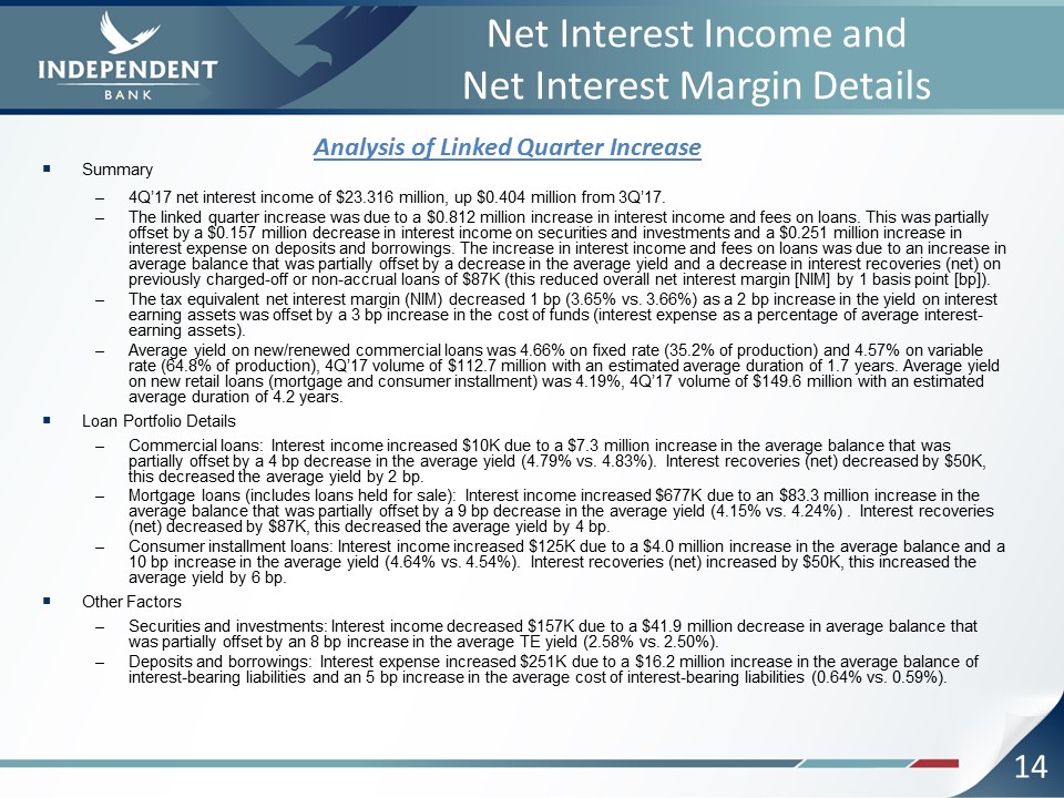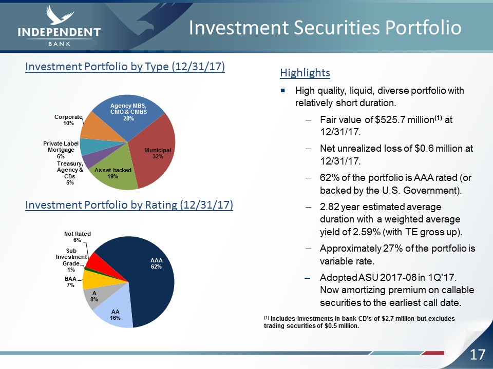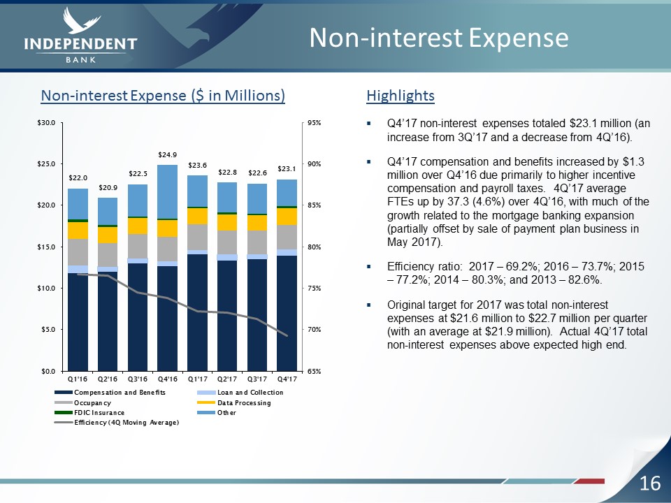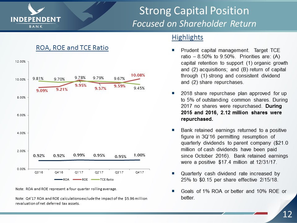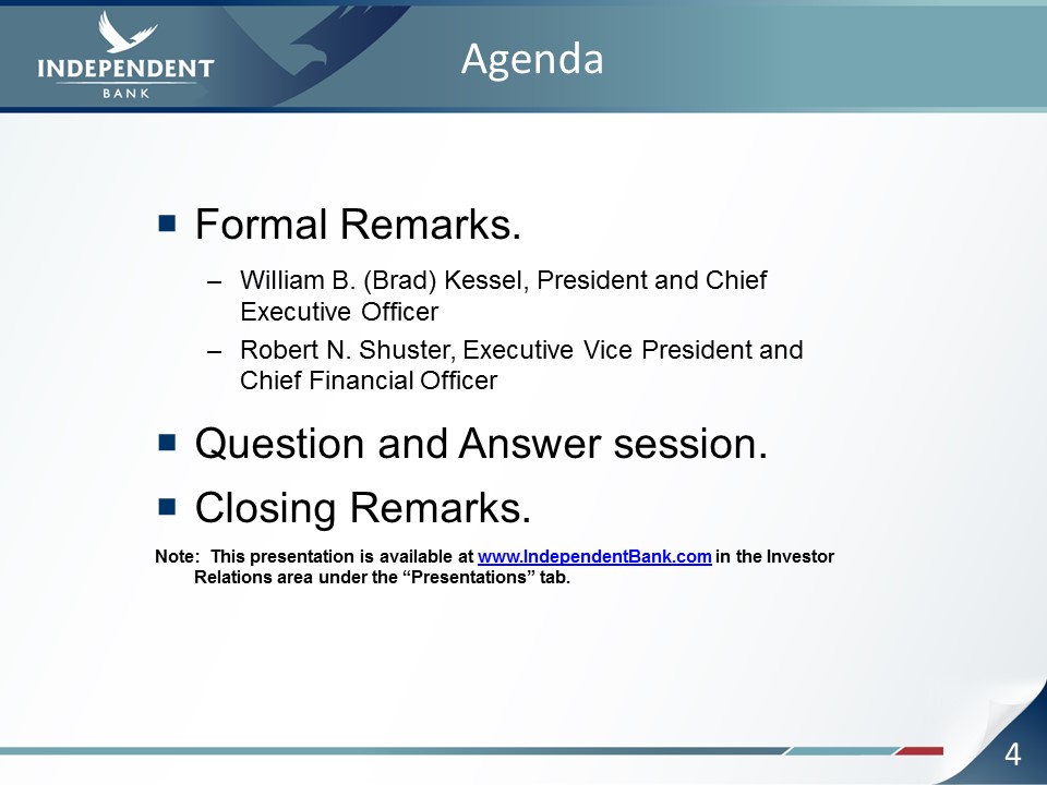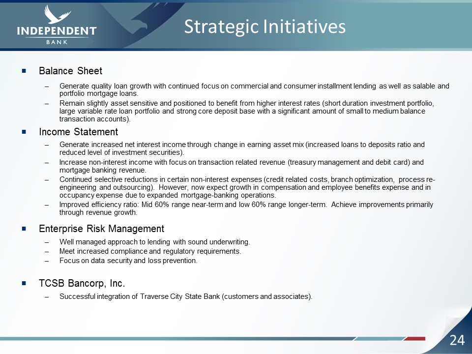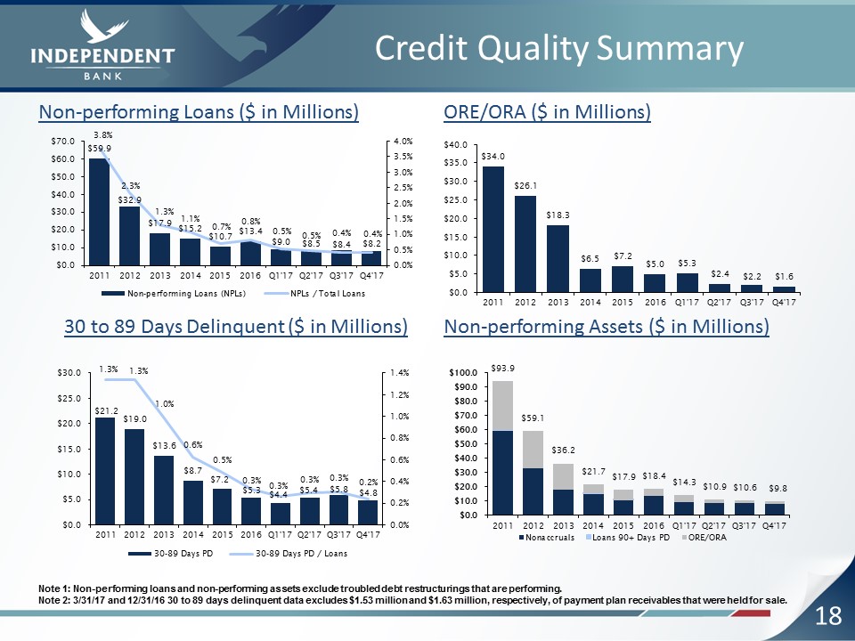 3 Cautionary Note Regarding Forward-Looking Statements This presentation may contain “forward-looking statements” within the meaning of the U.S. Private Securities Litigation Reform Act of 1995. Any statements that are not historical facts, including statements about our expectations, beliefs, plans, strategies, predictions, forecasts, objectives, or assumptions of future events or performance, may be forward-looking. These statements are often, but not always, made through the use of words or phrases such as “anticipates,” “believes,” “expects,” “can,” “could,” “may,” “predicts,” “potential,” “opportunity,” “should,” “will,” “estimate,” “plans,” “projects,” “continuing,” “ongoing,” “expects,” “seeks,” “intends” and similar words or phrases. Accordingly, these statements involve estimates, known and unknown risks, assumptions, and uncertainties that could cause actual strategies, actions, or results to differ materially from those expressed in them, and are not guarantees of timing, future results, events, or performance. Because forward-looking statements are necessarily only estimates of future strategies, actions, or results, based on management’s current expectations, assumptions, and estimates on the date hereof, there can be no assurance that actual strategies, actions or results will not differ materially from expectations. Therefore, readers are cautioned not to place undue reliance on such statements. Factors that could cause or contribute to such differences are changes in general economic, political or industry conditions; changes in monetary and fiscal policies, including the interest rate policies of the Federal Reserve Board; volatility and disruptions in capital and credit markets; the interdependence of financial service companies; changes in regulation or oversight; unfavorable developments concerning credit quality; any future acquisitions or divestitures; the effects of more stringent capital or liquidity requirements; declines or other changes in the businesses or industries of Independent Bank Corporation's customers; the implementation of Independent Bank Corporation's strategies and business models; Independent Bank Corporation's ability to utilize technology to efficiently and effectively develop, market and deliver new products and services; operational difficulties, failure of technology infrastructure or information security incidents; changes in the financial markets, including fluctuations in interest rates and their impact on deposit pricing; competitive product and pricing pressures among financial institutions within Independent Bank Corporation's markets; changes in customer behavior; management's ability to maintain and expand customer relationships; management's ability to retain key officers and employees; the impact of legal and regulatory proceedings or determinations; the effectiveness of methods of reducing risk exposures; the effects of terrorist activities and other hostilities; the effects of catastrophic events; changes in accounting standards and the critical nature of Independent Bank Corporation's accounting policies. In addition, factors that may cause actual results to differ from expectations regarding the pending acquisition of TCSB Bancorp, Inc. include, but are not limited to, the reaction to the transaction of customers, employees and counterparties; customer disintermediation; inflation; expected synergies, cost savings and other financial benefits of the proposed transaction might not be realized within the expected timeframes or might be less than projected; the requisite shareholder and regulatory approvals for the proposed transaction might not be obtained; credit and interest rate risks associated with the parties' respective businesses, customers, borrowings, repayment, investment, and deposit practices; general economic conditions, either nationally or in the market areas in which the parties operate or anticipate doing business, are less favorable than expected; new regulatory or legal requirements or obligations; and other risks. Certain risks and important factors that could affect Independent Bank Corporation's future results are identified in its Annual Report on Form 10-K for the year ended December 31, 2016 and other reports filed with the SEC, including among other things under the heading “Risk Factors” in such Annual Report on Form 10-K. Any forward-looking statement speaks only as of the date on which it is made, and Independent Bank Corporation undertakes no obligation to update any forward-looking statement, whether to reflect events or circumstances after the date on which the statement is made, to reflect new information or the occurrence of unanticipated events, or otherwise.
