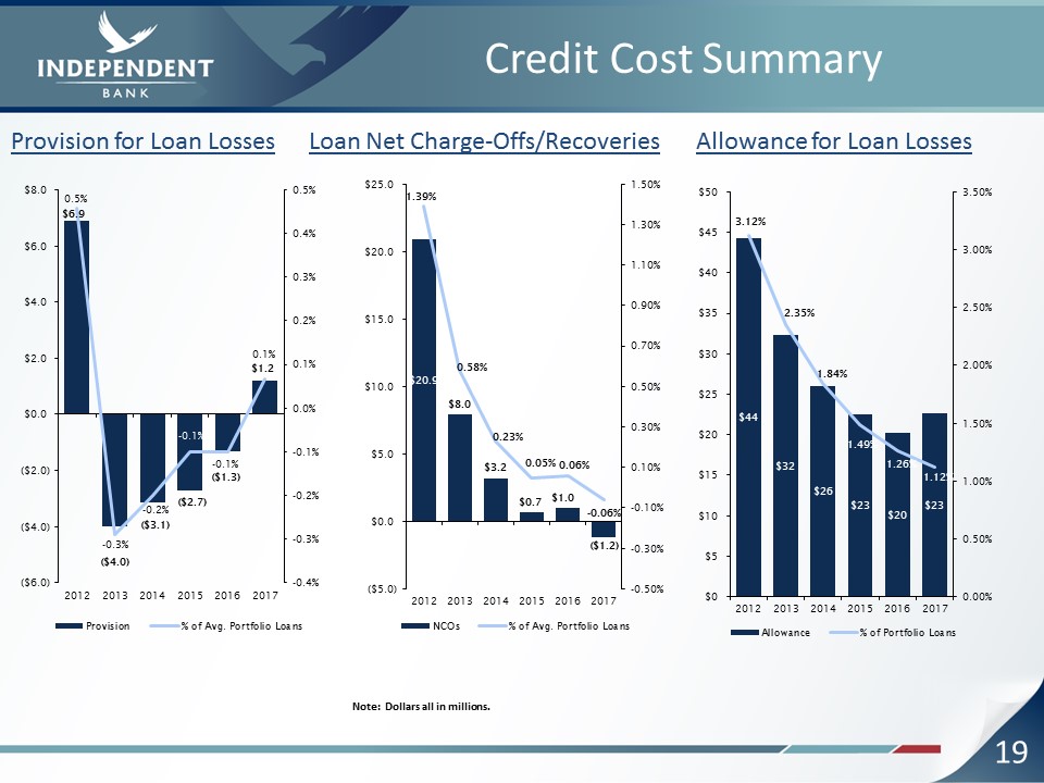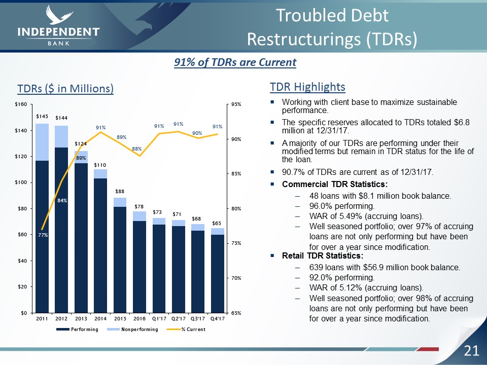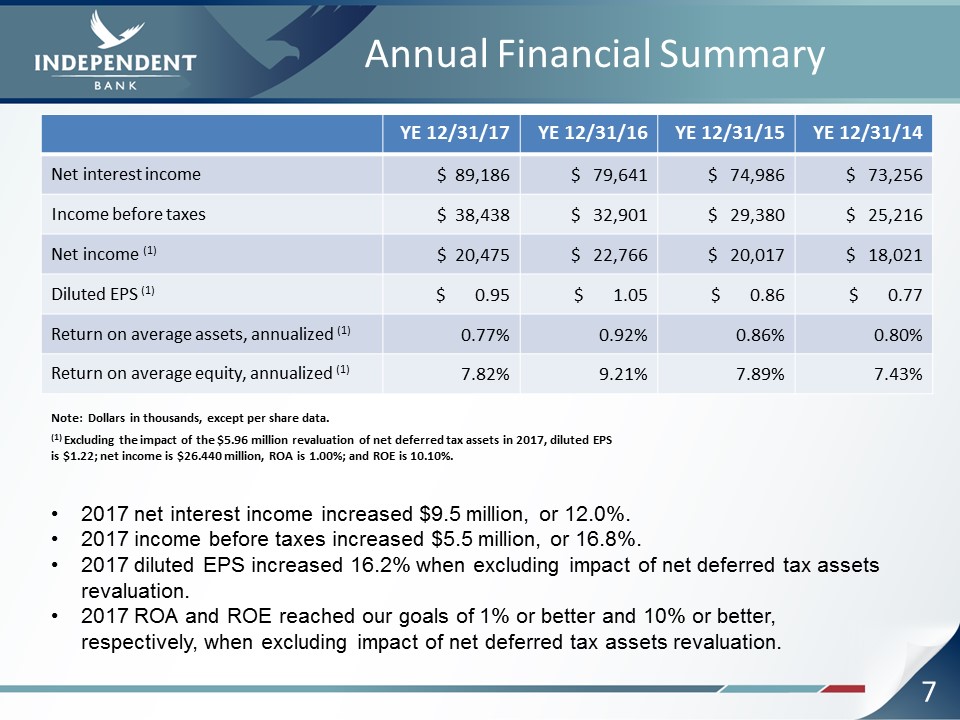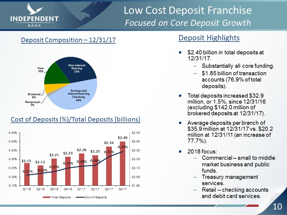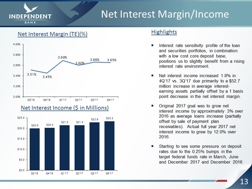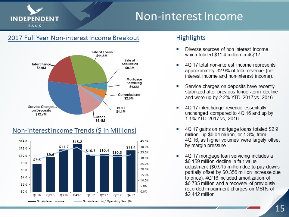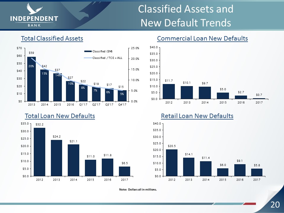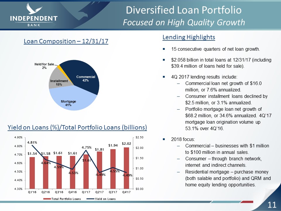 3 Cautionary Note Regarding Forward-Looking Statements This presentation may contain “forward-looking statements” within the meaning of the U.S. Private Securities Litigation Reform Act of 1995. Any statements that are not historical facts, including statements about our expectations, beliefs, plans, strategies, predictions, forecasts, objectives, or assumptions of future events or performance, may be forward-looking. These statements are often, but not always, made through the use of words or phrases such as “anticipates,” “believes,” “expects,” “can,” “could,” “may,” “predicts,” “potential,” “opportunity,” “should,” “will,” “estimate,” “plans,” “projects,” “continuing,” “ongoing,” “expects,” “seeks,” “intends” and similar words or phrases. Accordingly, these statements involve estimates, known and unknown risks, assumptions, and uncertainties that could cause actual strategies, actions, or results to differ materially from those expressed in them, and are not guarantees of timing, future results, events, or performance. Because forward-looking statements are necessarily only estimates of future strategies, actions, or results, based on management’s current expectations, assumptions, and estimates on the date hereof, there can be no assurance that actual strategies, actions or results will not differ materially from expectations. Therefore, readers are cautioned not to place undue reliance on such statements. Factors that could cause or contribute to such differences are changes in general economic, political or industry conditions; changes in monetary and fiscal policies, including the interest rate policies of the Federal Reserve Board; volatility and disruptions in capital and credit markets; the interdependence of financial service companies; changes in regulation or oversight; unfavorable developments concerning credit quality; any future acquisitions or divestitures; the effects of more stringent capital or liquidity requirements; declines or other changes in the businesses or industries of Independent Bank Corporation's customers; the implementation of Independent Bank Corporation's strategies and business models; Independent Bank Corporation's ability to utilize technology to efficiently and effectively develop, market and deliver new products and services; operational difficulties, failure of technology infrastructure or information security incidents; changes in the financial markets, including fluctuations in interest rates and their impact on deposit pricing; competitive product and pricing pressures among financial institutions within Independent Bank Corporation's markets; changes in customer behavior; management's ability to maintain and expand customer relationships; management's ability to retain key officers and employees; the impact of legal and regulatory proceedings or determinations; the effectiveness of methods of reducing risk exposures; the effects of terrorist activities and other hostilities; the effects of catastrophic events; changes in accounting standards and the critical nature of Independent Bank Corporation's accounting policies. In addition, factors that may cause actual results to differ from expectations regarding the pending acquisition of TCSB Bancorp, Inc. include, but are not limited to, the reaction to the transaction of customers, employees and counterparties; customer disintermediation; inflation; expected synergies, cost savings and other financial benefits of the proposed transaction might not be realized within the expected timeframes or might be less than projected; the requisite shareholder and regulatory approvals for the proposed transaction might not be obtained; credit and interest rate risks associated with the parties' respective businesses, customers, borrowings, repayment, investment, and deposit practices; general economic conditions, either nationally or in the market areas in which the parties operate or anticipate doing business, are less favorable than expected; new regulatory or legal requirements or obligations; and other risks. Certain risks and important factors that could affect Independent Bank Corporation's future results are identified in its Annual Report on Form 10-K for the year ended December 31, 2016 and other reports filed with the SEC, including among other things under the heading “Risk Factors” in such Annual Report on Form 10-K. Any forward-looking statement speaks only as of the date on which it is made, and Independent Bank Corporation undertakes no obligation to update any forward-looking statement, whether to reflect events or circumstances after the date on which the statement is made, to reflect new information or the occurrence of unanticipated events, or otherwise.
