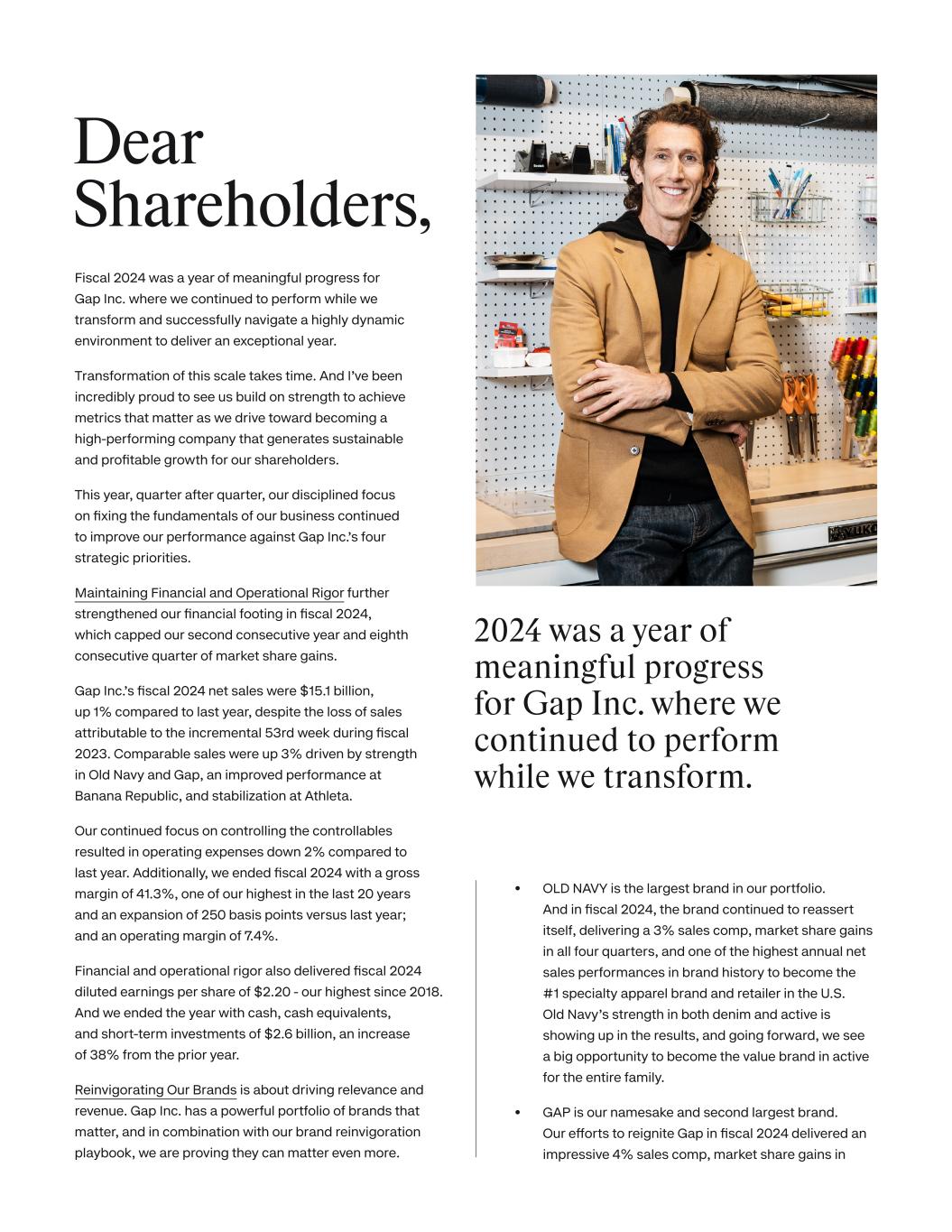 Dear Shareholders, Fiscal 2024 was a year of meaningful progress for Gap Inc. where we continued to perform while we transform and successfully navigate a highly dynamic environment to deliver an exceptional year. Transformation of this scale takes time. And I’ve been incredibly proud to see us build on strength to achieve metrics that matter as we drive toward becoming a high-performing company that generates sustainable and profitable growth for our shareholders. This year, quarter after quarter, our disciplined focus on fixing the fundamentals of our business continued to improve our performance against Gap Inc.’s four strategic priorities. Maintaining Financial and Operational Rigor further strengthened our financial footing in fiscal 2024, which capped our second consecutive year and eighth consecutive quarter of market share gains. Gap Inc.’s fiscal 2024 net sales were $15.1 billion, up 1% compared to last year, despite the loss of sales attributable to the incremental 53rd week during fiscal 2023. Comparable sales were up 3% driven by strength in Old Navy and Gap, an improved performance at Banana Republic, and stabilization at Athleta. Our continued focus on controlling the controllables resulted in operating expenses down 2% compared to last year. Additionally, we ended fiscal 2024 with a gross margin of 41.3%, one of our highest in the last 20 years and an expansion of 250 basis points versus last year; and an operating margin of 7.4%. Financial and operational rigor also delivered fiscal 2024 diluted earnings per share of $2.20 - our highest since 2018. And we ended the year with cash, cash equivalents, and short-term investments of $2.6 billion, an increase of 38% from the prior year. Reinvigorating Our Brands is about driving relevance and revenue. Gap Inc. has a powerful portfolio of brands that matter, and in combination with our brand reinvigoration playbook, we are proving they can matter even more. • OLD NAVY is the largest brand in our portfolio. And in fiscal 2024, the brand continued to reassert itself, delivering a 3% sales comp, market share gains in all four quarters, and one of the highest annual net sales performances in brand history to become the #1 specialty apparel brand and retailer in the U.S. Old Navy’s strength in both denim and active is showing up in the results, and going forward, we see a big opportunity to become the value brand in active for the entire family. • GAP is our namesake and second largest brand. Our efforts to reignite Gap in fiscal 2024 delivered an impressive 4% sales comp, market share gains in 2024 was a year of meaningful progress for Gap Inc. where we continued to perform while we transform.