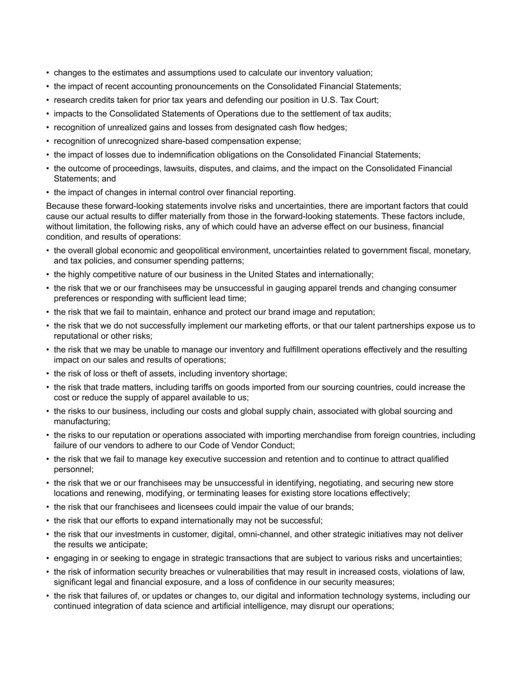 • changes to the estimates and assumptions used to calculate our inventory valuation; • the impact of recent accounting pronouncements on the Consolidated Financial Statements; • research credits taken for prior tax years and defending our position in U.S. Tax Court; • impacts to the Consolidated Statements of Operations due to the settlement of tax audits; • recognition of unrealized gains and losses from designated cash flow hedges; • recognition of unrecognized share-based compensation expense; • the impact of losses due to indemnification obligations on the Consolidated Financial Statements; • the outcome of proceedings, lawsuits, disputes, and claims, and the impact on the Consolidated Financial Statements; and • the impact of changes in internal control over financial reporting. Because these forward-looking statements involve risks and uncertainties, there are important factors that could cause our actual results to differ materially from those in the forward-looking statements. These factors include, without limitation, the following risks, any of which could have an adverse effect on our business, financial condition, and results of operations: • the overall global economic and geopolitical environment, uncertainties related to government fiscal, monetary, and tax policies, and consumer spending patterns; • the highly competitive nature of our business in the United States and internationally; • the risk that we or our franchisees may be unsuccessful in gauging apparel trends and changing consumer preferences or responding with sufficient lead time; • the risk that we fail to maintain, enhance and protect our brand image and reputation; • the risk that we do not successfully implement our marketing efforts, or that our talent partnerships expose us to reputational or other risks; • the risk that we may be unable to manage our inventory and fulfillment operations effectively and the resulting impact on our sales and results of operations; • the risk of loss or theft of assets, including inventory shortage; • the risk that trade matters, including tariffs on goods imported from our sourcing countries, could increase the cost or reduce the supply of apparel available to us; • the risks to our business, including our costs and global supply chain, associated with global sourcing and manufacturing; • the risks to our reputation or operations associated with importing merchandise from foreign countries, including failure of our vendors to adhere to our Code of Vendor Conduct; • the risk that we fail to manage key executive succession and retention and to continue to attract qualified personnel; • the risk that we or our franchisees may be unsuccessful in identifying, negotiating, and securing new store locations and renewing, modifying, or terminating leases for existing store locations effectively; • the risk that our franchisees and licensees could impair the value of our brands; • the risk that our efforts to expand internationally may not be successful; • the risk that our investments in customer, digital, omni-channel, and other strategic initiatives may not deliver the results we anticipate; • engaging in or seeking to engage in strategic transactions that are subject to various risks and uncertainties; • the risk of information security breaches or vulnerabilities that may result in increased costs, violations of law, significant legal and financial exposure, and a loss of confidence in our security measures; • the risk that failures of, or updates or changes to, our digital and information technology systems, including our continued integration of data science and artificial intelligence, may disrupt our operations;