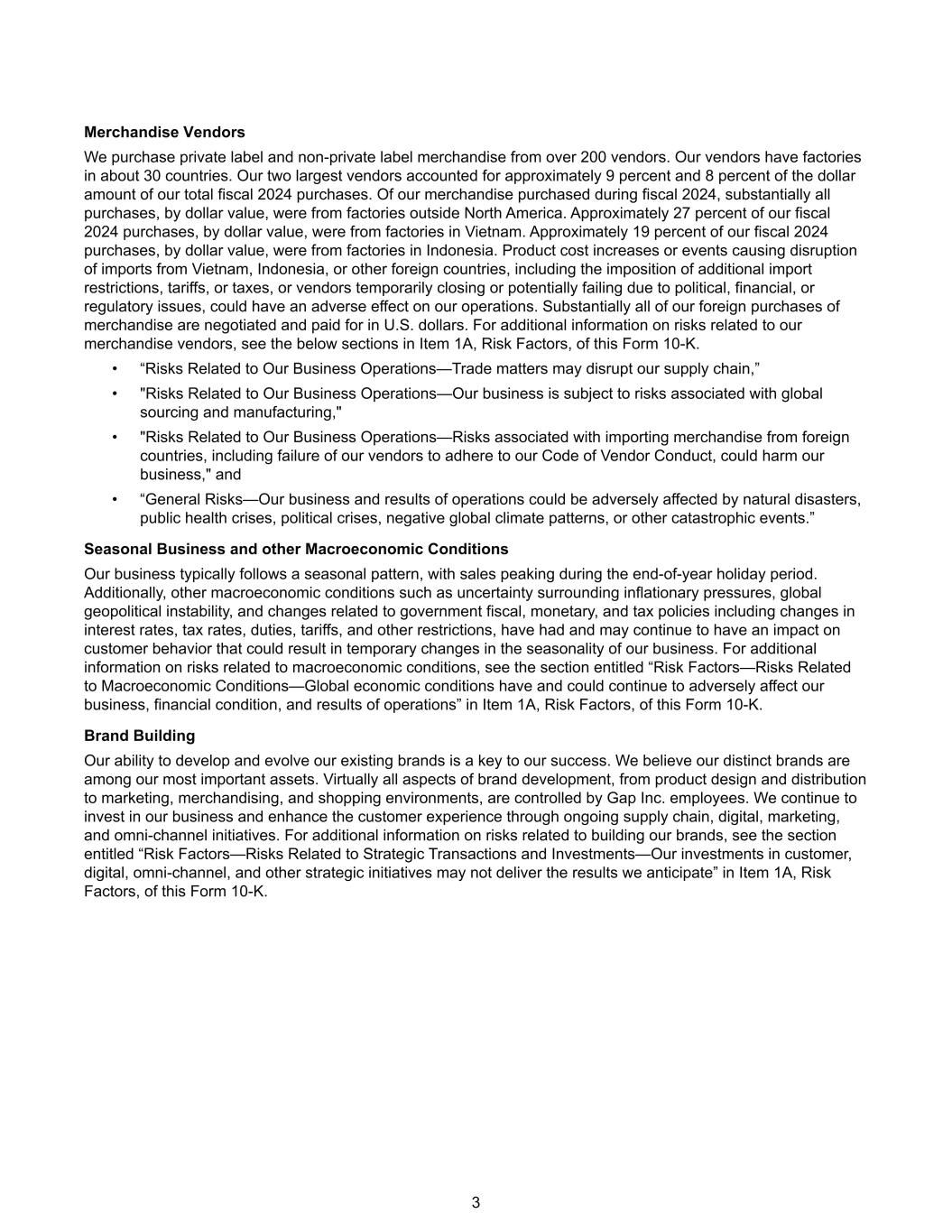 Merchandise Vendors We purchase private label and non-private label merchandise from over 200 vendors. Our vendors have factories in about 30 countries. Our two largest vendors accounted for approximately 9 percent and 8 percent of the dollar amount of our total fiscal 2024 purchases. Of our merchandise purchased during fiscal 2024, substantially all purchases, by dollar value, were from factories outside North America. Approximately 27 percent of our fiscal 2024 purchases, by dollar value, were from factories in Vietnam. Approximately 19 percent of our fiscal 2024 purchases, by dollar value, were from factories in Indonesia. Product cost increases or events causing disruption of imports from Vietnam, Indonesia, or other foreign countries, including the imposition of additional import restrictions, tariffs, or taxes, or vendors temporarily closing or potentially failing due to political, financial, or regulatory issues, could have an adverse effect on our operations. Substantially all of our foreign purchases of merchandise are negotiated and paid for in U.S. dollars. For additional information on risks related to our merchandise vendors, see the below sections in Item 1A, Risk Factors, of this Form 10-K. • “Risks Related to Our Business Operations—Trade matters may disrupt our supply chain,” • "Risks Related to Our Business Operations—Our business is subject to risks associated with global sourcing and manufacturing," • "Risks Related to Our Business Operations—Risks associated with importing merchandise from foreign countries, including failure of our vendors to adhere to our Code of Vendor Conduct, could harm our business," and • “General Risks—Our business and results of operations could be adversely affected by natural disasters, public health crises, political crises, negative global climate patterns, or other catastrophic events.” Seasonal Business and other Macroeconomic Conditions Our business typically follows a seasonal pattern, with sales peaking during the end-of-year holiday period. Additionally, other macroeconomic conditions such as uncertainty surrounding inflationary pressures, global geopolitical instability, and changes related to government fiscal, monetary, and tax policies including changes in interest rates, tax rates, duties, tariffs, and other restrictions, have had and may continue to have an impact on customer behavior that could result in temporary changes in the seasonality of our business. For additional information on risks related to macroeconomic conditions, see the section entitled “Risk Factors—Risks Related to Macroeconomic Conditions—Global economic conditions have and could continue to adversely affect our business, financial condition, and results of operations” in Item 1A, Risk Factors, of this Form 10-K. Brand Building Our ability to develop and evolve our existing brands is a key to our success. We believe our distinct brands are among our most important assets. Virtually all aspects of brand development, from product design and distribution to marketing, merchandising, and shopping environments, are controlled by Gap Inc. employees. We continue to invest in our business and enhance the customer experience through ongoing supply chain, digital, marketing, and omni-channel initiatives. For additional information on risks related to building our brands, see the section entitled “Risk Factors—Risks Related to Strategic Transactions and Investments—Our investments in customer, digital, omni-channel, and other strategic initiatives may not deliver the results we anticipate” in Item 1A, Risk Factors, of this Form 10-K. 3