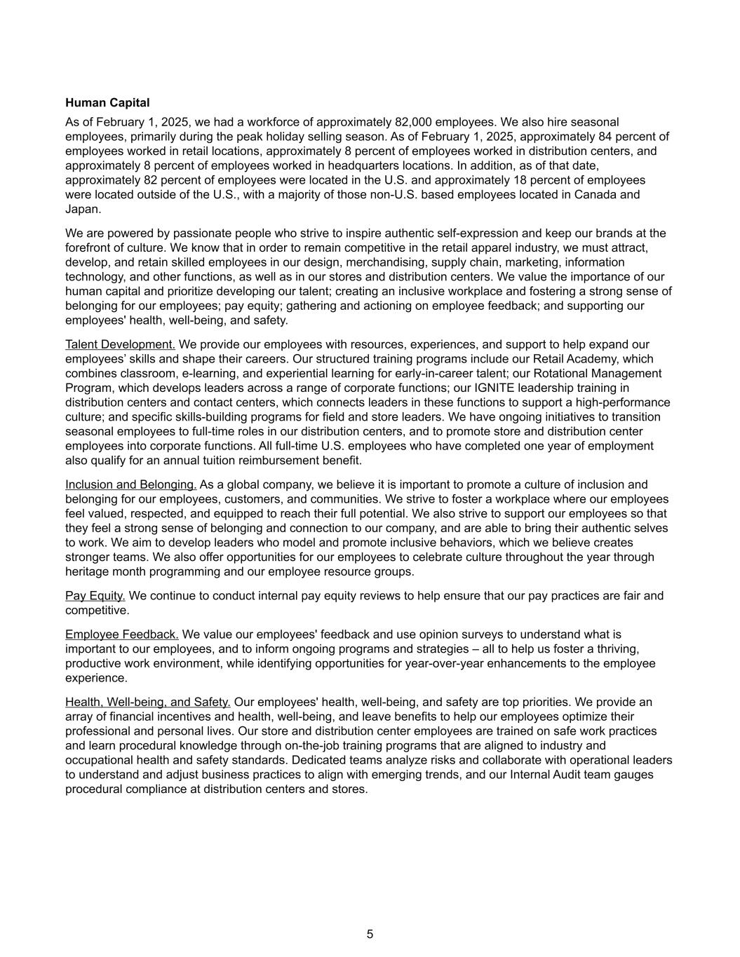 Human Capital As of February 1, 2025, we had a workforce of approximately 82,000 employees. We also hire seasonal employees, primarily during the peak holiday selling season. As of February 1, 2025, approximately 84 percent of employees worked in retail locations, approximately 8 percent of employees worked in distribution centers, and approximately 8 percent of employees worked in headquarters locations. In addition, as of that date, approximately 82 percent of employees were located in the U.S. and approximately 18 percent of employees were located outside of the U.S., with a majority of those non-U.S. based employees located in Canada and Japan. We are powered by passionate people who strive to inspire authentic self-expression and keep our brands at the forefront of culture. We know that in order to remain competitive in the retail apparel industry, we must attract, develop, and retain skilled employees in our design, merchandising, supply chain, marketing, information technology, and other functions, as well as in our stores and distribution centers. We value the importance of our human capital and prioritize developing our talent; creating an inclusive workplace and fostering a strong sense of belonging for our employees; pay equity; gathering and actioning on employee feedback; and supporting our employees' health, well-being, and safety. Talent Development. We provide our employees with resources, experiences, and support to help expand our employees’ skills and shape their careers. Our structured training programs include our Retail Academy, which combines classroom, e-learning, and experiential learning for early-in-career talent; our Rotational Management Program, which develops leaders across a range of corporate functions; our IGNITE leadership training in distribution centers and contact centers, which connects leaders in these functions to support a high-performance culture; and specific skills-building programs for field and store leaders. We have ongoing initiatives to transition seasonal employees to full-time roles in our distribution centers, and to promote store and distribution center employees into corporate functions. All full-time U.S. employees who have completed one year of employment also qualify for an annual tuition reimbursement benefit. Inclusion and Belonging. As a global company, we believe it is important to promote a culture of inclusion and belonging for our employees, customers, and communities. We strive to foster a workplace where our employees feel valued, respected, and equipped to reach their full potential. We also strive to support our employees so that they feel a strong sense of belonging and connection to our company, and are able to bring their authentic selves to work. We aim to develop leaders who model and promote inclusive behaviors, which we believe creates stronger teams. We also offer opportunities for our employees to celebrate culture throughout the year through heritage month programming and our employee resource groups. Pay Equity. We continue to conduct internal pay equity reviews to help ensure that our pay practices are fair and competitive. Employee Feedback. We value our employees' feedback and use opinion surveys to understand what is important to our employees, and to inform ongoing programs and strategies – all to help us foster a thriving, productive work environment, while identifying opportunities for year-over-year enhancements to the employee experience. Health, Well-being, and Safety. Our employees' health, well-being, and safety are top priorities. We provide an array of financial incentives and health, well-being, and leave benefits to help our employees optimize their professional and personal lives. Our store and distribution center employees are trained on safe work practices and learn procedural knowledge through on-the-job training programs that are aligned to industry and occupational health and safety standards. Dedicated teams analyze risks and collaborate with operational leaders to understand and adjust business practices to align with emerging trends, and our Internal Audit team gauges procedural compliance at distribution centers and stores. 5
