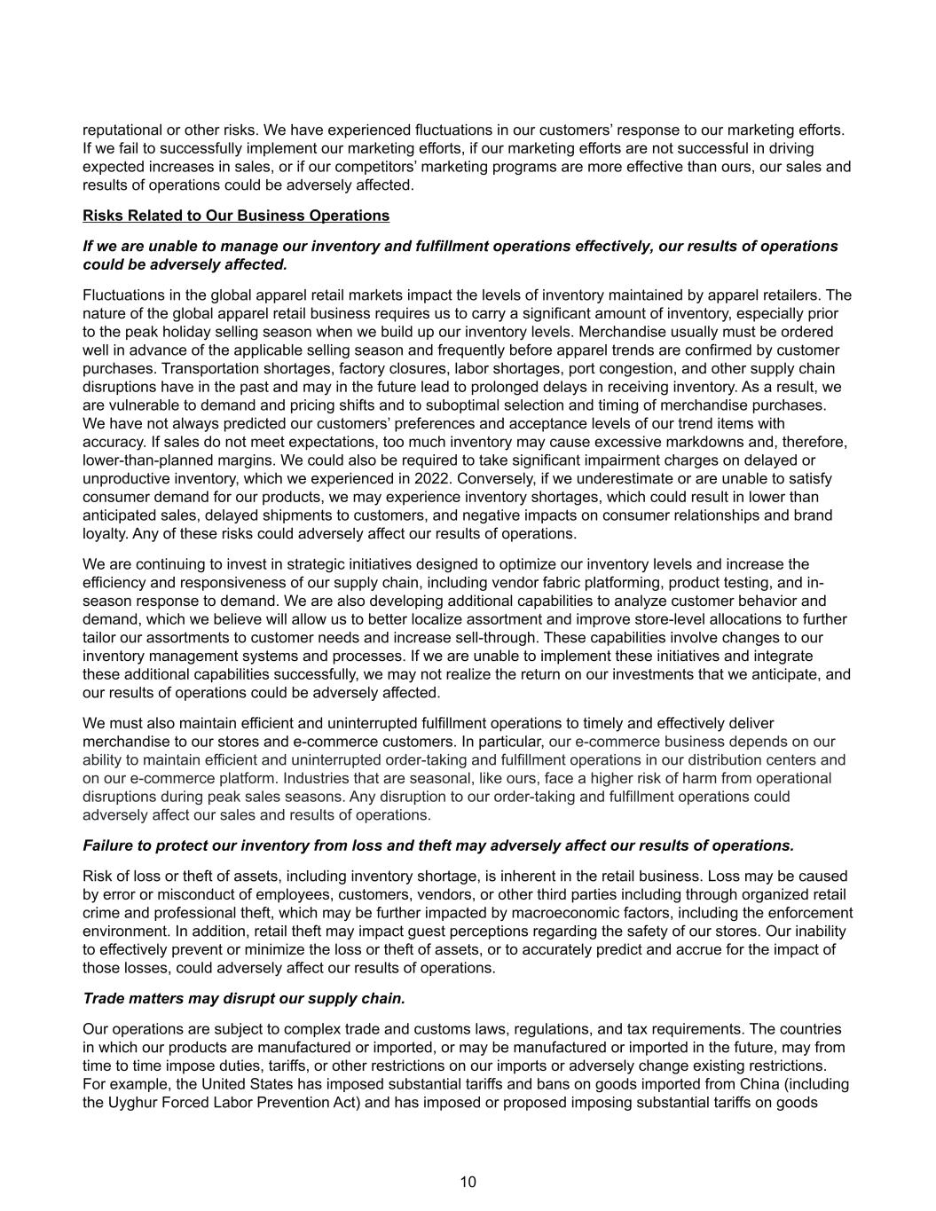 reputational or other risks. We have experienced fluctuations in our customers’ response to our marketing efforts. If we fail to successfully implement our marketing efforts, if our marketing efforts are not successful in driving expected increases in sales, or if our competitors’ marketing programs are more effective than ours, our sales and results of operations could be adversely affected. Risks Related to Our Business Operations If we are unable to manage our inventory and fulfillment operations effectively, our results of operations could be adversely affected. Fluctuations in the global apparel retail markets impact the levels of inventory maintained by apparel retailers. The nature of the global apparel retail business requires us to carry a significant amount of inventory, especially prior to the peak holiday selling season when we build up our inventory levels. Merchandise usually must be ordered well in advance of the applicable selling season and frequently before apparel trends are confirmed by customer purchases. Transportation shortages, factory closures, labor shortages, port congestion, and other supply chain disruptions have in the past and may in the future lead to prolonged delays in receiving inventory. As a result, we are vulnerable to demand and pricing shifts and to suboptimal selection and timing of merchandise purchases. We have not always predicted our customers’ preferences and acceptance levels of our trend items with accuracy. If sales do not meet expectations, too much inventory may cause excessive markdowns and, therefore, lower-than-planned margins. We could also be required to take significant impairment charges on delayed or unproductive inventory, which we experienced in 2022. Conversely, if we underestimate or are unable to satisfy consumer demand for our products, we may experience inventory shortages, which could result in lower than anticipated sales, delayed shipments to customers, and negative impacts on consumer relationships and brand loyalty. Any of these risks could adversely affect our results of operations. We are continuing to invest in strategic initiatives designed to optimize our inventory levels and increase the efficiency and responsiveness of our supply chain, including vendor fabric platforming, product testing, and in- season response to demand. We are also developing additional capabilities to analyze customer behavior and demand, which we believe will allow us to better localize assortment and improve store-level allocations to further tailor our assortments to customer needs and increase sell-through. These capabilities involve changes to our inventory management systems and processes. If we are unable to implement these initiatives and integrate these additional capabilities successfully, we may not realize the return on our investments that we anticipate, and our results of operations could be adversely affected. We must also maintain efficient and uninterrupted fulfillment operations to timely and effectively deliver merchandise to our stores and e-commerce customers. In particular, our e-commerce business depends on our ability to maintain efficient and uninterrupted order-taking and fulfillment operations in our distribution centers and on our e-commerce platform. Industries that are seasonal, like ours, face a higher risk of harm from operational disruptions during peak sales seasons. Any disruption to our order-taking and fulfillment operations could adversely affect our sales and results of operations. Failure to protect our inventory from loss and theft may adversely affect our results of operations. Risk of loss or theft of assets, including inventory shortage, is inherent in the retail business. Loss may be caused by error or misconduct of employees, customers, vendors, or other third parties including through organized retail crime and professional theft, which may be further impacted by macroeconomic factors, including the enforcement environment. In addition, retail theft may impact guest perceptions regarding the safety of our stores. Our inability to effectively prevent or minimize the loss or theft of assets, or to accurately predict and accrue for the impact of those losses, could adversely affect our results of operations. Trade matters may disrupt our supply chain. Our operations are subject to complex trade and customs laws, regulations, and tax requirements. The countries in which our products are manufactured or imported, or may be manufactured or imported in the future, may from time to time impose duties, tariffs, or other restrictions on our imports or adversely change existing restrictions. For example, the United States has imposed substantial tariffs and bans on goods imported from China (including the Uyghur Forced Labor Prevention Act) and has imposed or proposed imposing substantial tariffs on goods 10