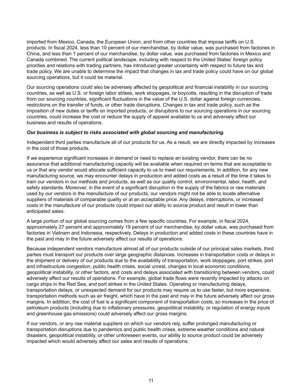 imported from Mexico, Canada, the European Union, and from other countries that impose tariffs on U.S. products. In fiscal 2024, less than 10 percent of our merchandise, by dollar value, was purchased from factories in China, and less than 1 percent of our merchandise, by dollar value, was purchased from factories in Mexico and Canada combined. The current political landscape, including with respect to the United States’ foreign policy priorities and relations with trading partners, has introduced greater uncertainty with respect to future tax and trade policy. We are unable to determine the impact that changes in tax and trade policy could have on our global sourcing operations, but it could be material. Our sourcing operations could also be adversely affected by geopolitical and financial instability in our sourcing countries, as well as U.S. or foreign labor strikes, work stoppages, or boycotts, resulting in the disruption of trade from our sourcing countries, significant fluctuations in the value of the U.S. dollar against foreign currencies, restrictions on the transfer of funds, or other trade disruptions. Changes in tax and trade policy, such as the imposition of new duties or tariffs on imported products, or disruptions to our sourcing operations in our sourcing countries, could increase the cost or reduce the supply of apparel available to us and adversely affect our business and results of operations. Our business is subject to risks associated with global sourcing and manufacturing. Independent third parties manufacture all of our products for us. As a result, we are directly impacted by increases in the cost of those products. If we experience significant increases in demand or need to replace an existing vendor, there can be no assurance that additional manufacturing capacity will be available when required on terms that are acceptable to us or that any vendor would allocate sufficient capacity to us to meet our requirements. In addition, for any new manufacturing source, we may encounter delays in production and added costs as a result of the time it takes to train our vendors in our methods and products, as well as our quality control, environmental, labor, health, and safety standards. Moreover, in the event of a significant disruption in the supply of the fabrics or raw materials used by our vendors in the manufacture of our products, our vendors might not be able to locate alternative suppliers of materials of comparable quality or at an acceptable price. Any delays, interruptions, or increased costs in the manufacture of our products could impact our ability to source product and result in lower than anticipated sales. A large portion of our global sourcing comes from a few specific countries. For example, in fiscal 2024, approximately 27 percent and approximately 19 percent of our merchandise, by dollar value, was purchased from factories in Vietnam and Indonesia, respectively. Delays in production and added costs in these countries have in the past and may in the future adversely affect our results of operations. Because independent vendors manufacture almost all of our products outside of our principal sales markets, third parties must transport our products over large geographic distances. Increases in transportation costs or delays in the shipment or delivery of our products due to the availability of transportation, work stoppages, port strikes, port and infrastructure congestion, public health crises, social unrest, changes in local economic conditions, geopolitical instability, or other factors, and costs and delays associated with transitioning between vendors, could adversely affect our results of operations. For example, global trade flows were recently impacted by attacks on cargo ships in the Red Sea, and port strikes in the United States. Operating or manufacturing delays, transportation delays, or unexpected demand for our products may require us to use faster, but more expensive, transportation methods such as air freight, which have in the past and may in the future adversely affect our gross margins. In addition, the cost of fuel is a significant component of transportation costs, so increases in the price of petroleum products (including due to inflationary pressures, geopolitical instability, or regulation of energy inputs and greenhouse gas emissions) could adversely affect our gross margins. If our vendors, or any raw material suppliers on which our vendors rely, suffer prolonged manufacturing or transportation disruptions due to pandemics and public health crises, extreme weather conditions and natural disasters, geopolitical instability, or other unforeseen events, our ability to source product could be adversely impacted which would adversely affect our sales and results of operations. 11