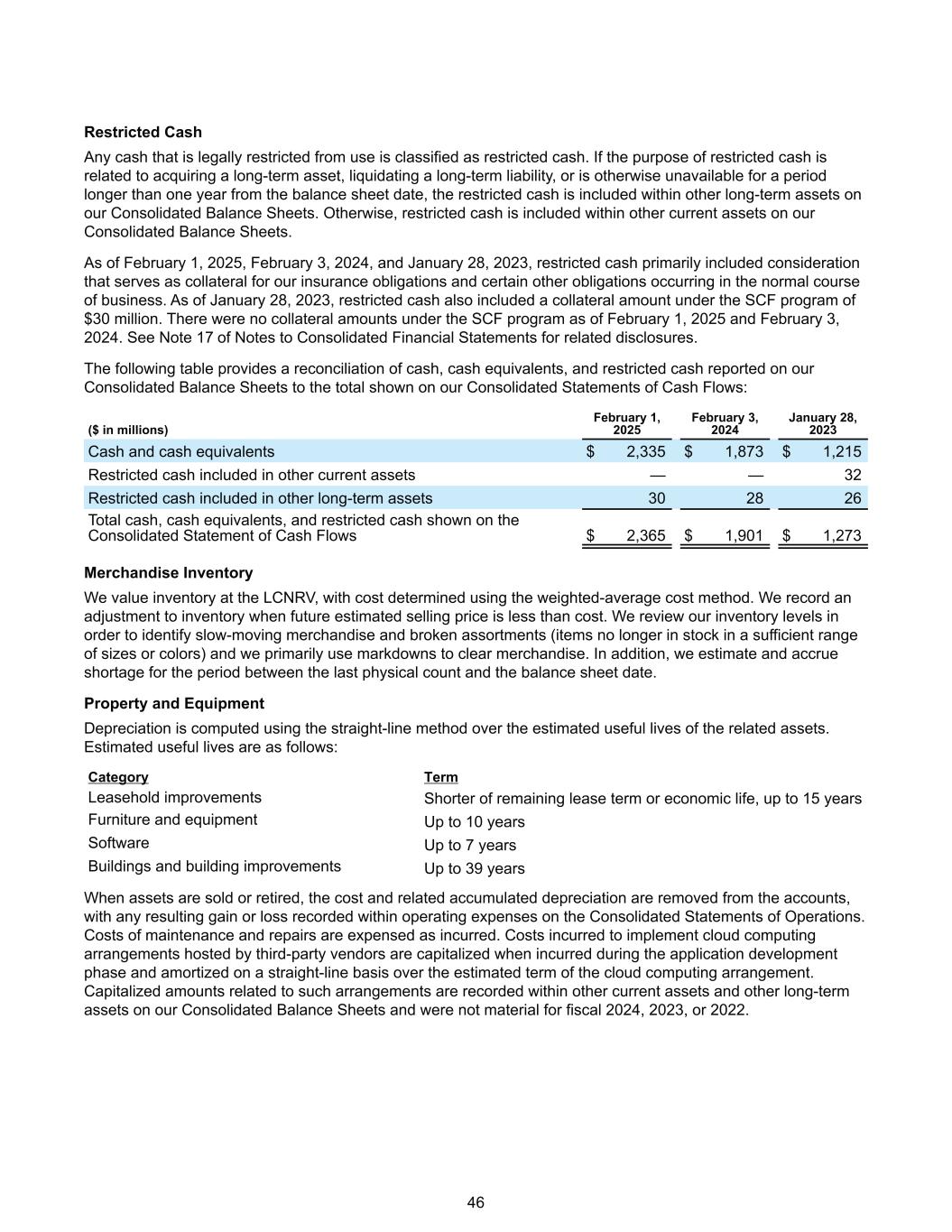 Restricted Cash Any cash that is legally restricted from use is classified as restricted cash. If the purpose of restricted cash is related to acquiring a long-term asset, liquidating a long-term liability, or is otherwise unavailable for a period longer than one year from the balance sheet date, the restricted cash is included within other long-term assets on our Consolidated Balance Sheets. Otherwise, restricted cash is included within other current assets on our Consolidated Balance Sheets. As of February 1, 2025, February 3, 2024, and January 28, 2023, restricted cash primarily included consideration that serves as collateral for our insurance obligations and certain other obligations occurring in the normal course of business. As of January 28, 2023, restricted cash also included a collateral amount under the SCF program of $30 million. There were no collateral amounts under the SCF program as of February 1, 2025 and February 3, 2024. See Note 17 of Notes to Consolidated Financial Statements for related disclosures. The following table provides a reconciliation of cash, cash equivalents, and restricted cash reported on our Consolidated Balance Sheets to the total shown on our Consolidated Statements of Cash Flows: ($ in millions) February 1, 2025 February 3, 2024 January 28, 2023 Cash and cash equivalents $ 2,335 $ 1,873 $ 1,215 Restricted cash included in other current assets — — 32 Restricted cash included in other long-term assets 30 28 26 Total cash, cash equivalents, and restricted cash shown on the Consolidated Statement of Cash Flows $ 2,365 $ 1,901 $ 1,273 Merchandise Inventory We value inventory at the LCNRV, with cost determined using the weighted-average cost method. We record an adjustment to inventory when future estimated selling price is less than cost. We review our inventory levels in order to identify slow-moving merchandise and broken assortments (items no longer in stock in a sufficient range of sizes or colors) and we primarily use markdowns to clear merchandise. In addition, we estimate and accrue shortage for the period between the last physical count and the balance sheet date. Property and Equipment Depreciation is computed using the straight-line method over the estimated useful lives of the related assets. Estimated useful lives are as follows: Category Term Leasehold improvements Shorter of remaining lease term or economic life, up to 15 years Furniture and equipment Up to 10 years Software Up to 7 years Buildings and building improvements Up to 39 years When assets are sold or retired, the cost and related accumulated depreciation are removed from the accounts, with any resulting gain or loss recorded within operating expenses on the Consolidated Statements of Operations. Costs of maintenance and repairs are expensed as incurred. Costs incurred to implement cloud computing arrangements hosted by third-party vendors are capitalized when incurred during the application development phase and amortized on a straight-line basis over the estimated term of the cloud computing arrangement. Capitalized amounts related to such arrangements are recorded within other current assets and other long-term assets on our Consolidated Balance Sheets and were not material for fiscal 2024, 2023, or 2022. 46