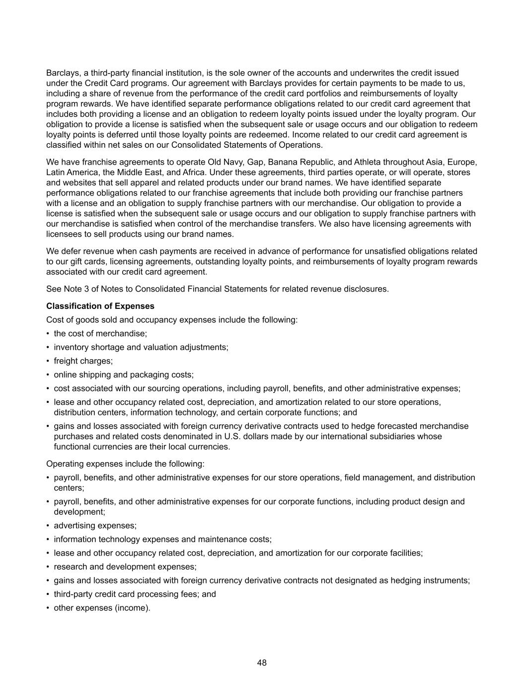 Barclays, a third-party financial institution, is the sole owner of the accounts and underwrites the credit issued under the Credit Card programs. Our agreement with Barclays provides for certain payments to be made to us, including a share of revenue from the performance of the credit card portfolios and reimbursements of loyalty program rewards. We have identified separate performance obligations related to our credit card agreement that includes both providing a license and an obligation to redeem loyalty points issued under the loyalty program. Our obligation to provide a license is satisfied when the subsequent sale or usage occurs and our obligation to redeem loyalty points is deferred until those loyalty points are redeemed. Income related to our credit card agreement is classified within net sales on our Consolidated Statements of Operations. We have franchise agreements to operate Old Navy, Gap, Banana Republic, and Athleta throughout Asia, Europe, Latin America, the Middle East, and Africa. Under these agreements, third parties operate, or will operate, stores and websites that sell apparel and related products under our brand names. We have identified separate performance obligations related to our franchise agreements that include both providing our franchise partners with a license and an obligation to supply franchise partners with our merchandise. Our obligation to provide a license is satisfied when the subsequent sale or usage occurs and our obligation to supply franchise partners with our merchandise is satisfied when control of the merchandise transfers. We also have licensing agreements with licensees to sell products using our brand names. We defer revenue when cash payments are received in advance of performance for unsatisfied obligations related to our gift cards, licensing agreements, outstanding loyalty points, and reimbursements of loyalty program rewards associated with our credit card agreement. See Note 3 of Notes to Consolidated Financial Statements for related revenue disclosures. Classification of Expenses Cost of goods sold and occupancy expenses include the following: • the cost of merchandise; • inventory shortage and valuation adjustments; • freight charges; • online shipping and packaging costs; • cost associated with our sourcing operations, including payroll, benefits, and other administrative expenses; • lease and other occupancy related cost, depreciation, and amortization related to our store operations, distribution centers, information technology, and certain corporate functions; and • gains and losses associated with foreign currency derivative contracts used to hedge forecasted merchandise purchases and related costs denominated in U.S. dollars made by our international subsidiaries whose functional currencies are their local currencies. Operating expenses include the following: • payroll, benefits, and other administrative expenses for our store operations, field management, and distribution centers; • payroll, benefits, and other administrative expenses for our corporate functions, including product design and development; • advertising expenses; • information technology expenses and maintenance costs; • lease and other occupancy related cost, depreciation, and amortization for our corporate facilities; • research and development expenses; • gains and losses associated with foreign currency derivative contracts not designated as hedging instruments; • third-party credit card processing fees; and • other expenses (income). 48