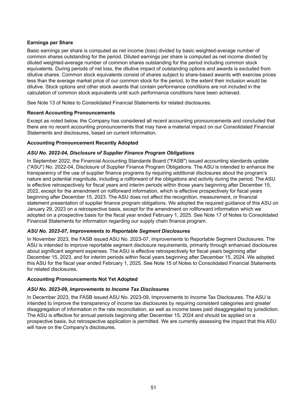 Earnings per Share Basic earnings per share is computed as net income (loss) divided by basic weighted-average number of common shares outstanding for the period. Diluted earnings per share is computed as net income divided by diluted weighted-average number of common shares outstanding for the period including common stock equivalents. During periods of net loss, the dilutive impact of outstanding options and awards is excluded from dilutive shares. Common stock equivalents consist of shares subject to share-based awards with exercise prices less than the average market price of our common stock for the period, to the extent their inclusion would be dilutive. Stock options and other stock awards that contain performance conditions are not included in the calculation of common stock equivalents until such performance conditions have been achieved. See Note 13 of Notes to Consolidated Financial Statements for related disclosures. Recent Accounting Pronouncements Except as noted below, the Company has considered all recent accounting pronouncements and concluded that there are no recent accounting pronouncements that may have a material impact on our Consolidated Financial Statements and disclosures, based on current information. Accounting Pronouncement Recently Adopted ASU No. 2022-04, Disclosure of Supplier Finance Program Obligations In September 2022, the Financial Accounting Standards Board ("FASB") issued accounting standards update ("ASU") No. 2022-04, Disclosure of Supplier Finance Program Obligations. The ASU is intended to enhance the transparency of the use of supplier finance programs by requiring additional disclosures about the program’s nature and potential magnitude, including a rollforward of the obligations and activity during the period. The ASU is effective retrospectively for fiscal years and interim periods within those years beginning after December 15, 2022, except for the amendment on rollforward information, which is effective prospectively for fiscal years beginning after December 15, 2023. The ASU does not affect the recognition, measurement, or financial statement presentation of supplier finance program obligations. We adopted the required guidance of this ASU on January 29, 2023 on a retrospective basis, except for the amendment on rollforward information which we adopted on a prospective basis for the fiscal year ended February 1, 2025. See Note 17 of Notes to Consolidated Financial Statements for information regarding our supply chain finance program. ASU No. 2023-07, Improvements to Reportable Segment Disclosures In November 2023, the FASB issued ASU No. 2023-07, Improvements to Reportable Segment Disclosures. The ASU is intended to improve reportable segment disclosure requirements, primarily through enhanced disclosures about significant segment expenses. The ASU is effective retrospectively for fiscal years beginning after December 15, 2023, and for interim periods within fiscal years beginning after December 15, 2024. We adopted this ASU for the fiscal year ended February 1, 2025. See Note 15 of Notes to Consolidated Financial Statements for related disclosures. Accounting Pronouncements Not Yet Adopted ASU No. 2023-09, Improvements to Income Tax Disclosures In December 2023, the FASB issued ASU No. 2023-09, Improvements to Income Tax Disclosures. The ASU is intended to improve the transparency of income tax disclosures by requiring consistent categories and greater disaggregation of information in the rate reconciliation, as well as income taxes paid disaggregated by jurisdiction. The ASU is effective for annual periods beginning after December 15, 2024 and should be applied on a prospective basis, but retrospective application is permitted. We are currently assessing the impact that this ASU will have on the Company's disclosures. 51