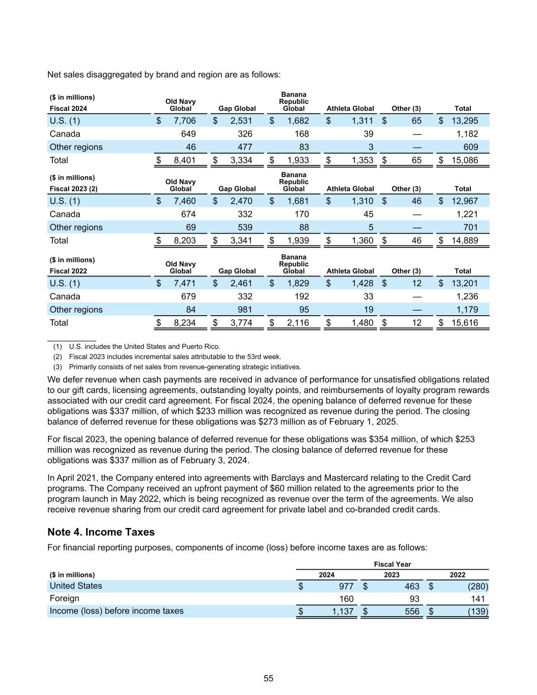 Net sales disaggregated by brand and region are as follows: ($ in millions) Old Navy Global Gap Global Banana Republic Global Athleta Global Other (3) TotalFiscal 2024 U.S. (1) $ 7,706 $ 2,531 $ 1,682 $ 1,311 $ 65 $ 13,295 Canada 649 326 168 39 — 1,182 Other regions 46 477 83 3 — 609 Total $ 8,401 $ 3,334 $ 1,933 $ 1,353 $ 65 $ 15,086 ($ in millions) Old Navy Global Gap Global Banana Republic Global Athleta Global Other (3) TotalFiscal 2023 (2) U.S. (1) $ 7,460 $ 2,470 $ 1,681 $ 1,310 $ 46 $ 12,967 Canada 674 332 170 45 — 1,221 Other regions 69 539 88 5 — 701 Total $ 8,203 $ 3,341 $ 1,939 $ 1,360 $ 46 $ 14,889 ($ in millions) Old Navy Global Gap Global Banana Republic Global Athleta Global Other (3) TotalFiscal 2022 U.S. (1) $ 7,471 $ 2,461 $ 1,829 $ 1,428 $ 12 $ 13,201 Canada 679 332 192 33 — 1,236 Other regions 84 981 95 19 — 1,179 Total $ 8,234 $ 3,774 $ 2,116 $ 1,480 $ 12 $ 15,616 __________ (1) U.S. includes the United States and Puerto Rico. (2) Fiscal 2023 includes incremental sales attributable to the 53rd week. (3) Primarily consists of net sales from revenue-generating strategic initiatives. We defer revenue when cash payments are received in advance of performance for unsatisfied obligations related to our gift cards, licensing agreements, outstanding loyalty points, and reimbursements of loyalty program rewards associated with our credit card agreement. For fiscal 2024, the opening balance of deferred revenue for these obligations was $337 million, of which $233 million was recognized as revenue during the period. The closing balance of deferred revenue for these obligations was $273 million as of February 1, 2025. For fiscal 2023, the opening balance of deferred revenue for these obligations was $354 million, of which $253 million was recognized as revenue during the period. The closing balance of deferred revenue for these obligations was $337 million as of February 3, 2024. In April 2021, the Company entered into agreements with Barclays and Mastercard relating to the Credit Card programs. The Company received an upfront payment of $60 million related to the agreements prior to the program launch in May 2022, which is being recognized as revenue over the term of the agreements. We also receive revenue sharing from our credit card agreement for private label and co-branded credit cards. Note 4. Income Taxes For financial reporting purposes, components of income (loss) before income taxes are as follows: Fiscal Year ($ in millions) 2024 2023 2022 United States $ 977 $ 463 $ (280) Foreign 160 93 141 Income (loss) before income taxes $ 1,137 $ 556 $ (139) 55