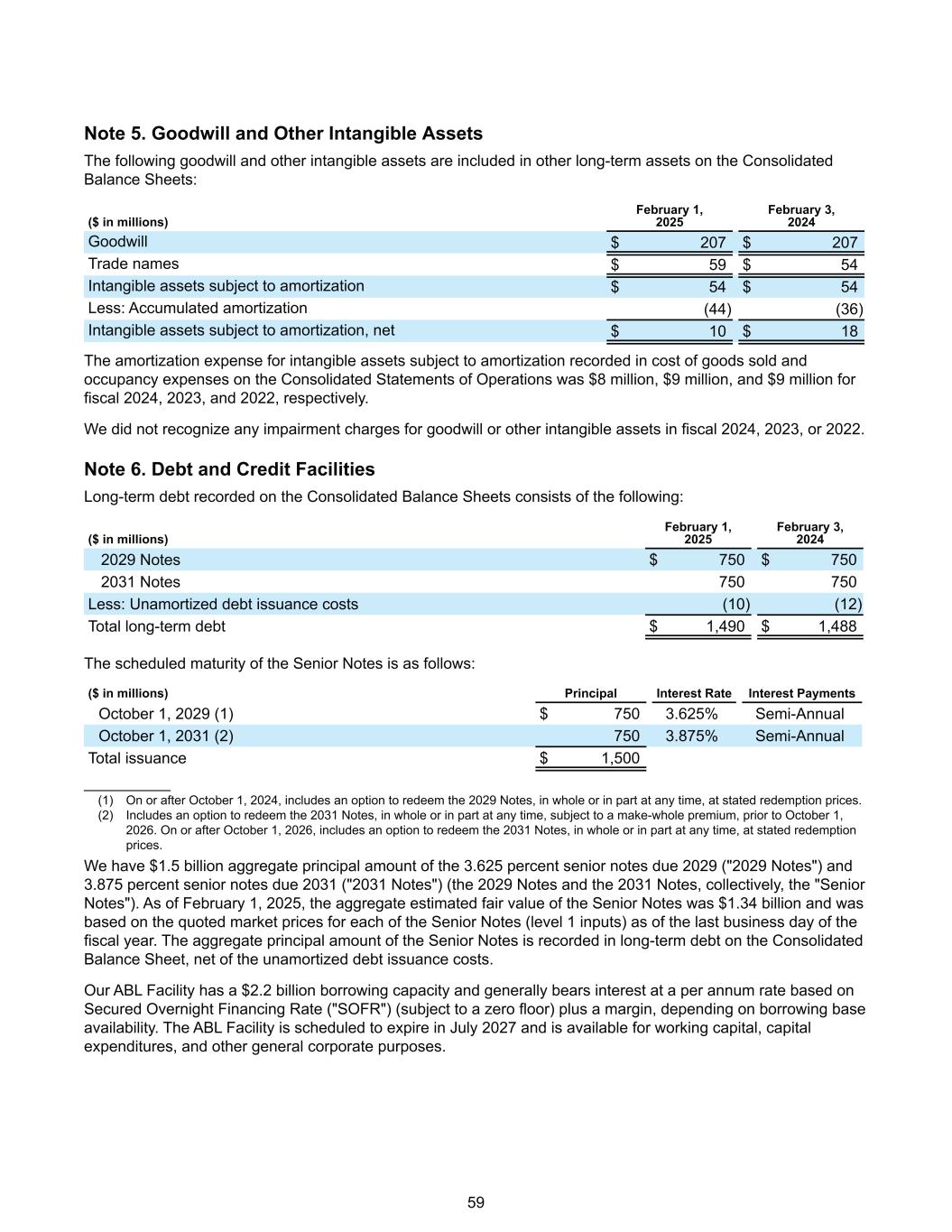 Note 5. Goodwill and Other Intangible Assets The following goodwill and other intangible assets are included in other long-term assets on the Consolidated Balance Sheets: ($ in millions) February 1, 2025 February 3, 2024 Goodwill $ 207 $ 207 Trade names $ 59 $ 54 Intangible assets subject to amortization $ 54 $ 54 Less: Accumulated amortization (44) (36) Intangible assets subject to amortization, net $ 10 $ 18 The amortization expense for intangible assets subject to amortization recorded in cost of goods sold and occupancy expenses on the Consolidated Statements of Operations was $8 million, $9 million, and $9 million for fiscal 2024, 2023, and 2022, respectively. We did not recognize any impairment charges for goodwill or other intangible assets in fiscal 2024, 2023, or 2022. Note 6. Debt and Credit Facilities Long-term debt recorded on the Consolidated Balance Sheets consists of the following: ($ in millions) February 1, 2025 February 3, 2024 2029 Notes $ 750 $ 750 2031 Notes 750 750 Less: Unamortized debt issuance costs (10) (12) Total long-term debt $ 1,490 $ 1,488 The scheduled maturity of the Senior Notes is as follows: ($ in millions) Principal Interest Rate Interest Payments October 1, 2029 (1) $ 750 3.625% Semi-Annual October 1, 2031 (2) 750 3.875% Semi-Annual Total issuance $ 1,500 __________ (1) On or after October 1, 2024, includes an option to redeem the 2029 Notes, in whole or in part at any time, at stated redemption prices. (2) Includes an option to redeem the 2031 Notes, in whole or in part at any time, subject to a make-whole premium, prior to October 1, 2026. On or after October 1, 2026, includes an option to redeem the 2031 Notes, in whole or in part at any time, at stated redemption prices. We have $1.5 billion aggregate principal amount of the 3.625 percent senior notes due 2029 ("2029 Notes") and 3.875 percent senior notes due 2031 ("2031 Notes") (the 2029 Notes and the 2031 Notes, collectively, the "Senior Notes"). As of February 1, 2025, the aggregate estimated fair value of the Senior Notes was $1.34 billion and was based on the quoted market prices for each of the Senior Notes (level 1 inputs) as of the last business day of the fiscal year. The aggregate principal amount of the Senior Notes is recorded in long-term debt on the Consolidated Balance Sheet, net of the unamortized debt issuance costs. Our ABL Facility has a $2.2 billion borrowing capacity and generally bears interest at a per annum rate based on Secured Overnight Financing Rate ("SOFR") (subject to a zero floor) plus a margin, depending on borrowing base availability. The ABL Facility is scheduled to expire in July 2027 and is available for working capital, capital expenditures, and other general corporate purposes. 59