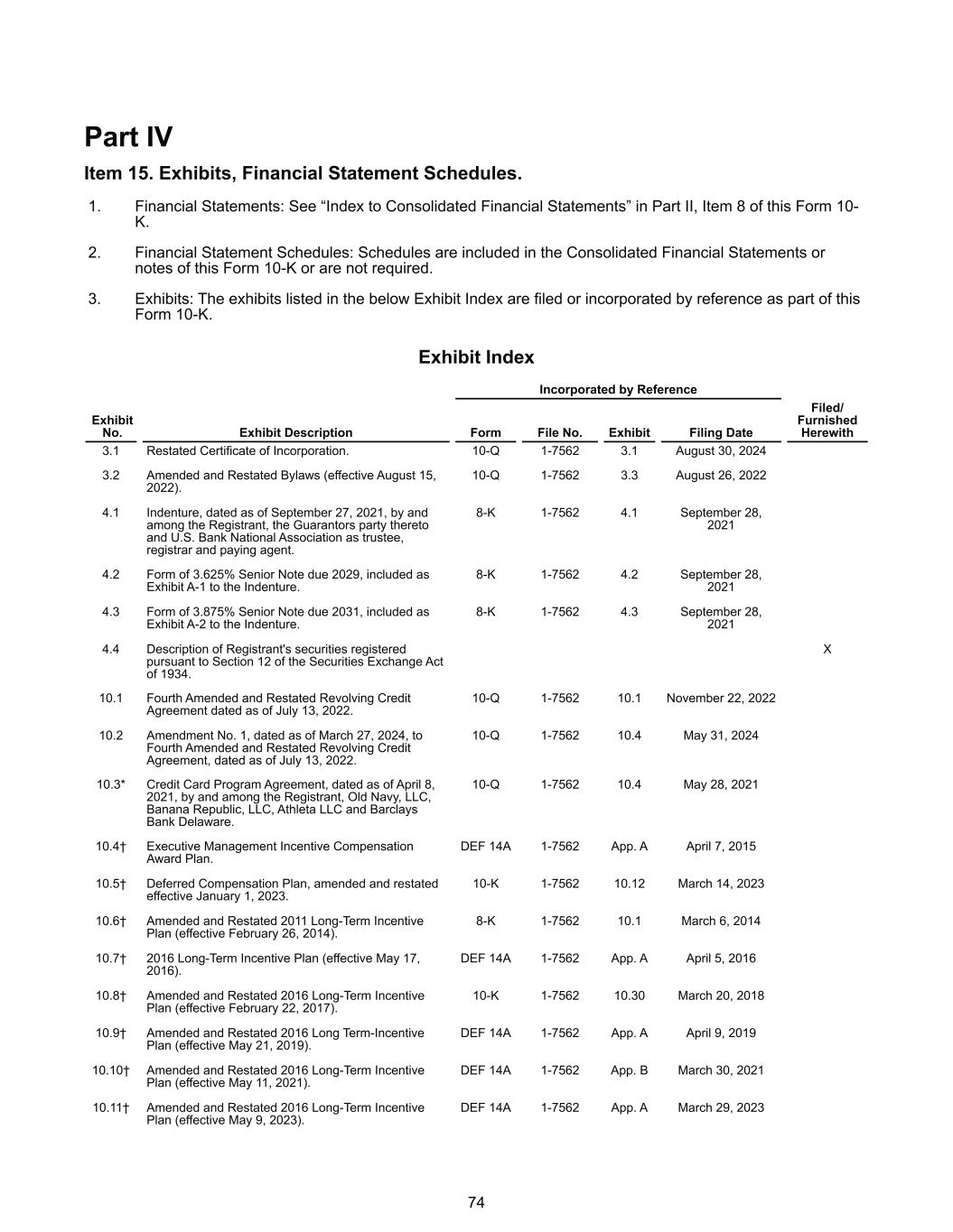 Part IV Item 15. Exhibits, Financial Statement Schedules. 1. Financial Statements: See “Index to Consolidated Financial Statements” in Part II, Item 8 of this Form 10- K. 2. Financial Statement Schedules: Schedules are included in the Consolidated Financial Statements or notes of this Form 10-K or are not required. 3. Exhibits: The exhibits listed in the below Exhibit Index are filed or incorporated by reference as part of this Form 10-K. Exhibit Index Incorporated by Reference Exhibit No. Exhibit Description Form File No. Exhibit Filing Date Filed/ Furnished Herewith 3.1 Restated Certificate of Incorporation. 10-Q 1-7562 3.1 August 30, 2024 3.2 Amended and Restated Bylaws (effective August 15, 2022). 10-Q 1-7562 3.3 August 26, 2022 4.1 Indenture, dated as of September 27, 2021, by and among the Registrant, the Guarantors party thereto and U.S. Bank National Association as trustee, registrar and paying agent. 8-K 1-7562 4.1 September 28, 2021 4.2 Form of 3.625% Senior Note due 2029, included as Exhibit A-1 to the Indenture. 8-K 1-7562 4.2 September 28, 2021 4.3 Form of 3.875% Senior Note due 2031, included as Exhibit A-2 to the Indenture. 8-K 1-7562 4.3 September 28, 2021 4.4 Description of Registrant's securities registered pursuant to Section 12 of the Securities Exchange Act of 1934. X 10.1 Fourth Amended and Restated Revolving Credit Agreement dated as of July 13, 2022. 10-Q 1-7562 10.1 November 22, 2022 10.2 Amendment No. 1, dated as of March 27, 2024, to Fourth Amended and Restated Revolving Credit Agreement, dated as of July 13, 2022. 10-Q 1-7562 10.4 May 31, 2024 10.3* Credit Card Program Agreement, dated as of April 8, 2021, by and among the Registrant, Old Navy, LLC, Banana Republic, LLC, Athleta LLC and Barclays Bank Delaware. 10-Q 1-7562 10.4 May 28, 2021 10.4† Executive Management Incentive Compensation Award Plan. DEF 14A 1-7562 App. A April 7, 2015 10.5† Deferred Compensation Plan, amended and restated effective January 1, 2023. 10-K 1-7562 10.12 March 14, 2023 10.6† Amended and Restated 2011 Long-Term Incentive Plan (effective February 26, 2014). 8-K 1-7562 10.1 March 6, 2014 10.7† 2016 Long-Term Incentive Plan (effective May 17, 2016). DEF 14A 1-7562 App. A April 5, 2016 10.8† Amended and Restated 2016 Long-Term Incentive Plan (effective February 22, 2017). 10-K 1-7562 10.30 March 20, 2018 10.9† Amended and Restated 2016 Long Term-Incentive Plan (effective May 21, 2019). DEF 14A 1-7562 App. A April 9, 2019 10.10† Amended and Restated 2016 Long-Term Incentive Plan (effective May 11, 2021). DEF 14A 1-7562 App. B March 30, 2021 10.11† Amended and Restated 2016 Long-Term Incentive Plan (effective May 9, 2023). DEF 14A 1-7562 App. A March 29, 2023 74