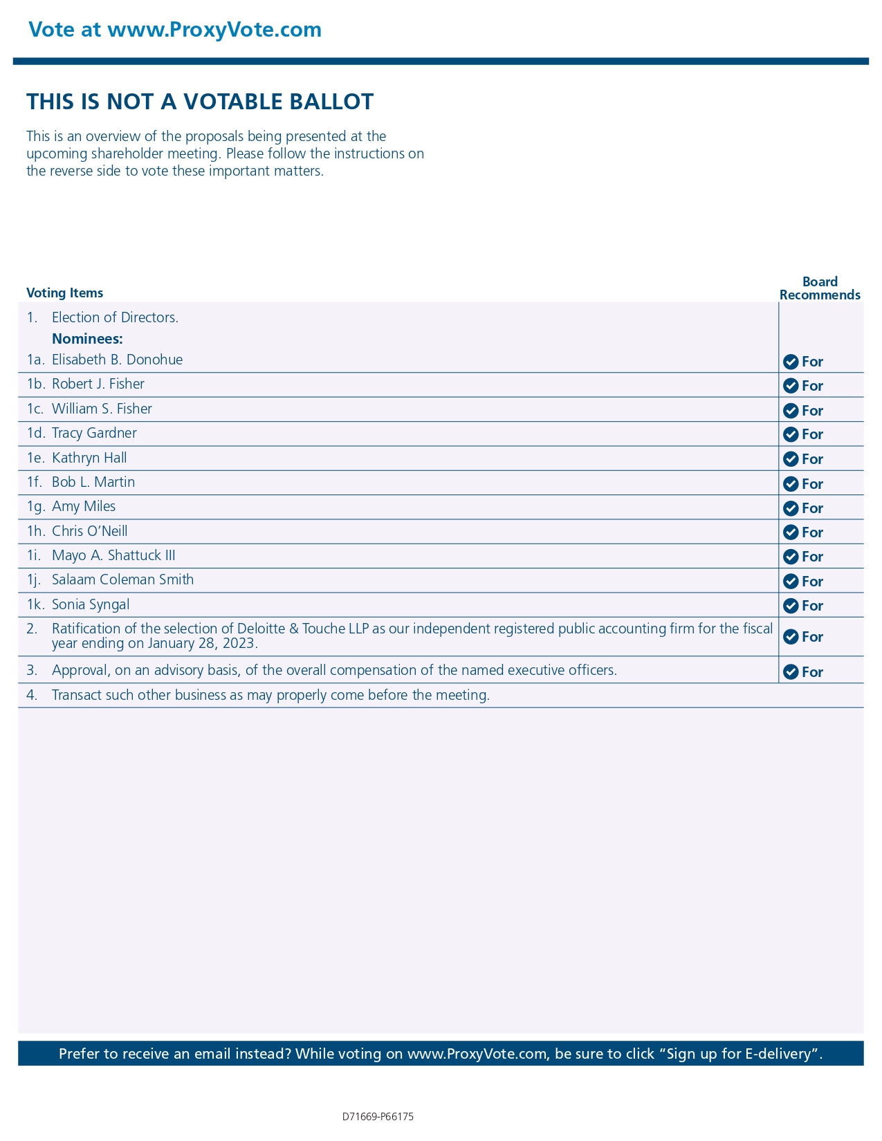 Vote at www.ProxyVote.com THIS IS NOT A VOTABLE BALLOT This is an overview of the proposals being presented at the upcoming shareholder meeting. Please follow the instructions on the reverse side to vote these important matters. Voting Items Board Recommends 1. Election of Directors. Nominees: 1a. Elisabeth B. Donohue For 1b. Robert J. Fisher For 1c. William S. Fisher For 1d. Tracy Gardner For 1e. Kathryn Hall For 1f. Bob L. Martin For 1g. Amy Miles For 1h. Chris O’Neill For 1i. Mayo A. Shattuck III For 1j. Salaam Coleman Smith For 1k. Sonia Syngal For 2. Ratification of the selection of Deloitte & Touche LLP as our independent registered public accounting firm for the fiscal year ending on January 28, 2023. For 3. Approval, on an advisory basis, of the overall compensation of the named executive officers. For 4. Transact such other business as may properly come before the meeting. Prefer to receive an email instead? While voting on www.ProxyVote.com, be sure to click “Sign up for E-delivery”. D71669-P66175