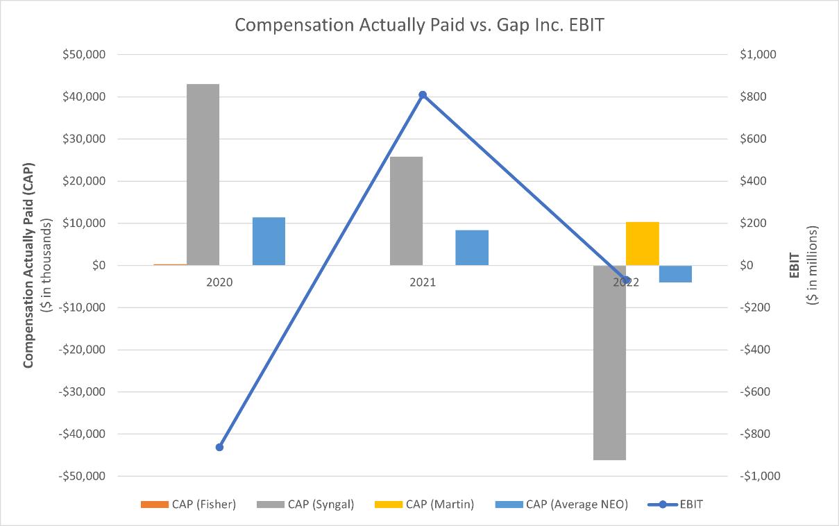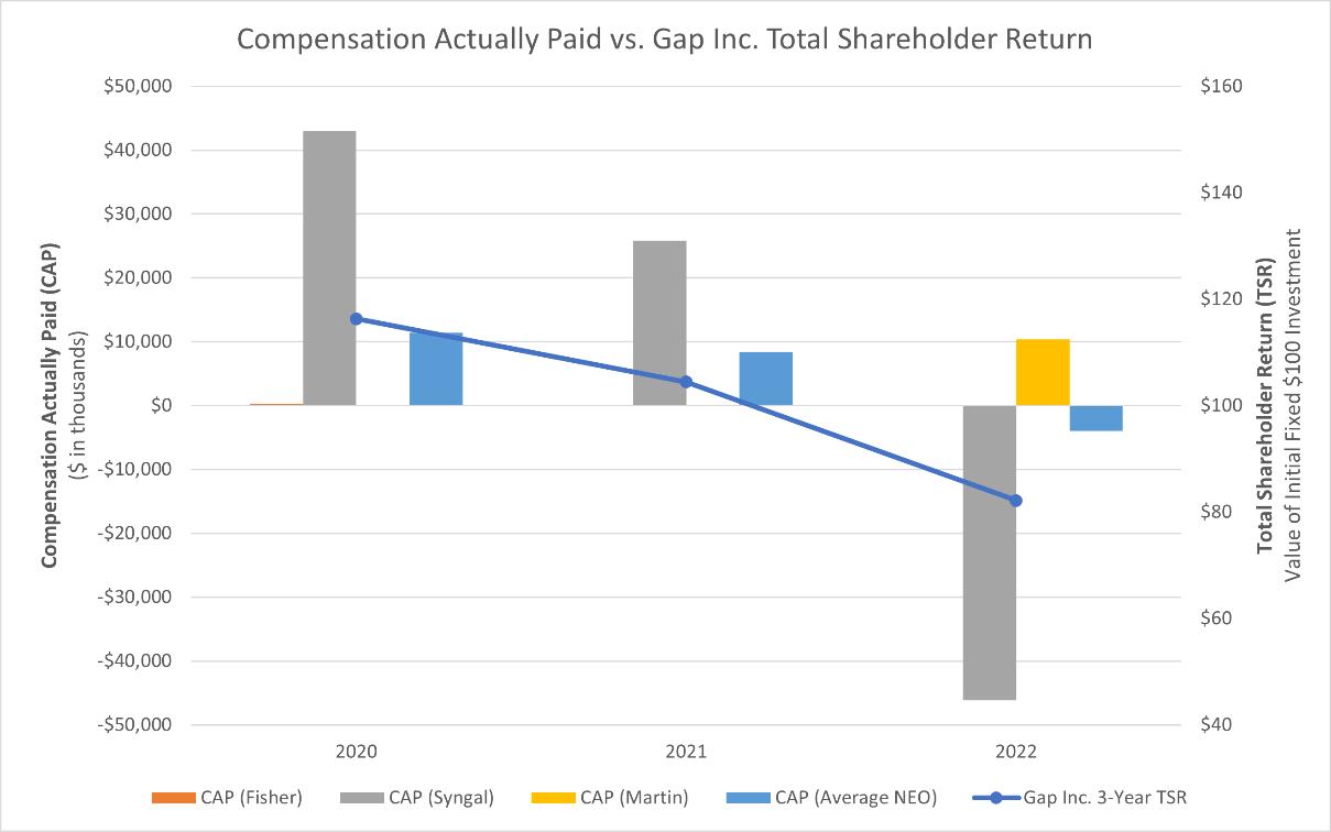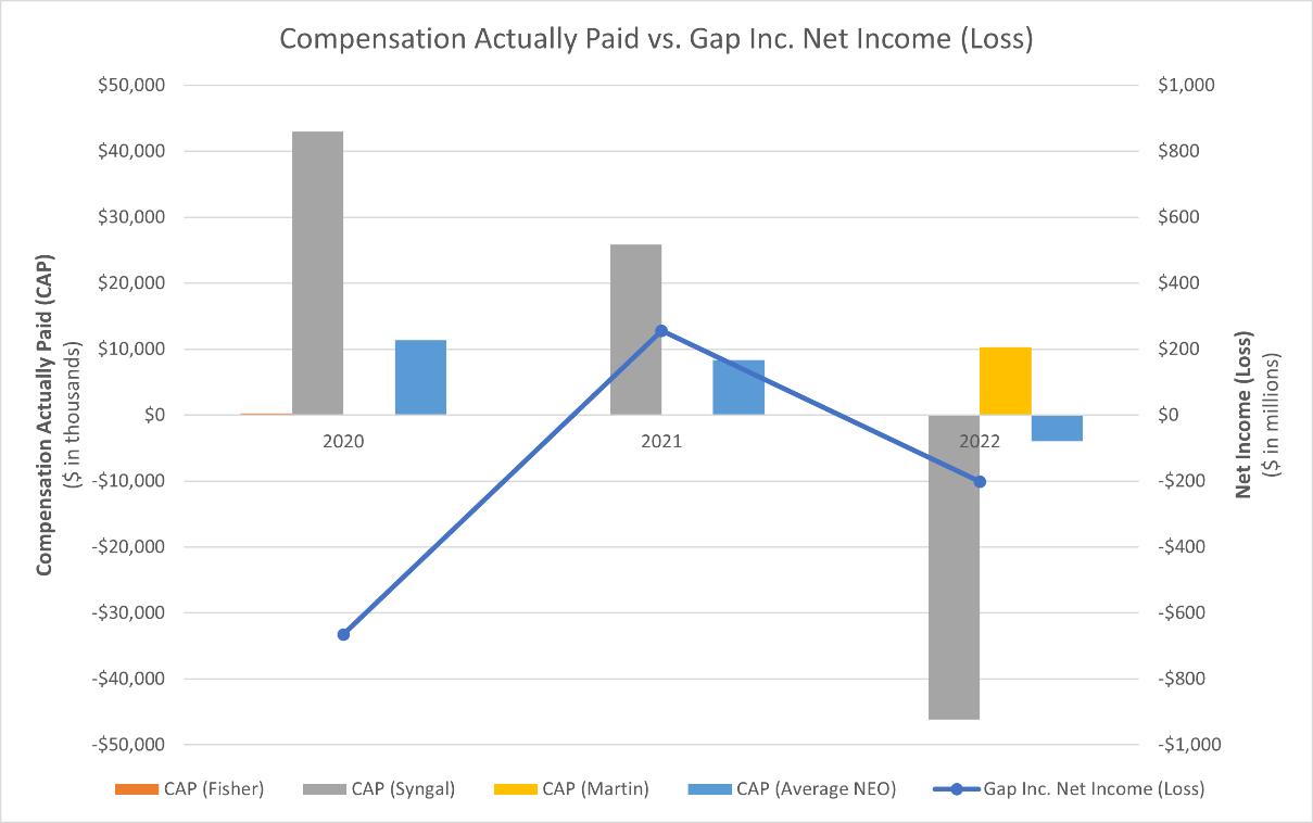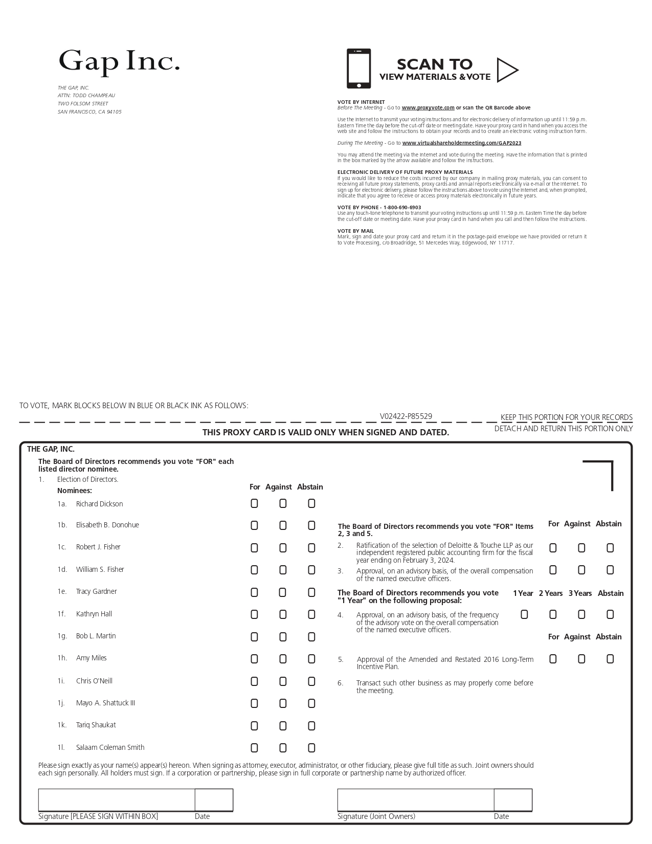 Gap Inc. THE GAP, INC. ATTN: TODD CHAMPEAU TWO FOLSOM STREET SAN FRANCISCO, CA 94105 SCAN TO VIEW MATERIALS & VOTE VOTE BY INTERNET Before The Meeting - Go to www.proxyvote.com or scan the QR Barcode above Use the Internet to transmit your voting instructions and for electronic delivery of information up until 11:59 p.m. Eastern Time the day before the cut-off date or meeting date. Have your proxy card in hand when you access the web site and follow the instructions to obtain your records and to create an electronic voting instruction form. During The Meeting - Go to www.virtualshareholdermeeting.com/GAP2023 You may attend the meeting via the Internet and vote during the meeting. Have the information that is printed in the box marked by the arrow available and follow the instructions. ELECTRONIC DELIVERY OF FUTURE PROXY MATERIALS If you would like to reduce the costs incurred by our company in mailing proxy materials, you can consent to receiving all future proxy statements, proxy cards and annual reports electronically via e-mail or the Internet. To sign up for electronic delivery, please follow the instructions above to vote using the Internet and, when prompted, indicate that you agree to receive or access proxy materials electronically in future years. VOTE BY PHONE - 1-800-690-6903 Use any touch-tone telephone to transmit your voting instructions up until 11:59 p.m. Eastern Time the day before the cut-off date or meeting date. Have your proxy card in hand when you call and then follow the instructions. VOTE BY MAIL Mark, sign and date your proxy card and return it in the postage-paid envelope we have provided or return it to Vote Processing, c/o Broadridge, 51 Mercedes Way, Edgewood, NY 11717. TO VOTE, MARK BLOCKS BELOW IN BLUE OR BLACK INK AS FOLLOWS: V02422-P85529 KEEP THIS PORTION FOR YOUR RECORDS THIS PROXY CARD IS VALID ONLY WHEN SIGNED AND DATED. DETACH AND RETURN THIS PORTION ONLY THE GAP, INC. The Board of Directors recommends you vote "FOR" each listed director nominee. 1. Election of Directors Nominees: For Against Abstain 1a. Richard Dickson 1b. Elisabeth B. Donohue 1c. Robert J. Fisher 1d. William S. Fisher 1e. Tracy Gardner 1f. Kathryn Hall 1g. Bob L. Martin 1h. Amy Miles 1i. Chris O'Neill 1j. Mayo A. Shattuck III 1k. Tariq Shaukat 1l. Salaam Coleman Smith The Board of Directors recommends you vote "FOR" Items 2, 3 and 5. For Against Abstain 2. Ratification of the selection of Deloitte & Touche LLP as our independent registered public accounting firm for the fiscal year ending on February 3, 2024. 3. Approval, on an advisory basis, of the overall compensation of the named executive officers. The Board of Directors recommends you vote "1 Year" on the following proposal: 1 Year 2 Years 3 Years Abstain 4. Approval, on an advisory basis, of the frequency of the advisory vote on the overall compensation of the named executive officers. For Against Abstain 5. Approval of the Amended and Restated 2016 Long-Term Incentive Plan. 6. Transact such other business as may properly come before the meeting. Please sign exactly as your name(s) appear(s) hereon. When signing as attorney, executor, administrator, or other fiduciary, please give full title as such. Joint owners should each sign personally. All holders must sign. If a corporation or partnership, please sign in full corporate or partnership name by authorized officer. Signature [PLEASE SIGN WITHIN BOX] Date Signature (Joint Owners) Date