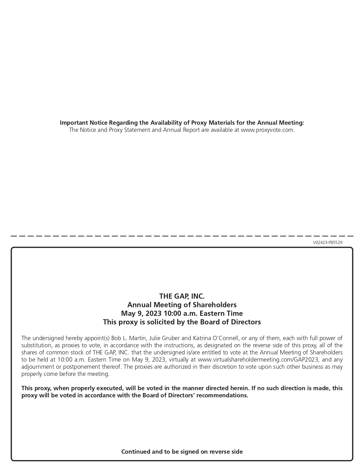 Important Notice Regarding the Availability of Proxy Materials for the Annual Meeting: The Notice and Proxy Statement and Annual Report are available at www.proxyvote.com. V02423-P85529 THE GAP, INC. Annual Meeting of Shareholders May 9, 2023 10:00 a.m. Eastern Time This proxy is solicited by the Board of Directors The undersigned hereby appoint(s) Bob L. Martin, Julie Gruber and Katrina O'Connell, or any of them, each with full power of substitution, as proxies to vote, in accordance with the instructions, as designated on the reverse side of this proxy, all of the shares of common stock of THE GAP, INC. that the undersigned is/are entitled to vote at the Annual Meeting of Shareholders to be held at 10:00 a.m. Eastern Time on May 9, 2023, virtually at www.virtualshareholdermeeting.com/GAP2023, and any adjournment or postponement thereof. The proxies are authorized in their discretion to vote upon such other business as may properly come before the meeting. This proxy, when properly executed, will be voted in the manner directed herein. If no such direction is made, this proxy will be voted in accordance with the Board of Directors' recommendations. Continued and to be signed on reverse side