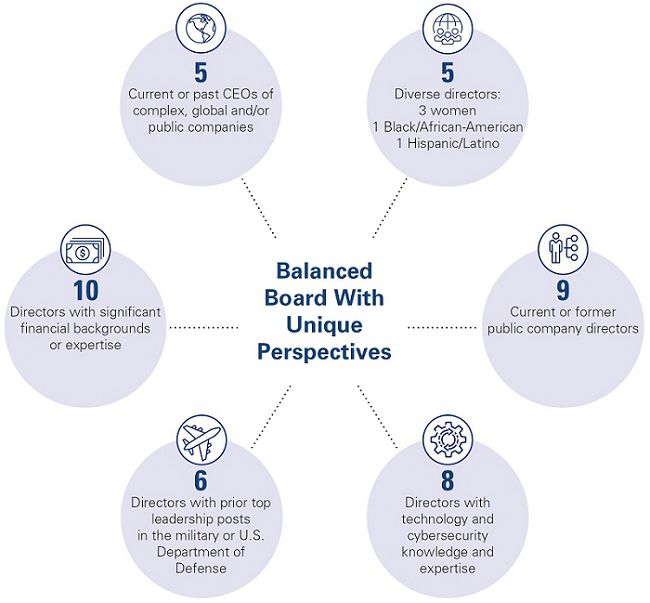 Your Board’s diverse directors bring a wealth of knowledge, judgment and wisdom gained through leadership roles in business, government and the military. The Board benefits from its years-long track record of deliberate and thoughtful refreshment. As a result of this process, your Board comprises well-qualified business leaders, aerospace and defense industry experts, and financial and strategic advisors.