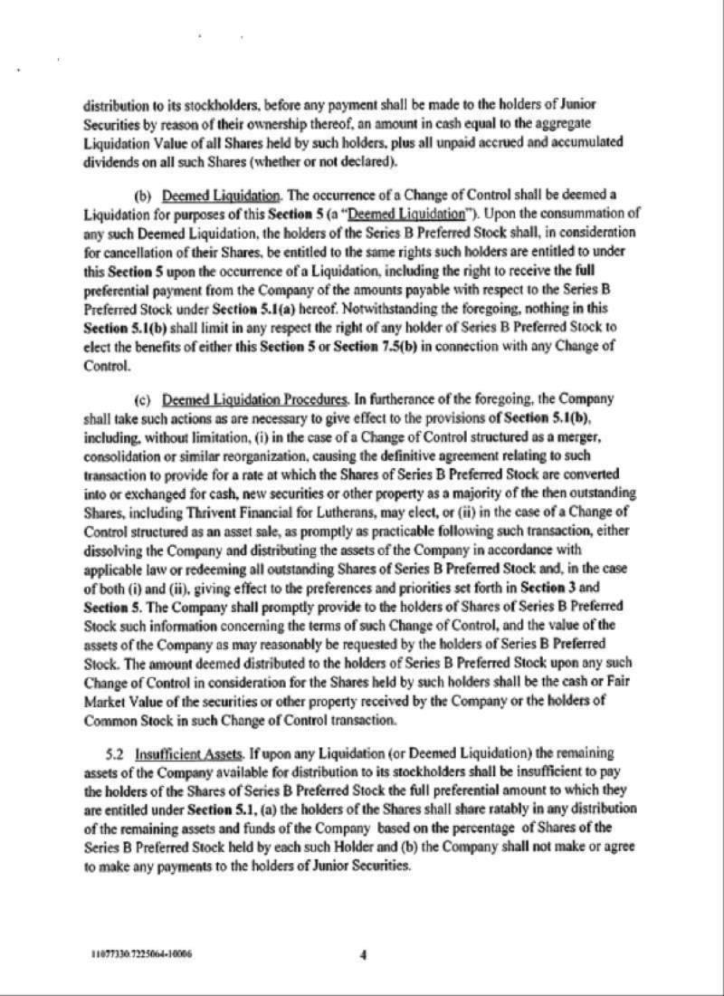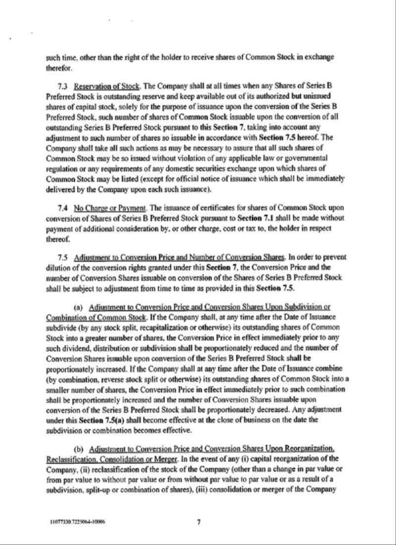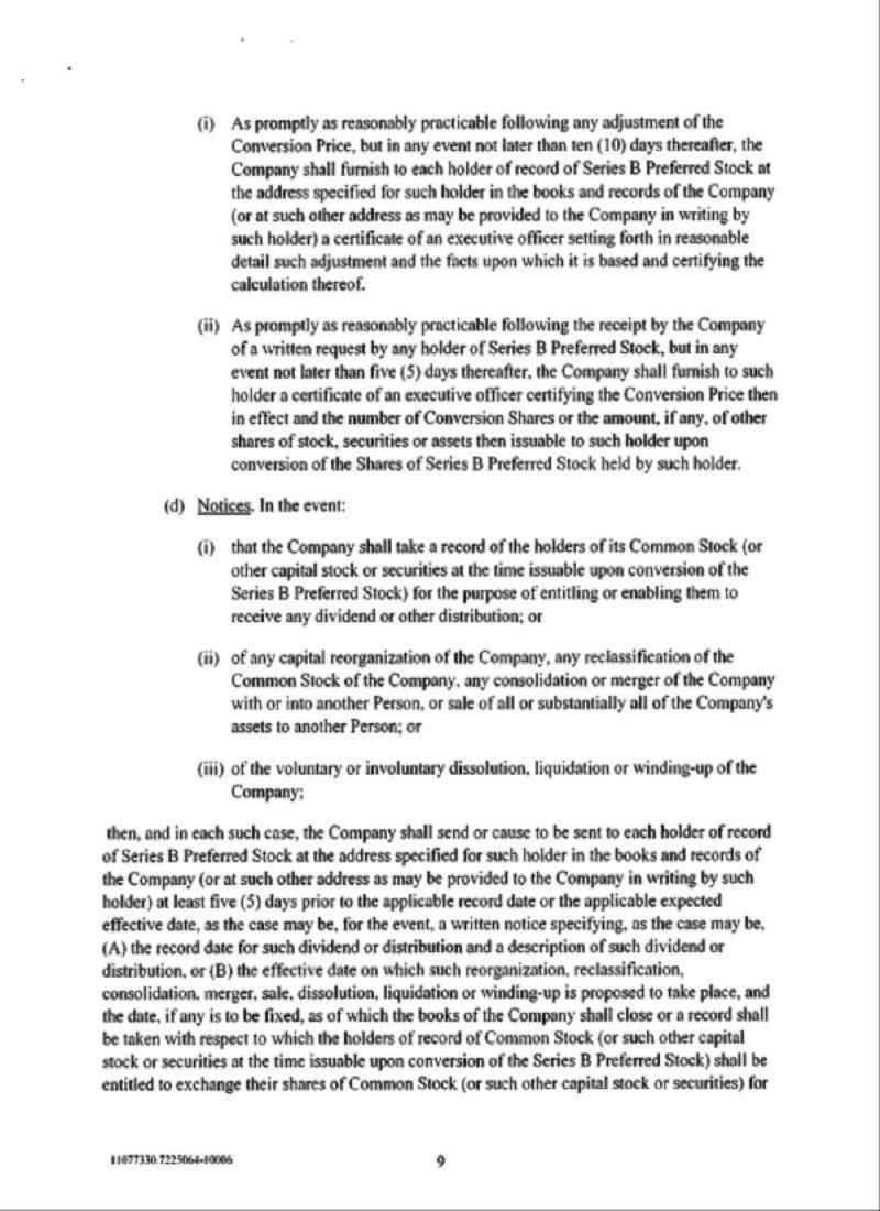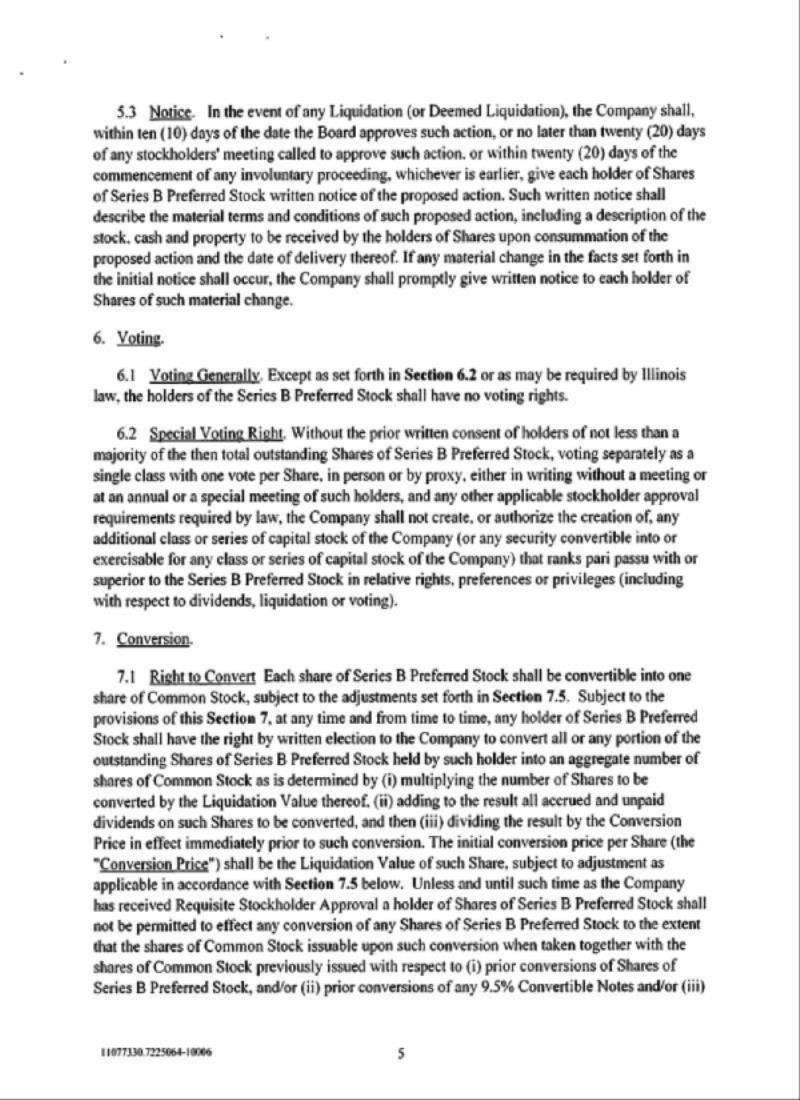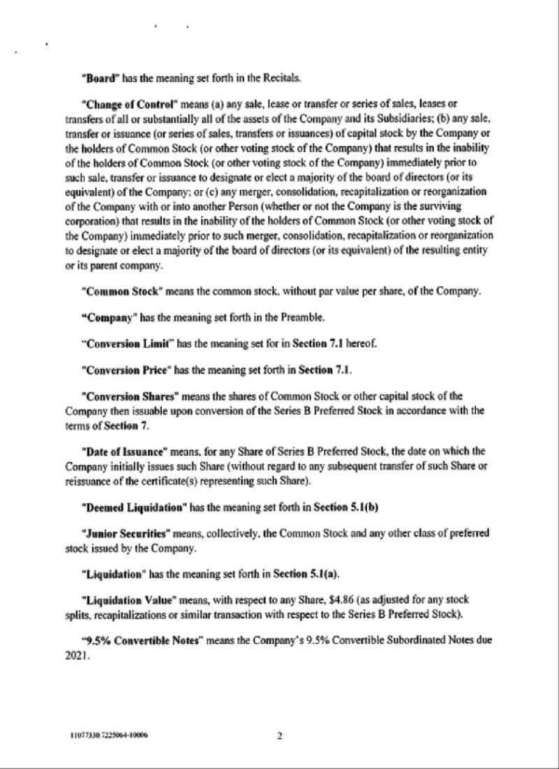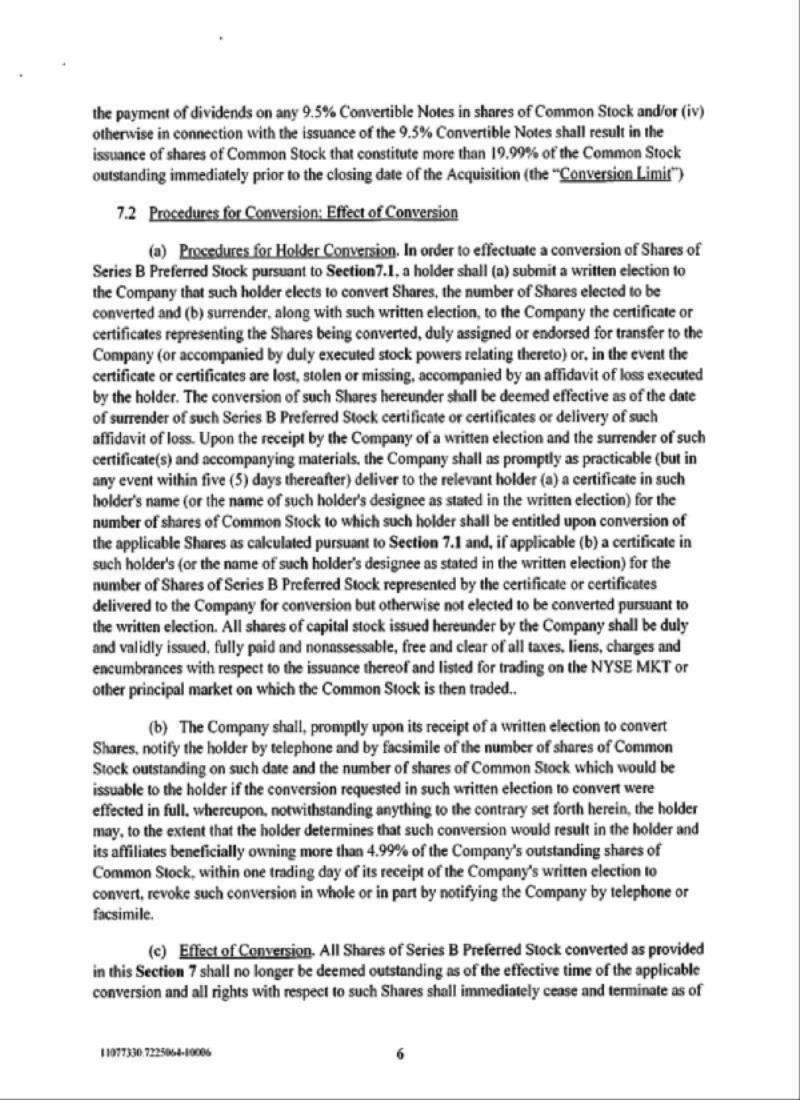Until such time as the stockholders of the Company approve the Preferred Conversion Proposal, the holders of Series B Preferred Stock may not convert any shares of Series B Preferred Stock into shares of common stock to the extent that such conversion, when taken together with (i) all prior conversions of Series B Preferred Stock into shares of common stock, (ii) all prior conversions of 9.5% Notes into shares of common stock, (iii) all prior issuances of common stock as interest payments on the 9.5% Notes and (iv) all other shares of common stock that were previously issued in connection with the issuance of the 9.5% Notes would constitute more than 19.99% of the Company’s outstanding common stock immediately prior to the Merger (the “Conversion Limit”). Until such time as the stockholders of the Company approve the Note Conversion Proposal, the holders of 9.5% Notes may not convert any 9.5% Notes into shares of common stock to the extent that such conversion, when taken together with (i) all prior conversions of Series B Preferred Stock into shares of common stock, (ii) all prior conversions of 9.5% Notes into shares of common stock, (iii) all prior issuances of common stock as interest payments on the 9.5% Notes and (iv) all other shares of common stock that were previously issued in connection with the issuance of the 9.5% Notes would exceed the Conversion Limit. Until such time as the stockholders of the Company approve the Note Conversion Proposal, the Company may not make any interest payment on the 9.5% Notes in shares of common stock to the extent that such issuance of common stock when taken together with (i) all prior conversions of Series B Preferred Stock into shares of common stock, (ii) all prior conversions of 9.5% Notes into shares of common stock (iii) all prior issuances of common stock as interest payments on the 9.5% Notes and (iv) all other shares of common stock that were previously issued in connection with the issuance of the 9.5% Notes would exceed the Conversion Limit.