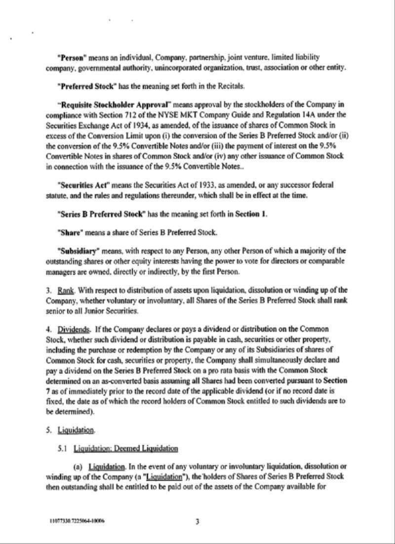 Pursuant to the rules of the NYSE MKT, the exchange on which the Company’s common stock is listed, the approval of the Preferred Conversion Proposal and the approval of the Note Conversion Proposal is required because the aggregate number of shares of common stock proposed to be issued by the Company in connection with (i) the conversion in full of the Series B Preferred Stock into shares of common stock, (ii) the conversion in full of the 9.5% Notes into shares of common stock and (iii) the payment of interest on the 9.5% Notes in shares of common stock constitutes more than 19.99% of the Company’s outstanding common stock prior to the Merger. Pursuant to the rules of the NYSE MKT, the approval of the 2013 Plan Amendment Proposal is also required.