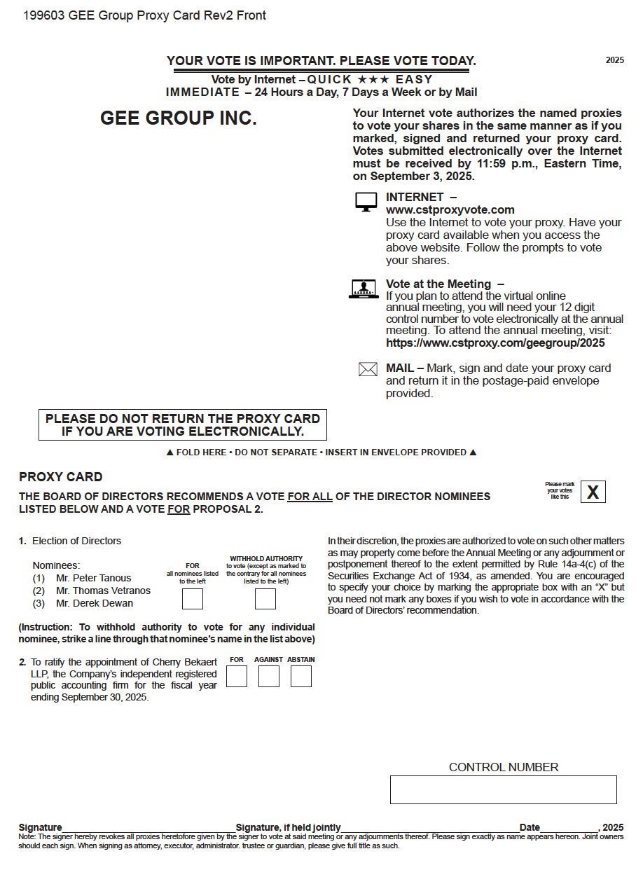 Notice is hereby given that the 2025 Annual Meeting of Shareholders (the “Annual Meeting”) of GEE Group Inc. (the “Company”), will be held at 9:00 a.m., Eastern Daylight Time (EDT) on September 4, 2025, in a virtual meeting format at https://www.cstproxy.com/geegroup/2025. Shareholders will NOT be able to attend the Annual Meeting in-person. The accompanying Proxy Statement includes instruction on how to access the virtual Annual Meeting and how to listen, vote, and submit questions from home or any remote location with Internet connectivity. At the Annual Meeting, the Company will consider and vote upon the following items: