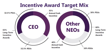 In awarding incentive compensation, the CNGC considers overall performance and results by reviewing both a balanced scorecard and individual results against pre-established goals and objectives as further described in our proxy statement. Following a determination of NEO’s total amount of incentive compensation, the amount is allocated among a pre-determined mix of long-term equity-based incentive awards and the short-term cash incentive award. The long-term awards are granted in the form of PSUs that vest following a three-year performance period (earned based on objective financial metrics) and RSUs that vest over three years.